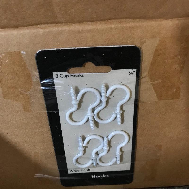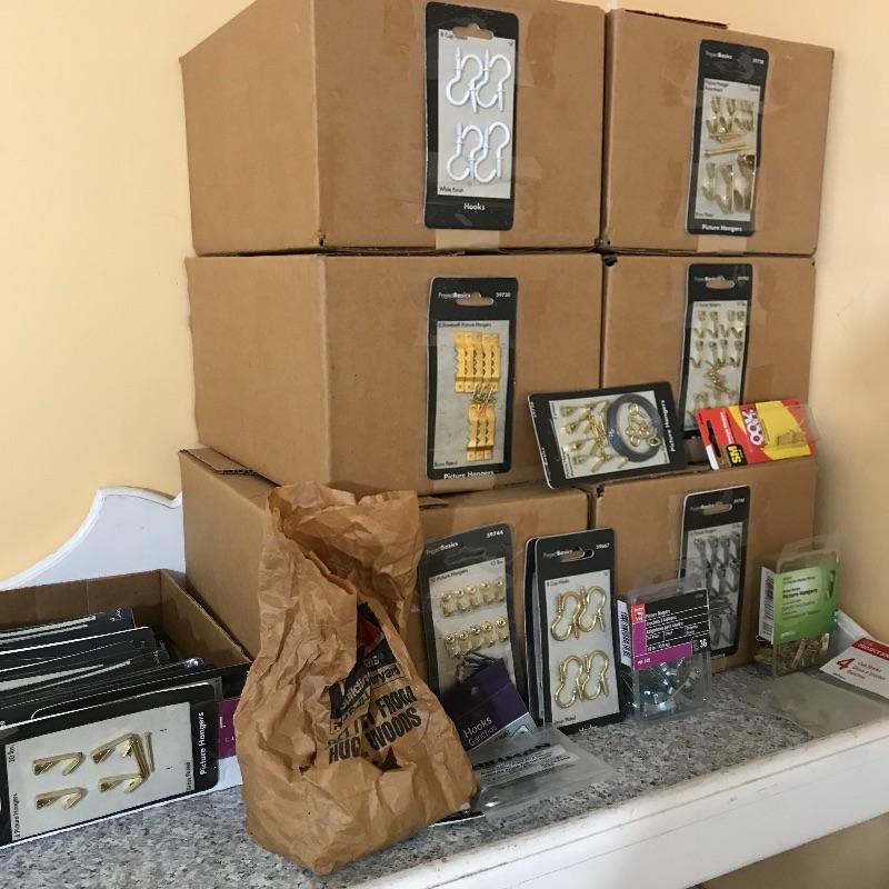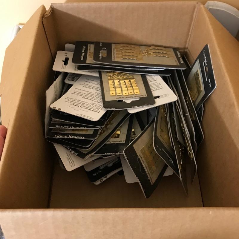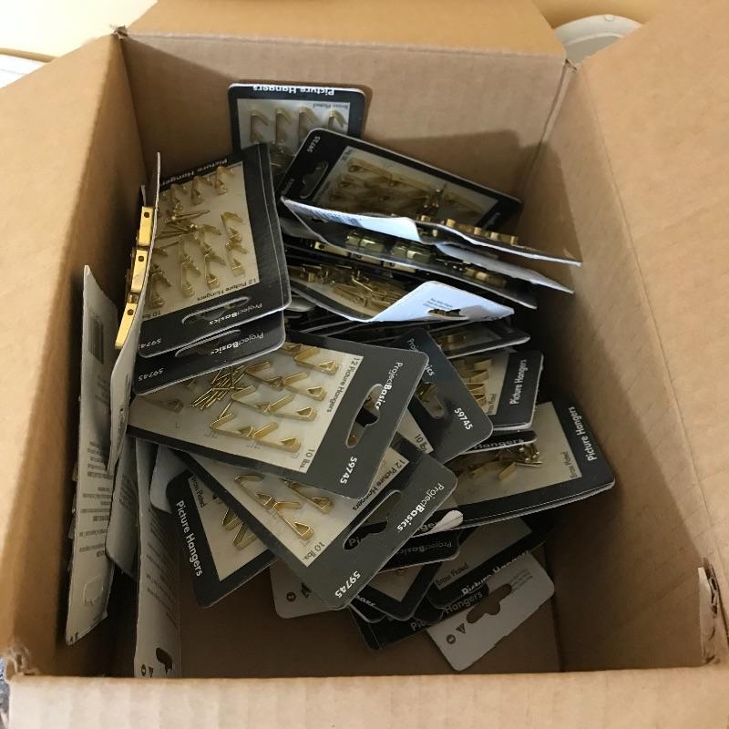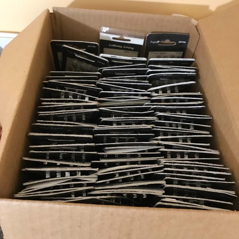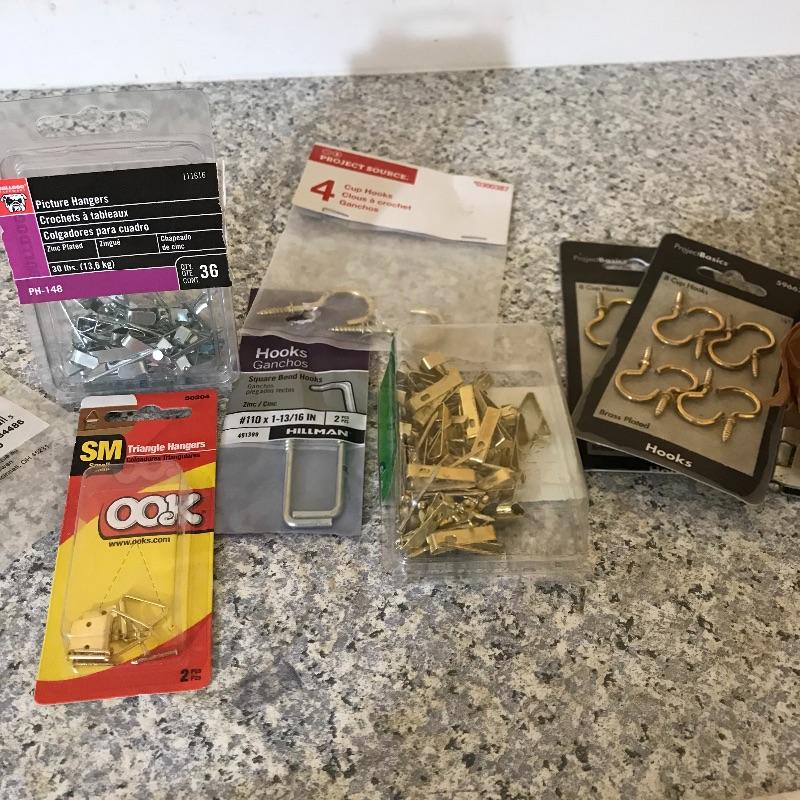 More than six boxes of metal wall hooks for hanging and crafting. Boxes are usually organized with sample on front of box. Boxes each measure 9” x 11.5” x 6.5”. Some extras are noted in photos. No shipping.