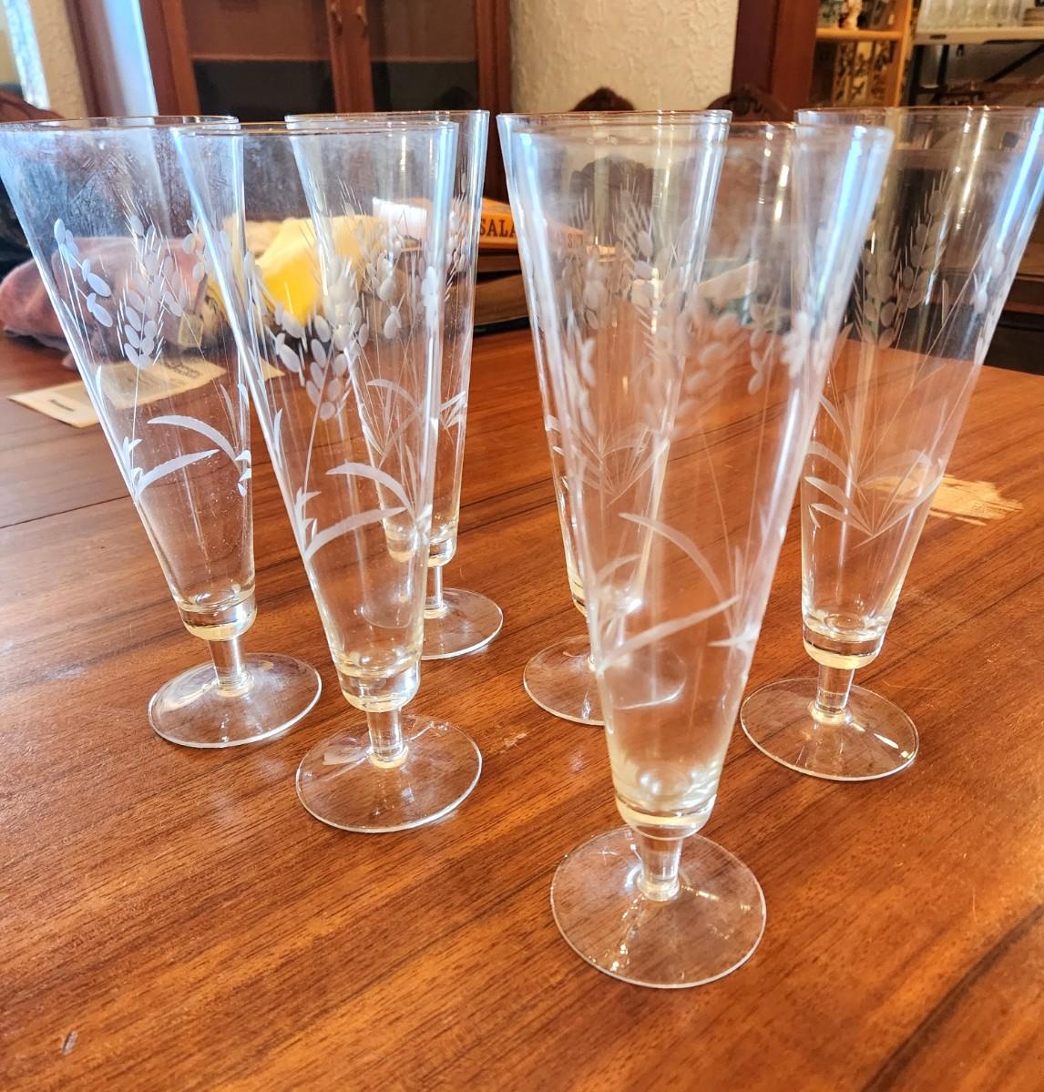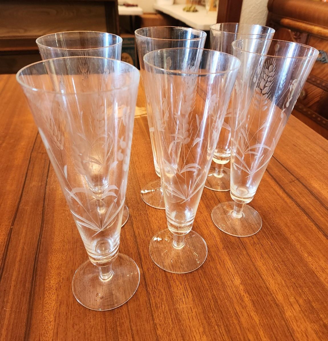 Nice lot of 6 vintage crystal Pilsner glasses - etched wheat design. All in good condition - 9" tall.