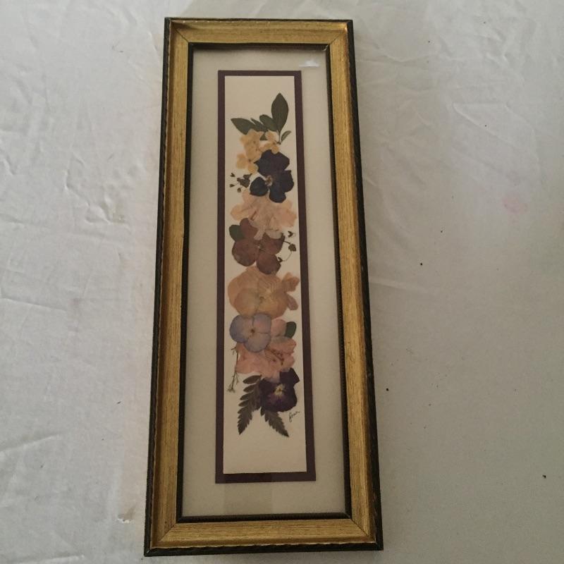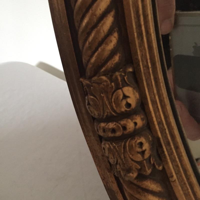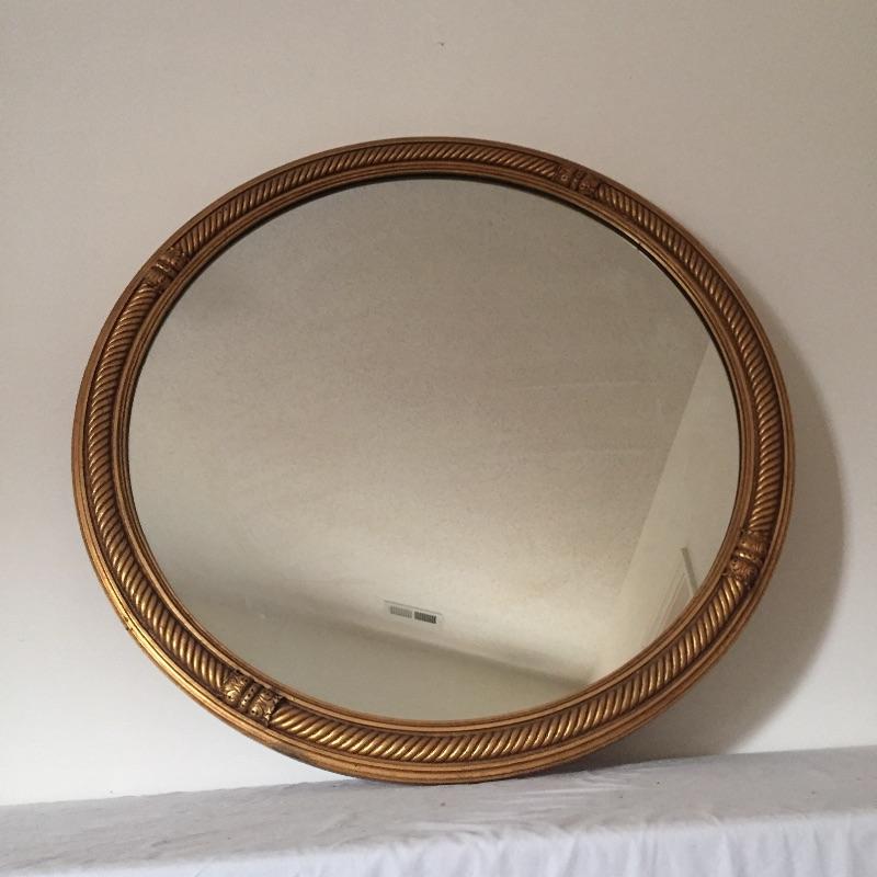 Beautiful large gold round mirror measures 32"d. Lot also has a metal lamp and framed artwork. Local Pickup Only