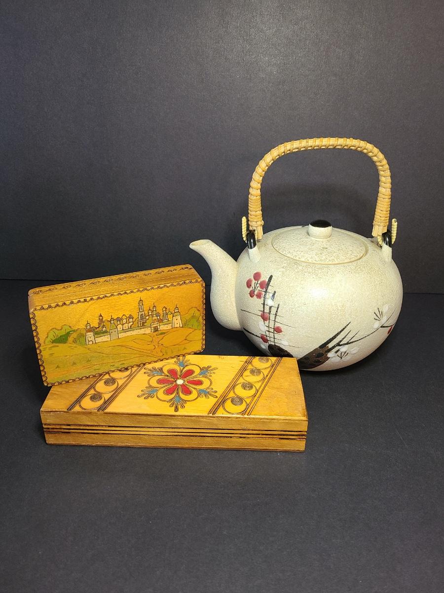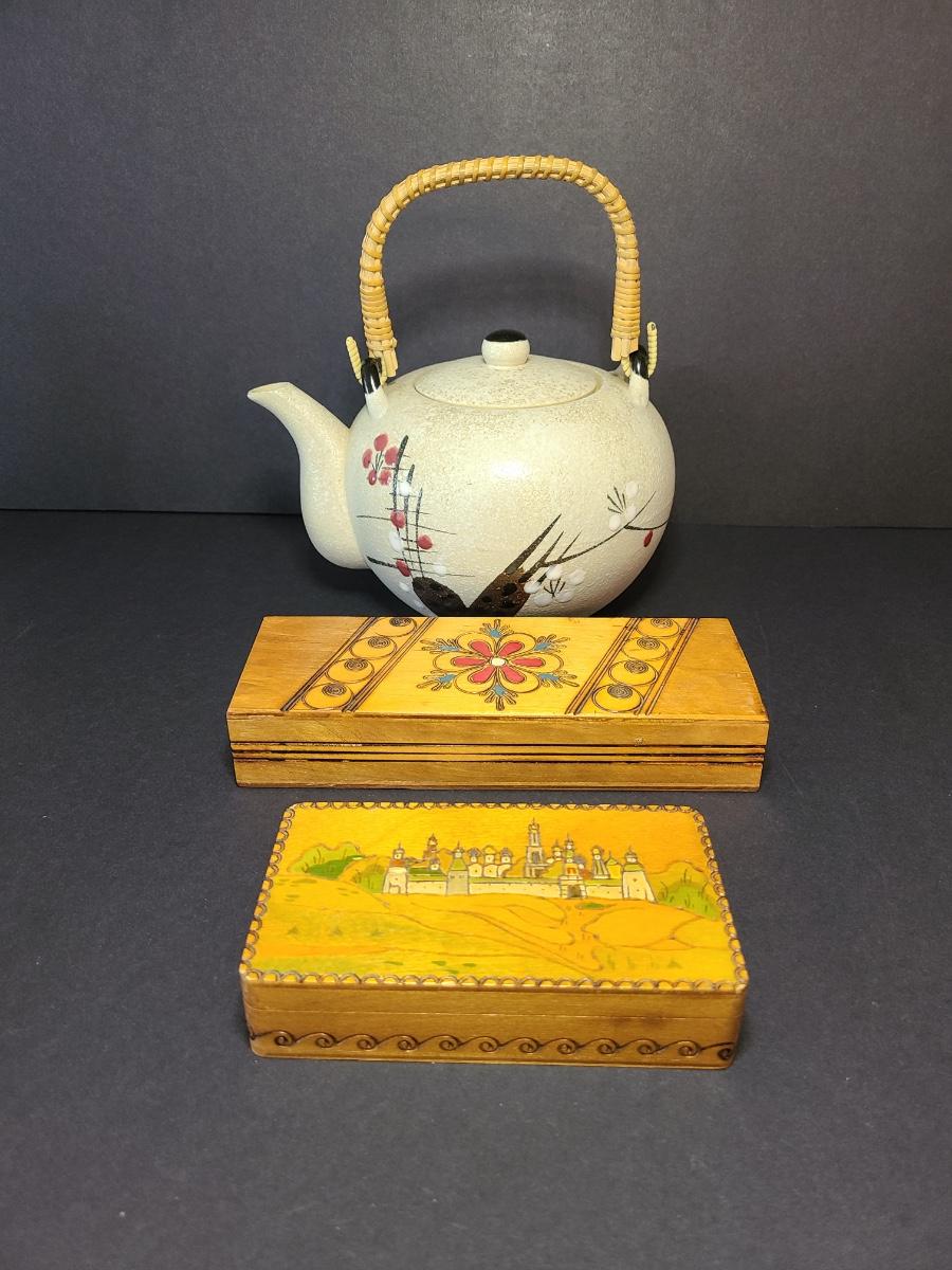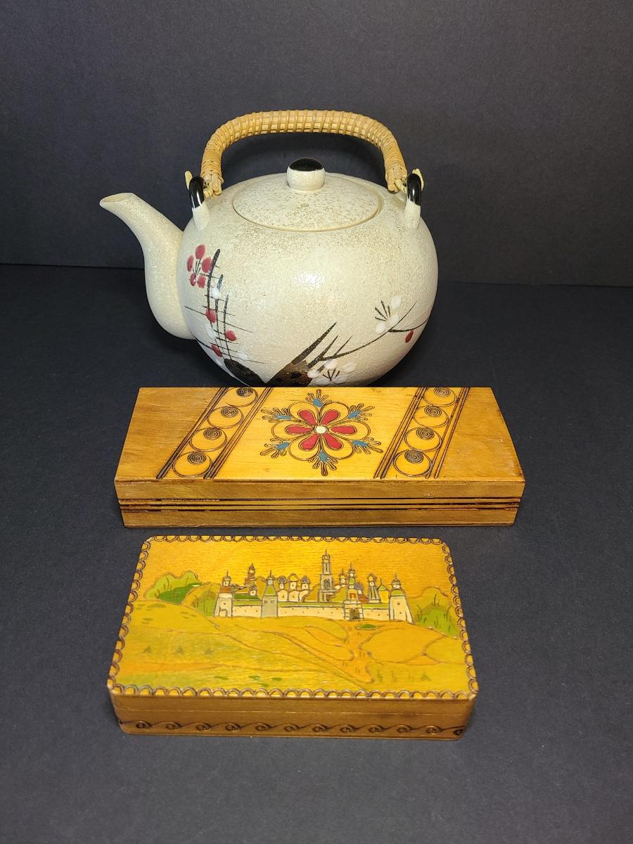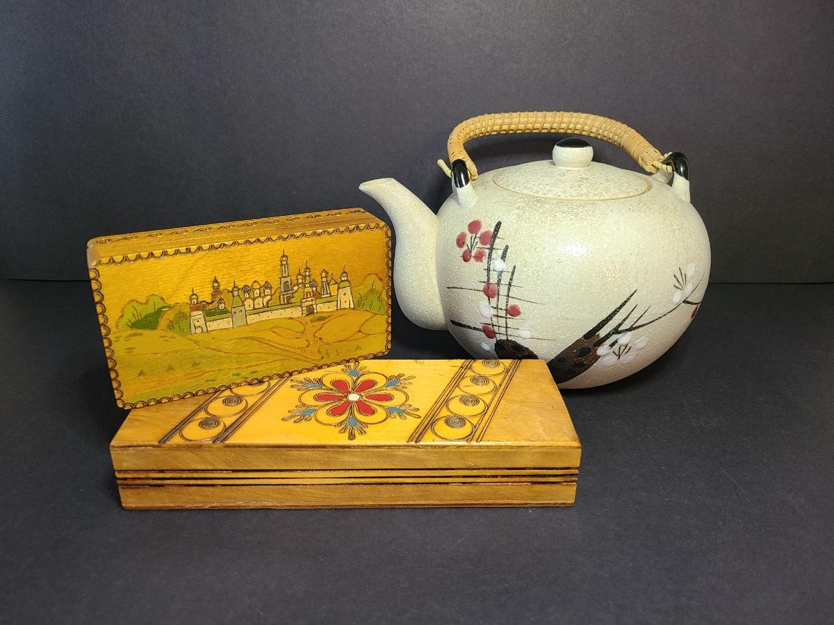 Lot 120: Pottery Teapot, & Wood Carved Boxes