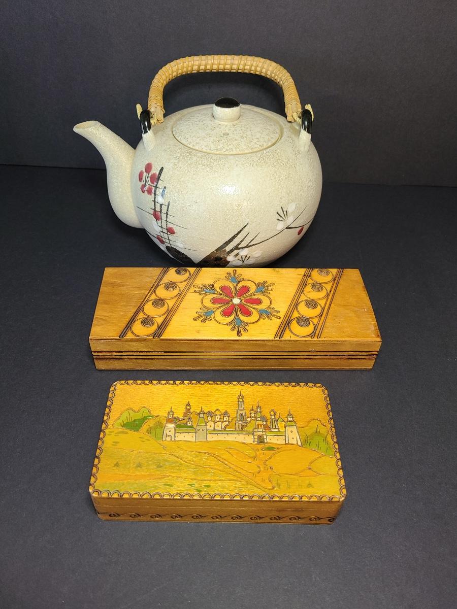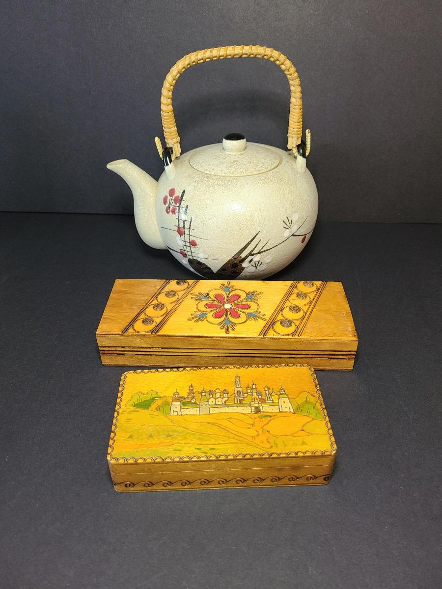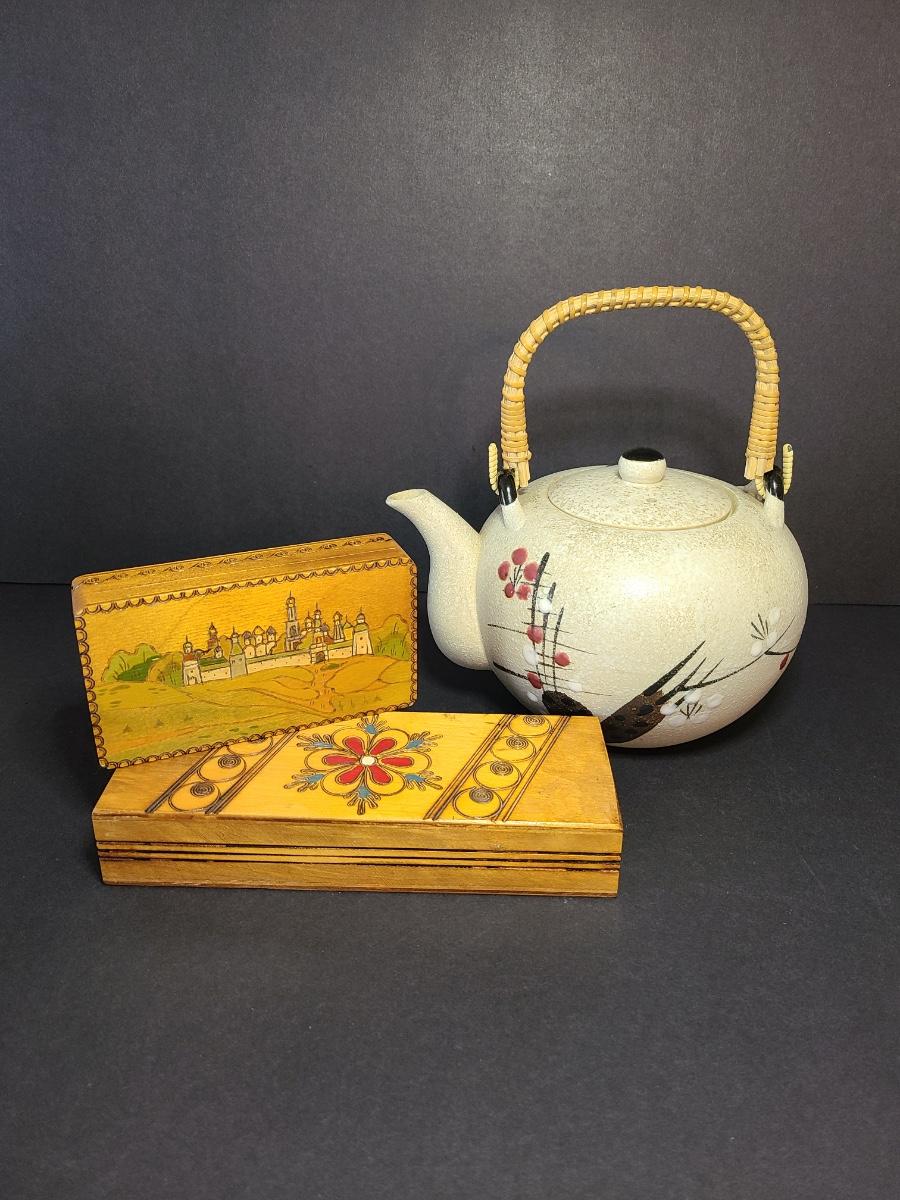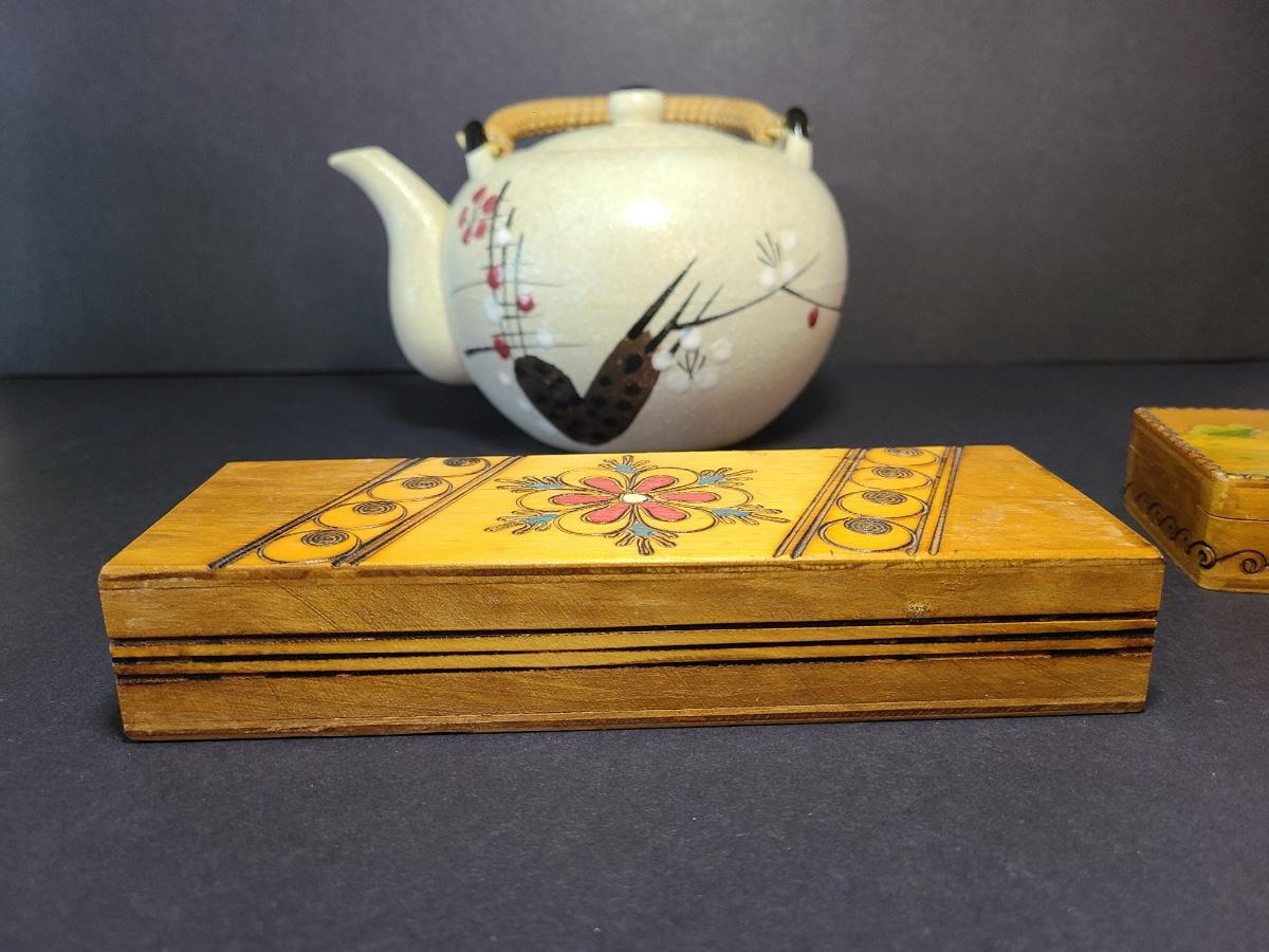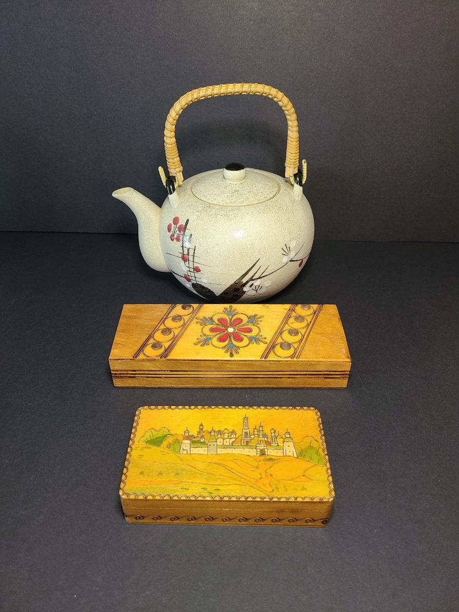 Lot 120: Pottery Teapot, & Wood Carved Boxes