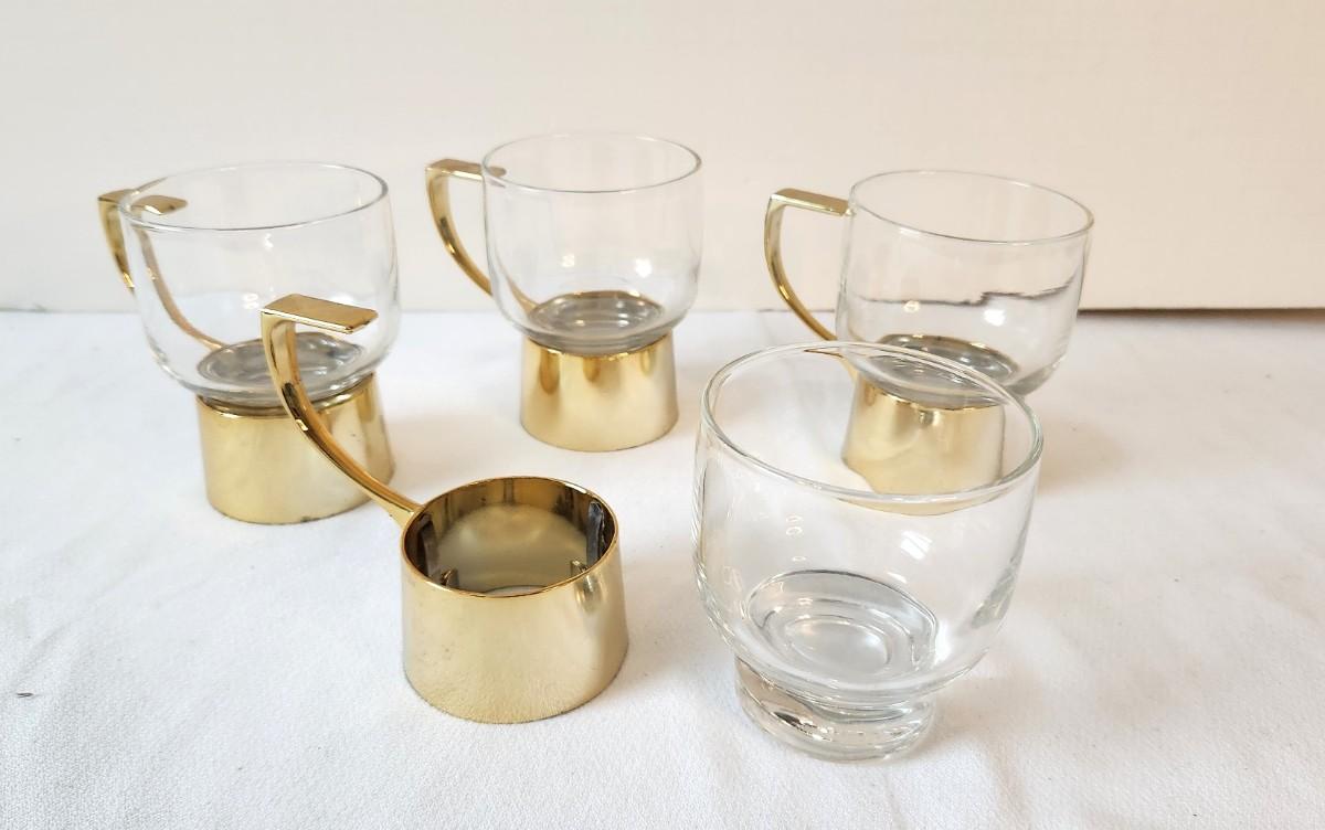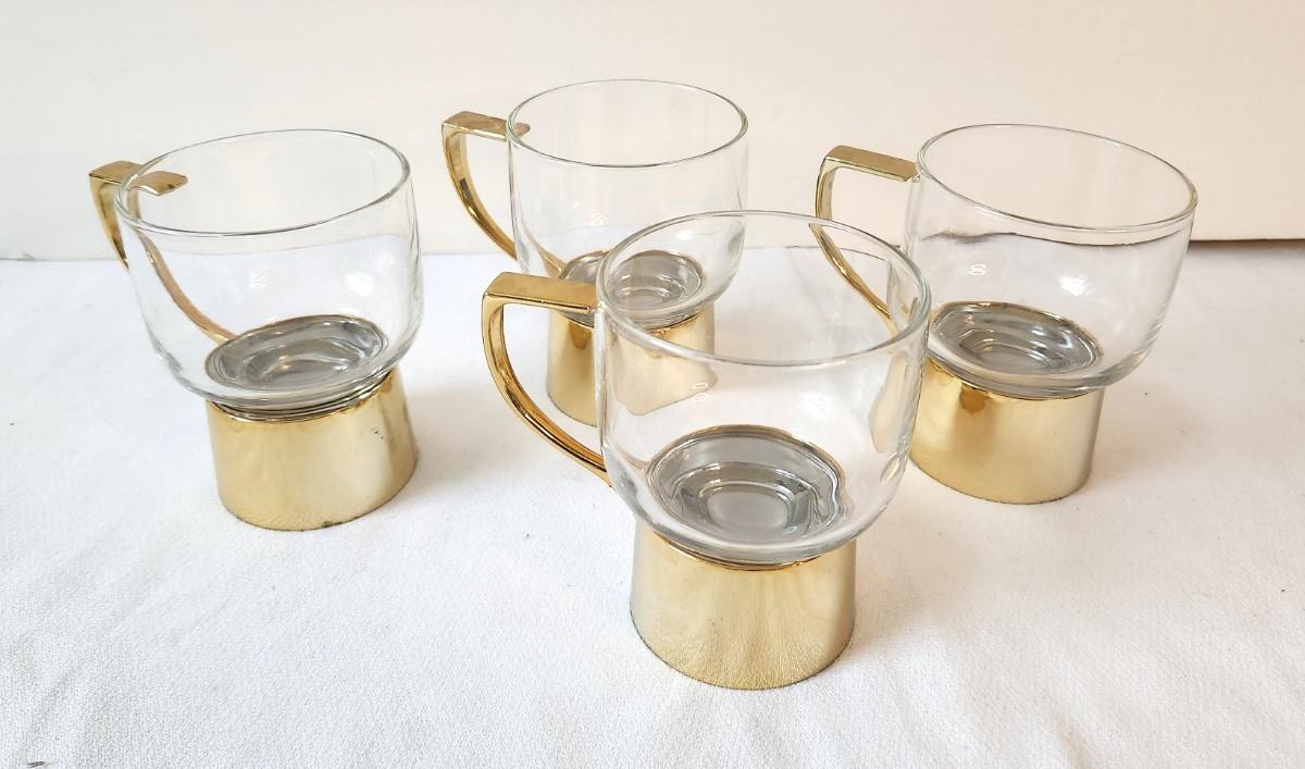 Cool set of 4 vintage MELCO brand Mid Century Modern Coffee mugs - 4" tall, Chrome holder has self loading mechanism that allows you to pop out the glass insert for washing. Hard to find.