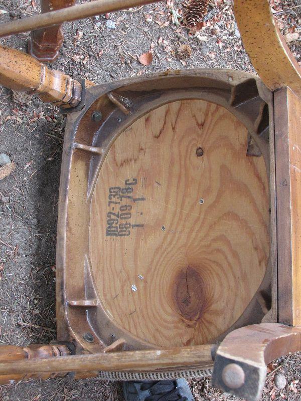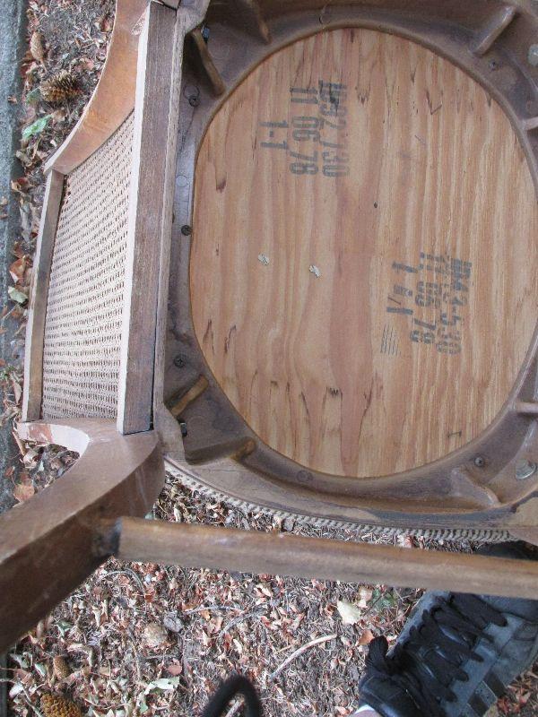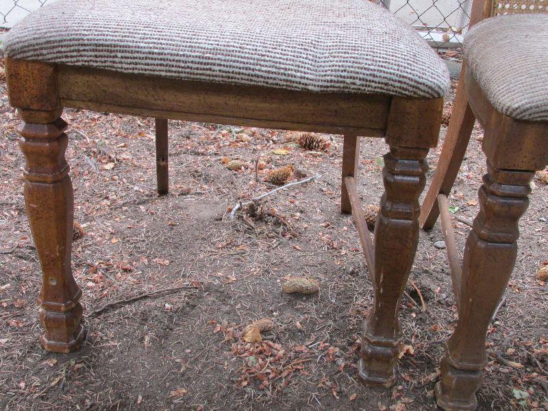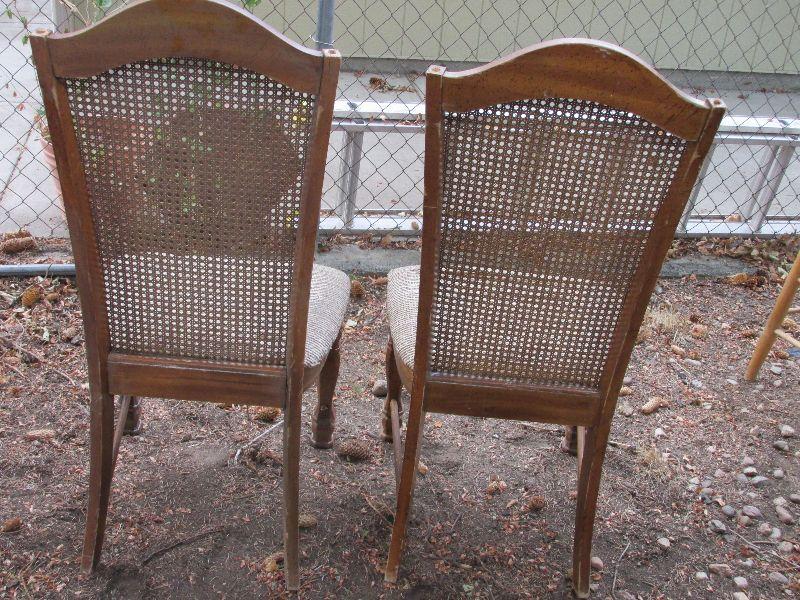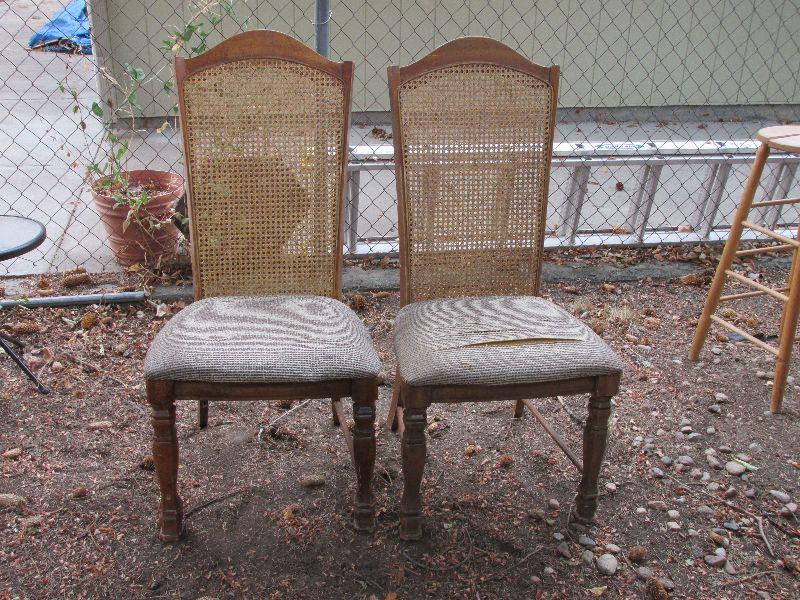 Two vintage wood chairs with mesh back. One chair has tears in upholstery.