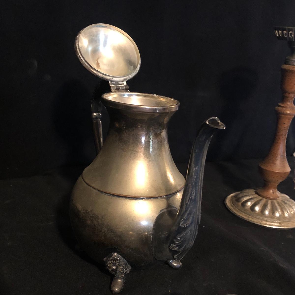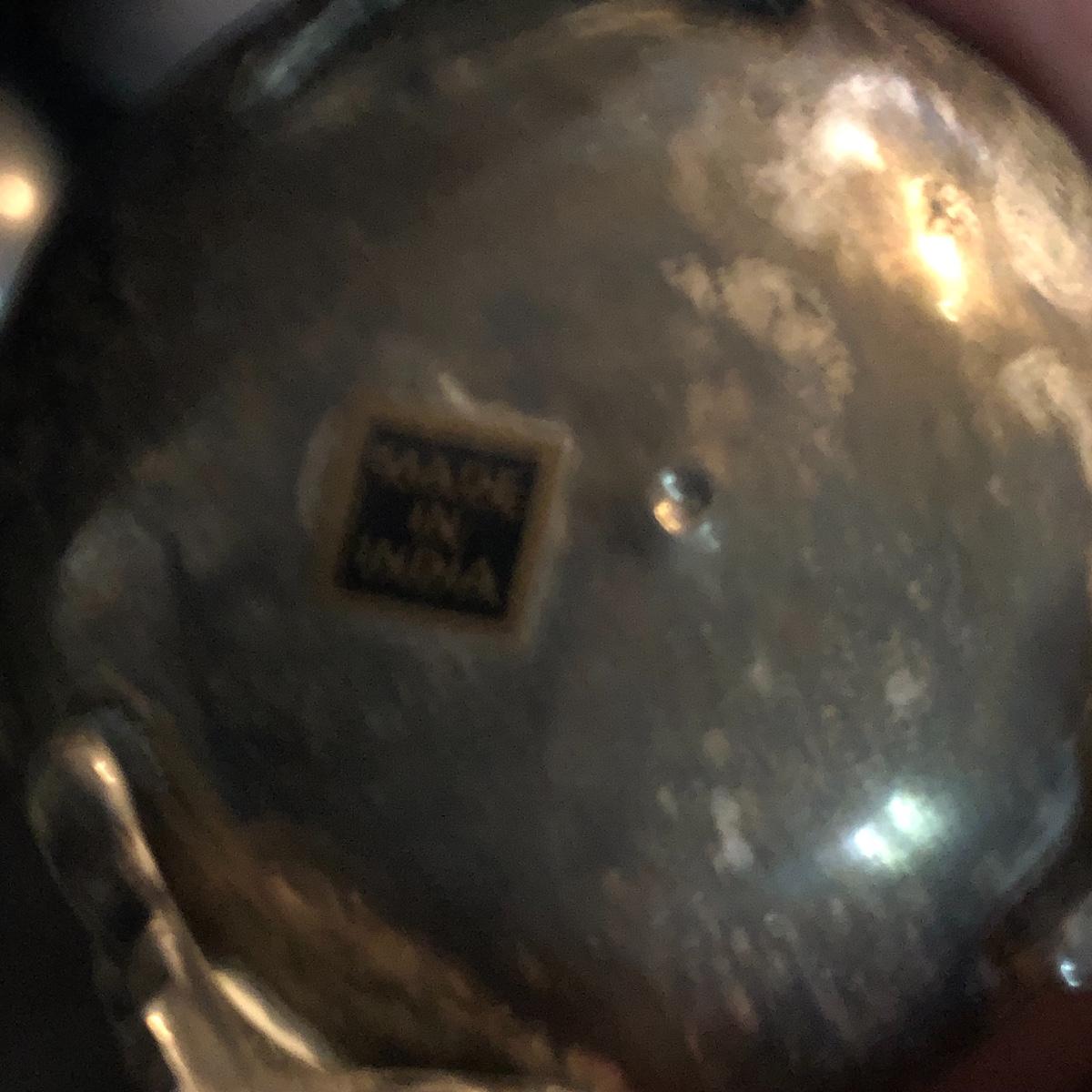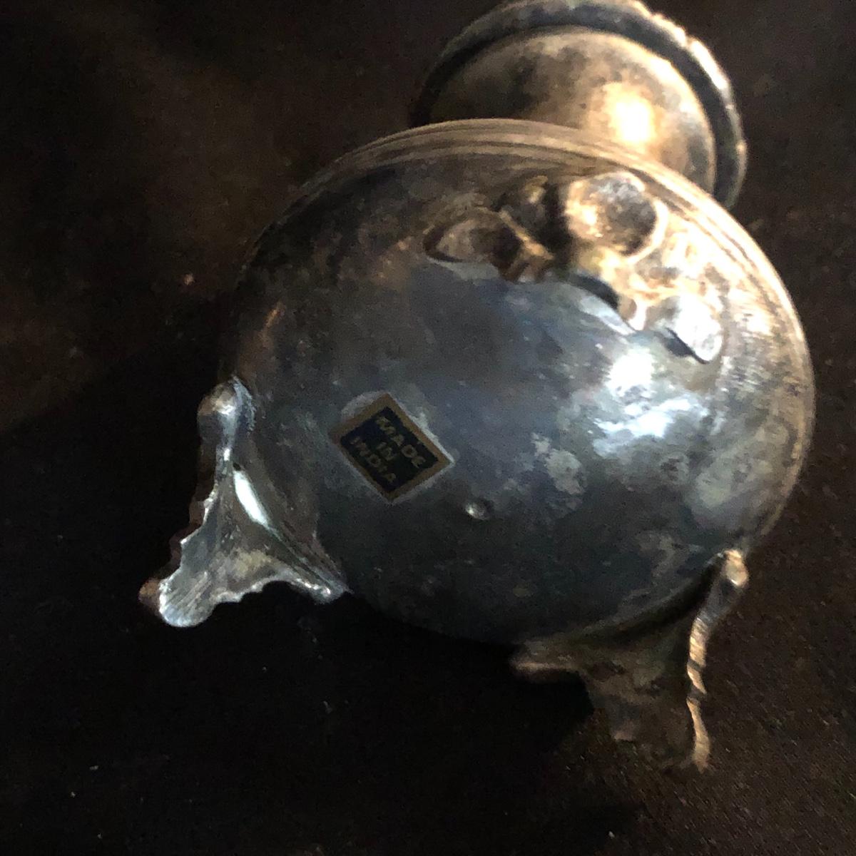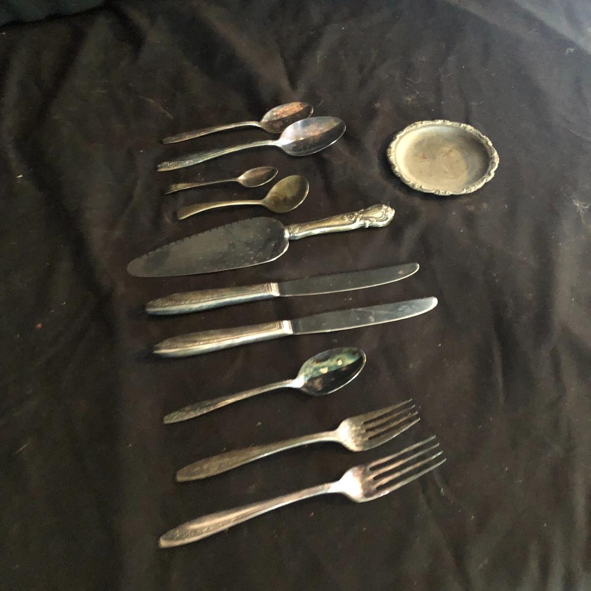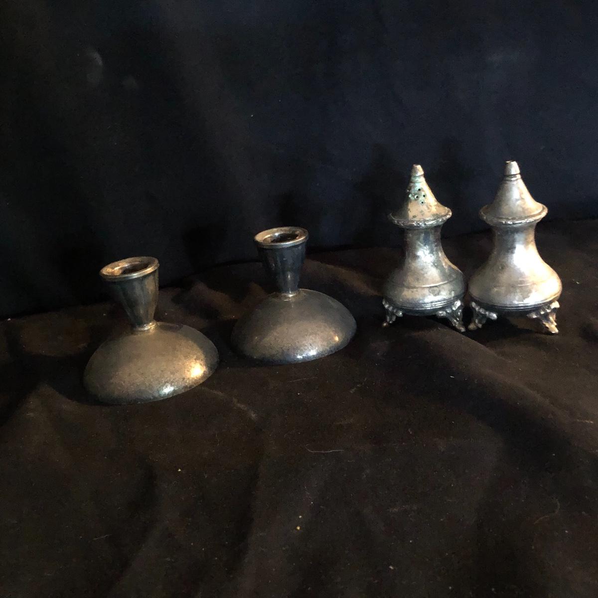 Adorn your table and home with this lot! This lot includes nine pieces (one set of candle holders and one set of salt and pepper shakers-made in India) with flatware pieces. The platter measures 12”D. Local pick up only.