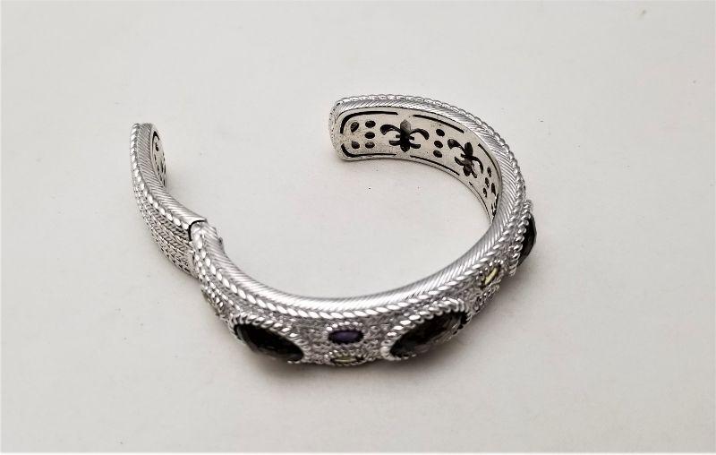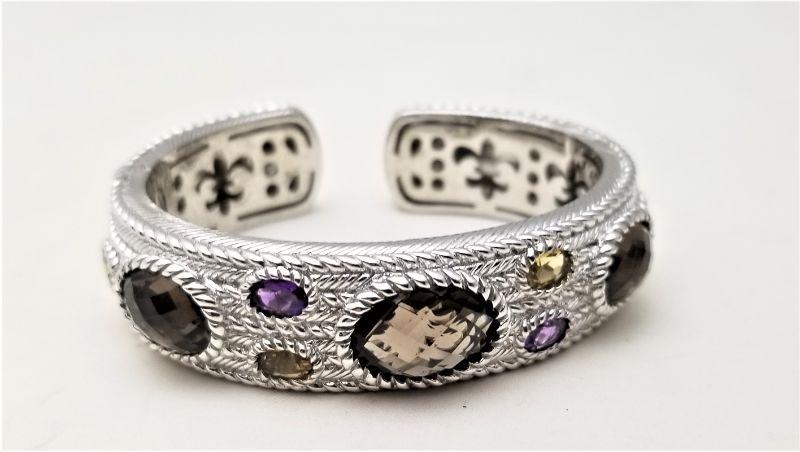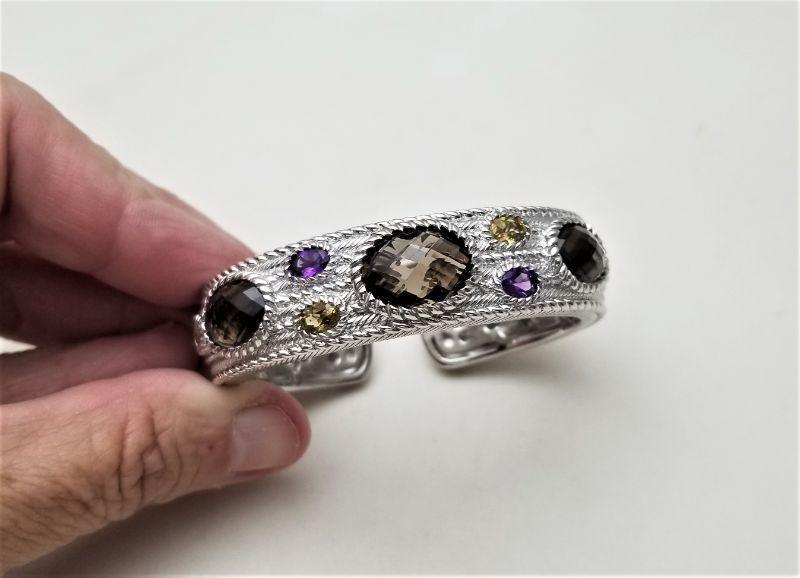 Gorgeous hinged cuff bracelet by Judith Ripka - marked Sterling silver - featuring smoky quartz, lemon quartz and amethyst. Heavy - a quality piece of jewelry. NOTE: This bracelet is on the small side and would work best with a 6" wrist. Mine is 7" and it's tight on me.