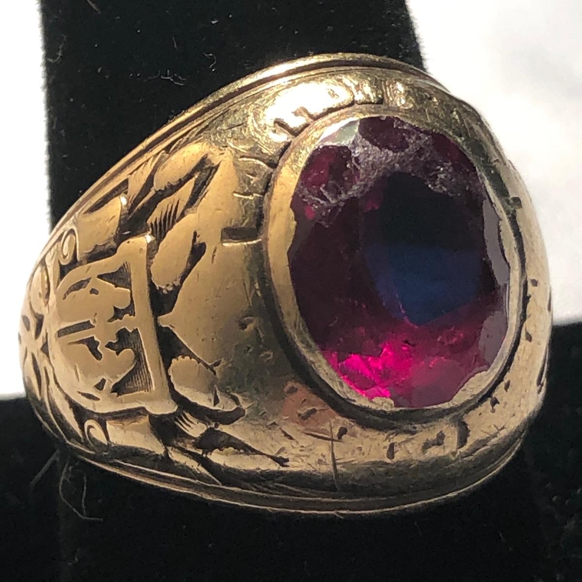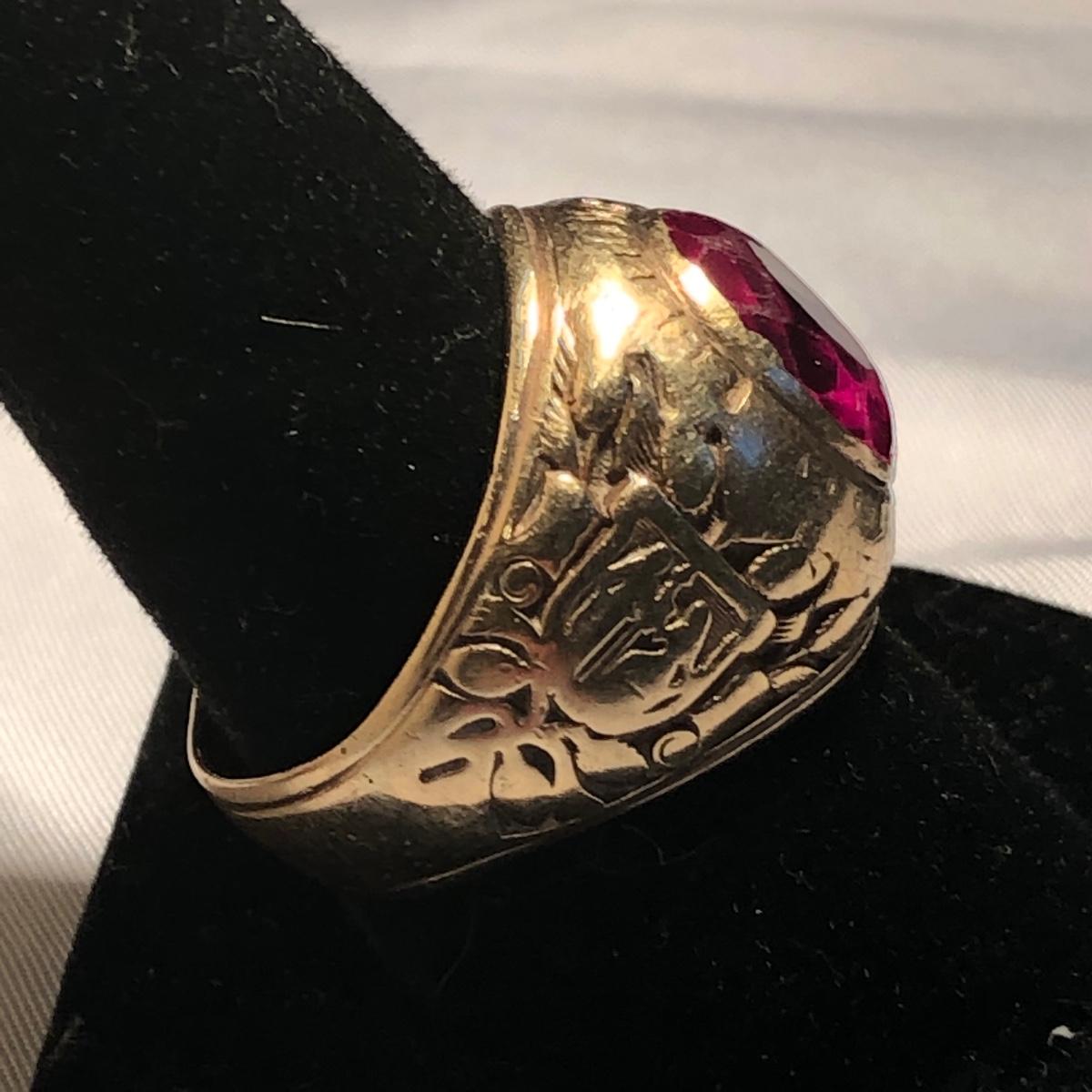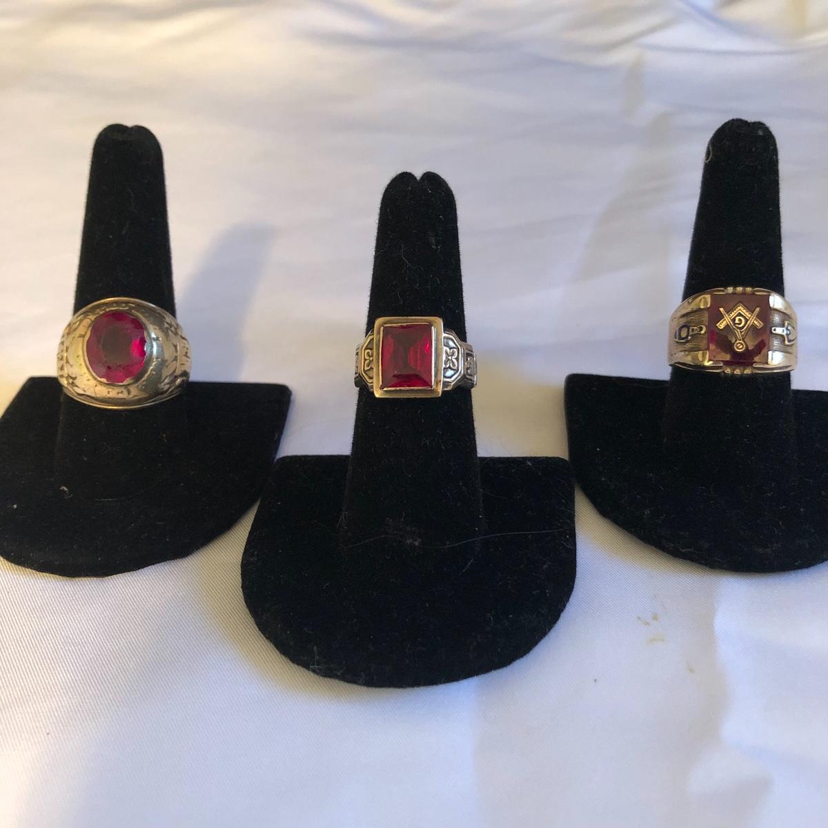 All three of these rings are marked 10K and have large ruby colored stones. The largest and smallest rings appear to be class rings (smallest ring has a gold loop attachment for wearing as a pendant) and the other that has an emblem in the center of the stone is a Masonic ring. Two rings have splits within the gold band which could easily be repaired by a jeweler and the largest stone does have some scratches shown in the last image.
