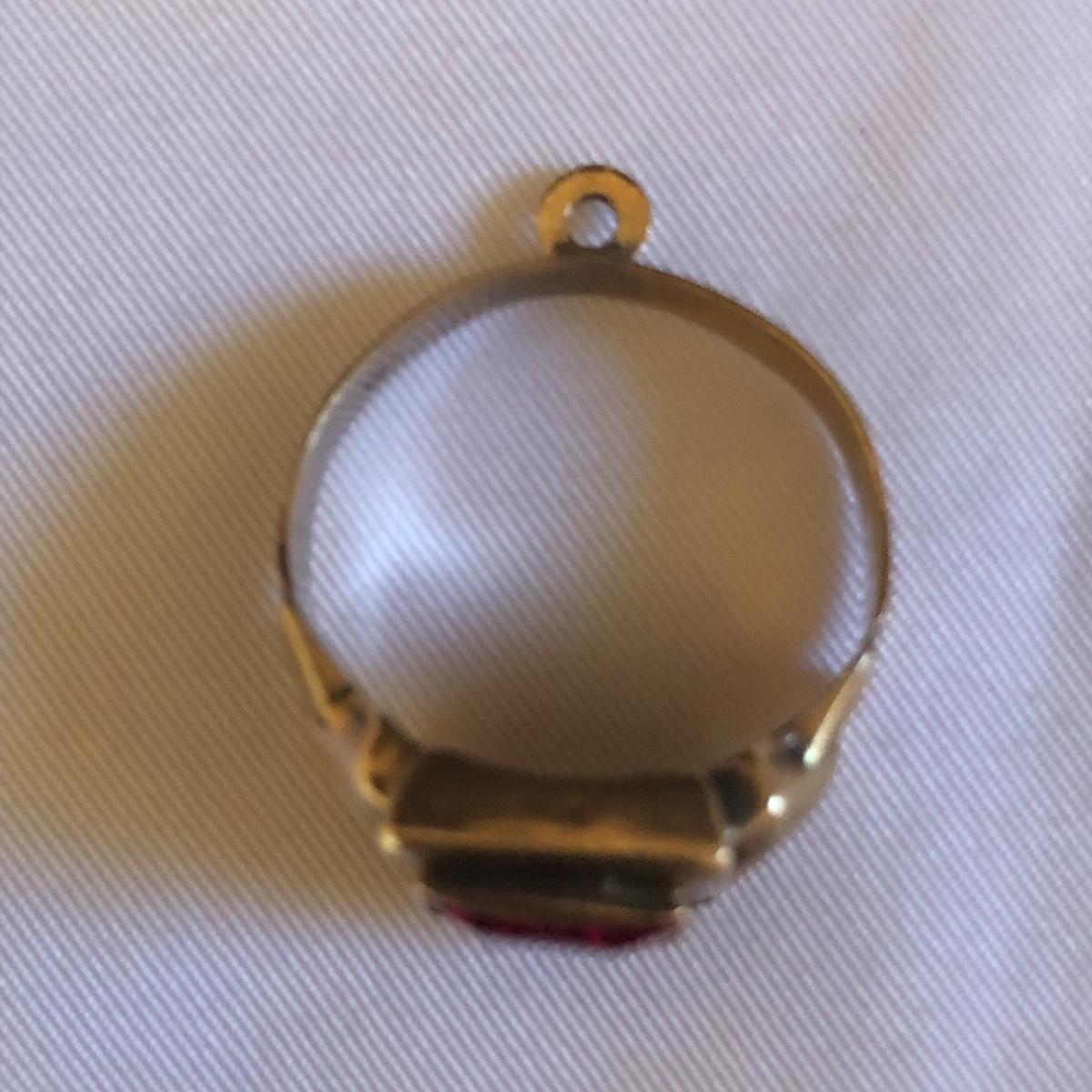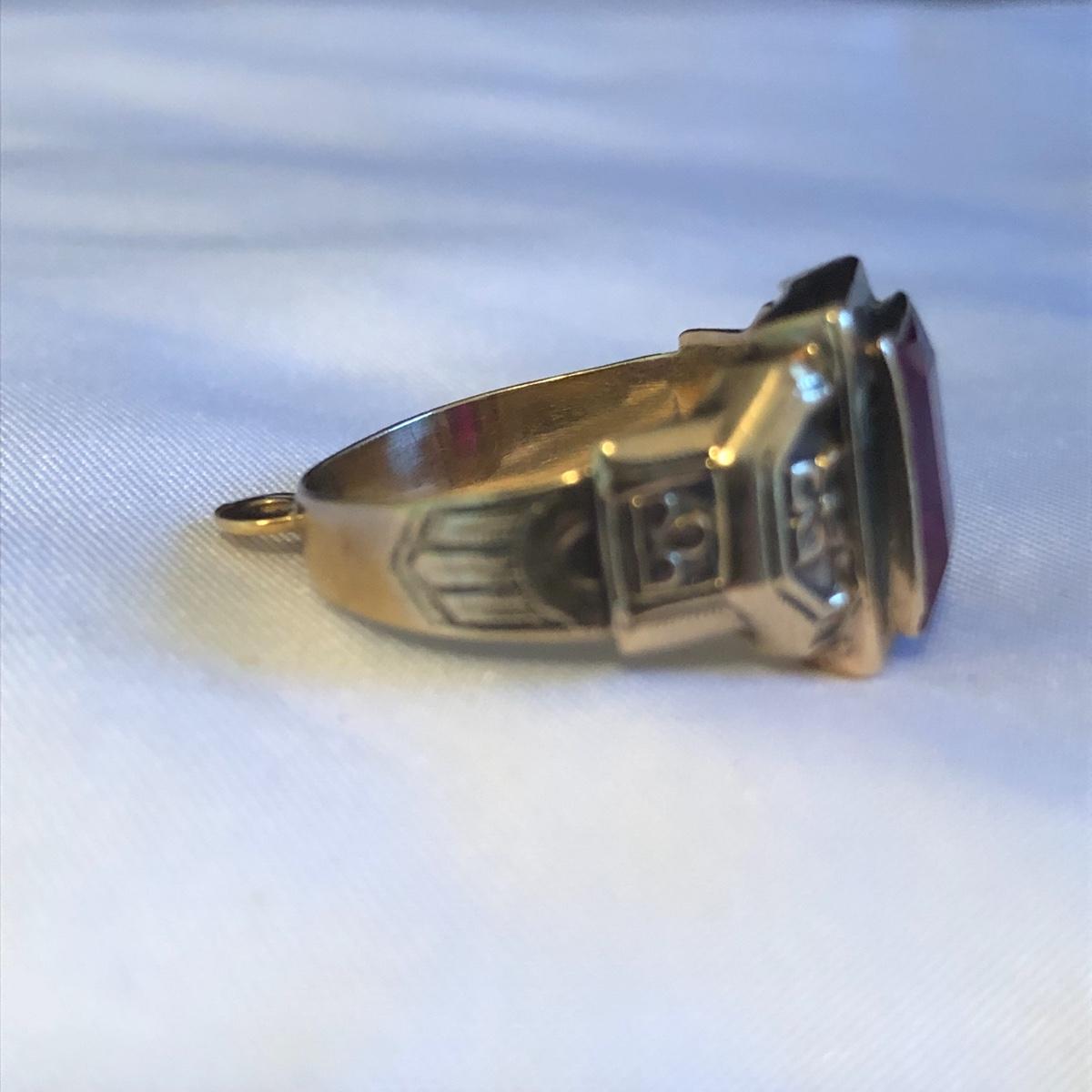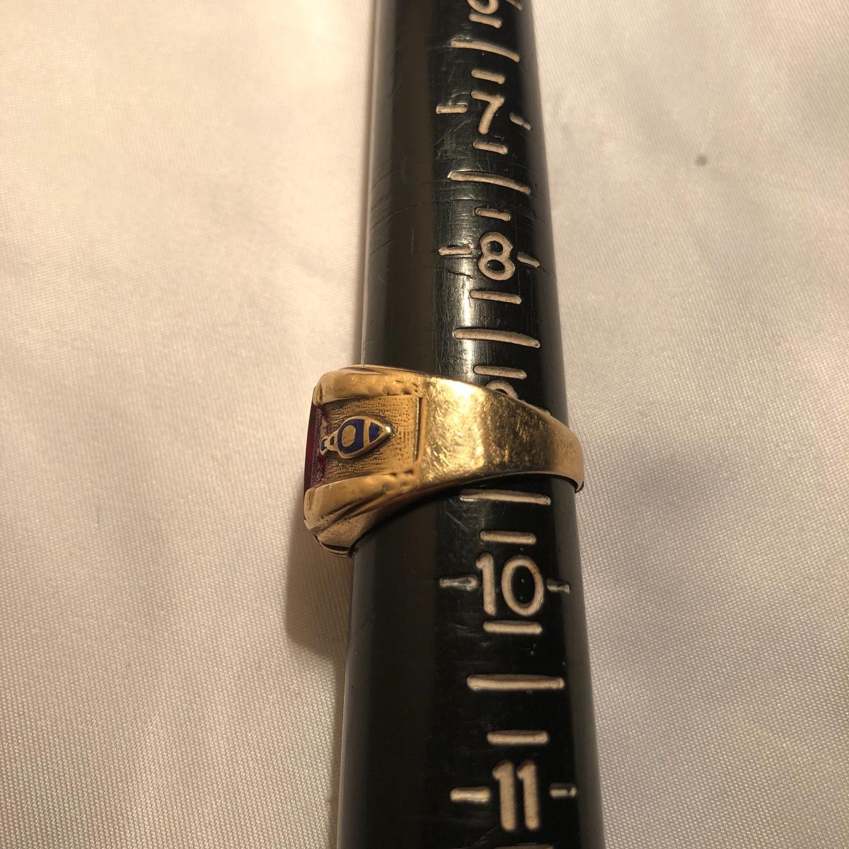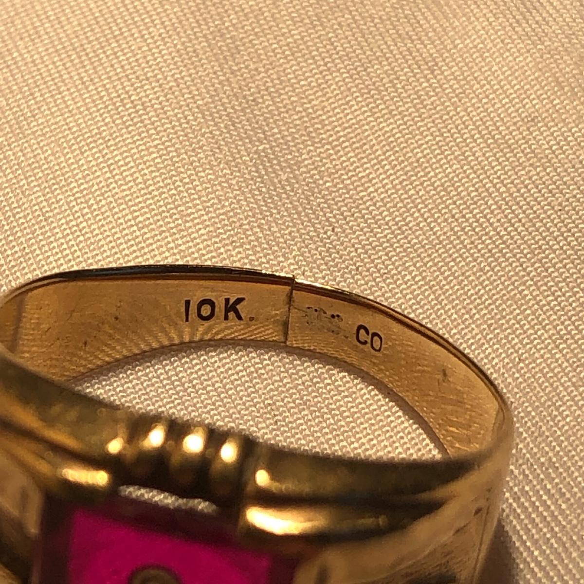 All three of these rings are marked 10K and have large ruby colored stones. The largest and smallest rings appear to be class rings (smallest ring has a gold loop attachment for wearing as a pendant) and the other that has an emblem in the center of the stone is a Masonic ring. Two rings have splits within the gold band which could easily be repaired by a jeweler and the largest stone does have some scratches shown in the last image.