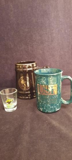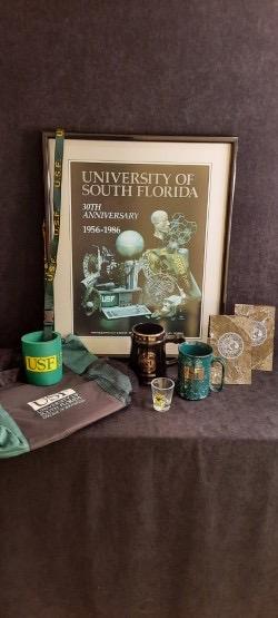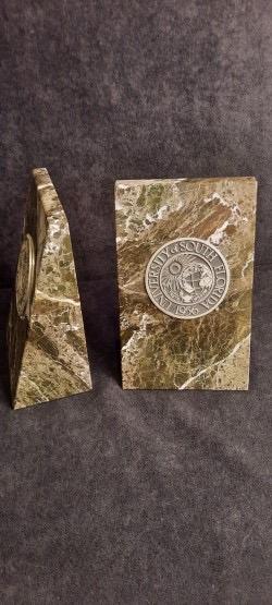 Tote bag, framed print, pewter bookends, 2 mugs and a shot glass