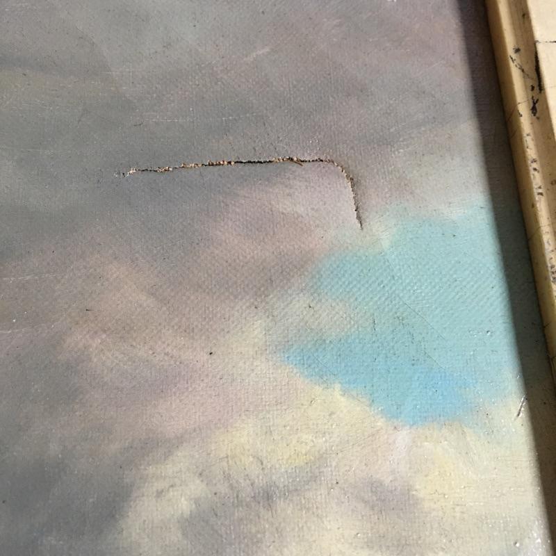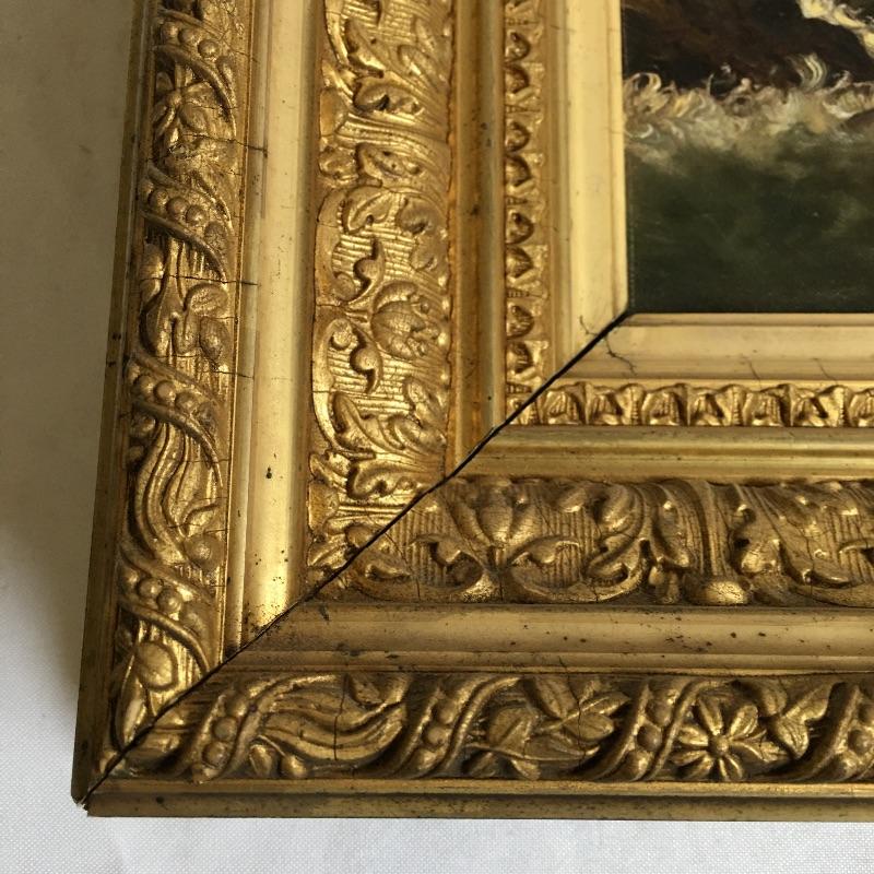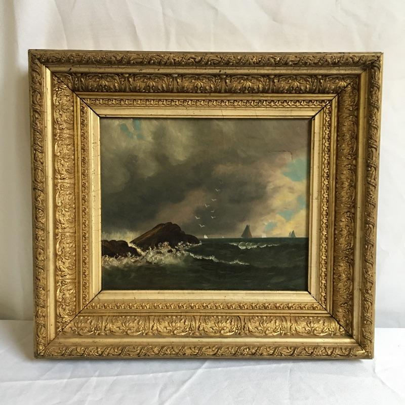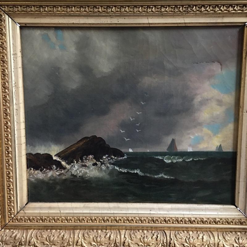 Vintage frame and painting. Beautiful and intricate frame that measures 16” x 18” x 3” with a nautical painting. Frame has a few nicks, scratches and minor surface cracks and painting has a tear, see pictures.