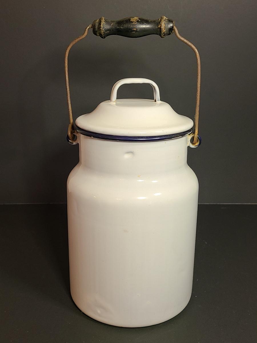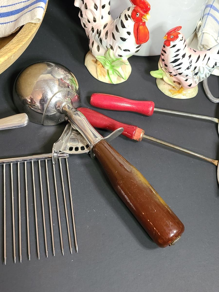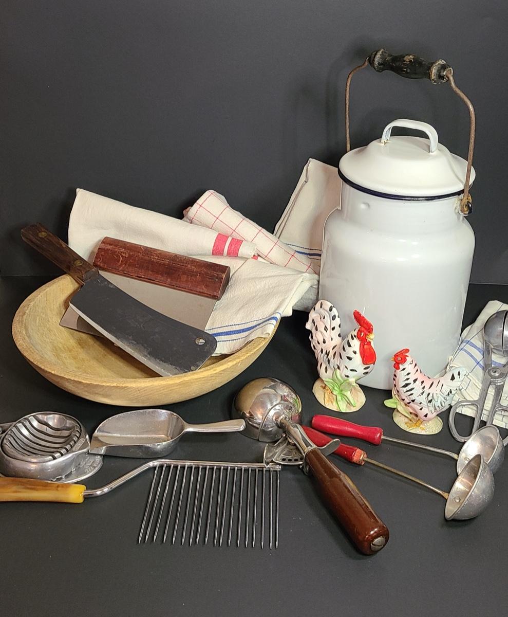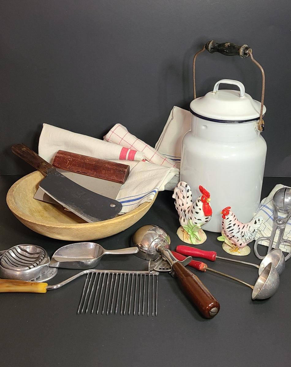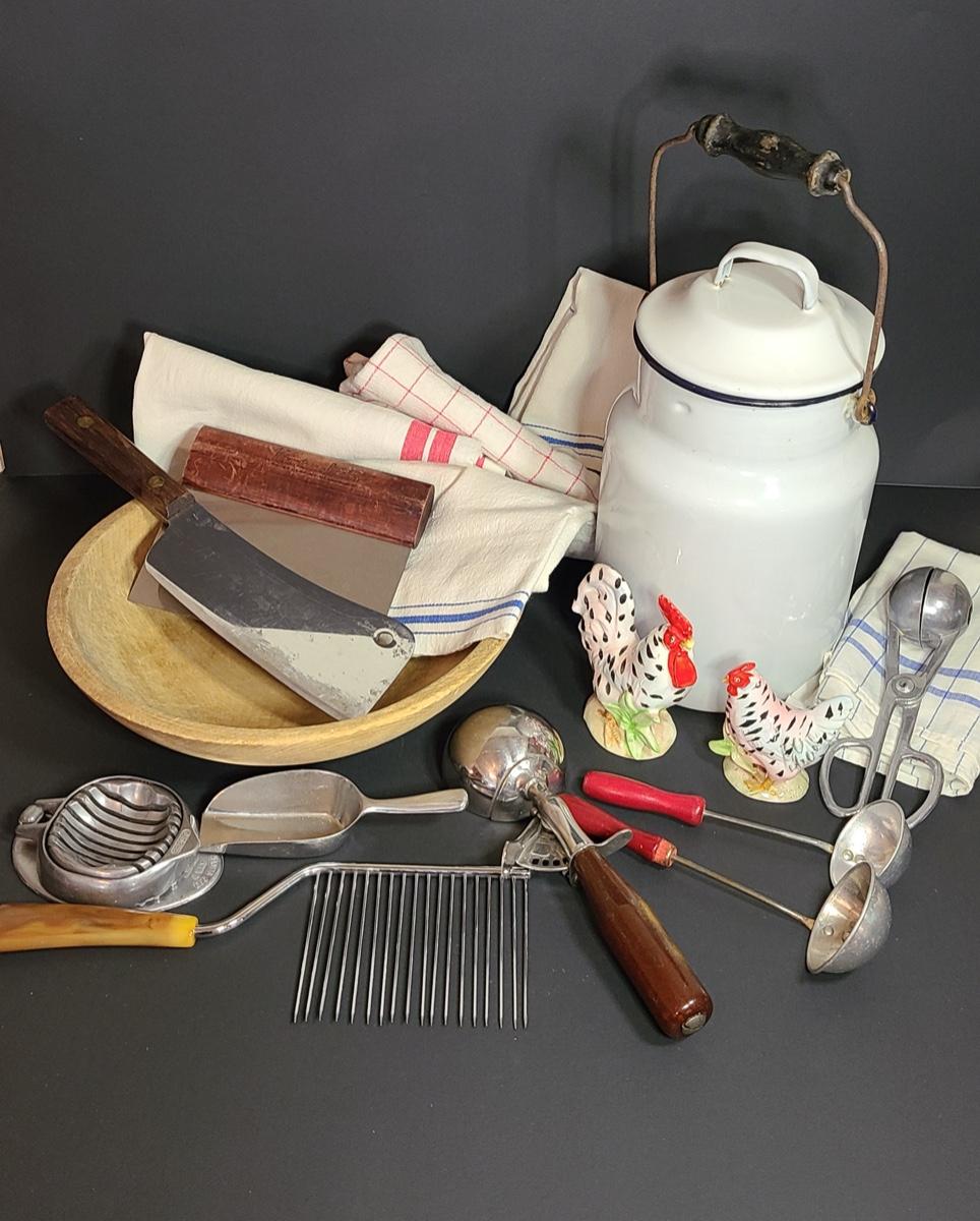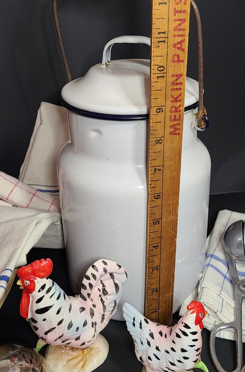 Vintage/Antique lot of kitchen items including: Enamel Metal milk can with some minor wear the the enamel at the base, wood primitive dough bowl, rooster salt and pepper set, linen vintage kitchen tools and more. All of these items are pre-owned and may show minor wear. Please see all pictures as they are the best representation of the items. The pictures show condition, measurements if taken, and what is included in the lot. Due to the large amount that we photograph and the time frame, we are not always able to take measurements. All items unless noted, are pre-owned and have been used. If you purchased furniture, you must bring help. We do not allow one person to carry large furniture out on their own. Bring help, tools and a truck for the safety of our client’s homes, and your personal safety. Company policy. Thank you.