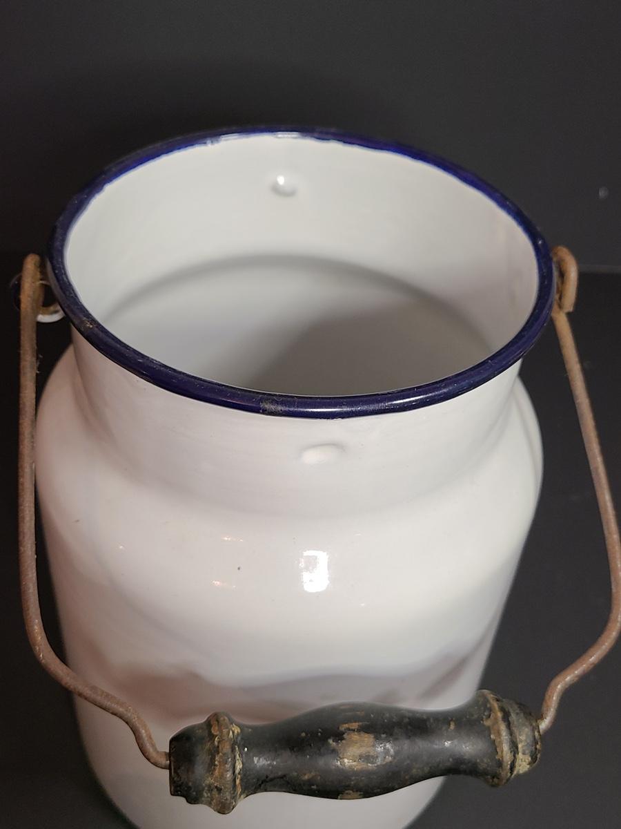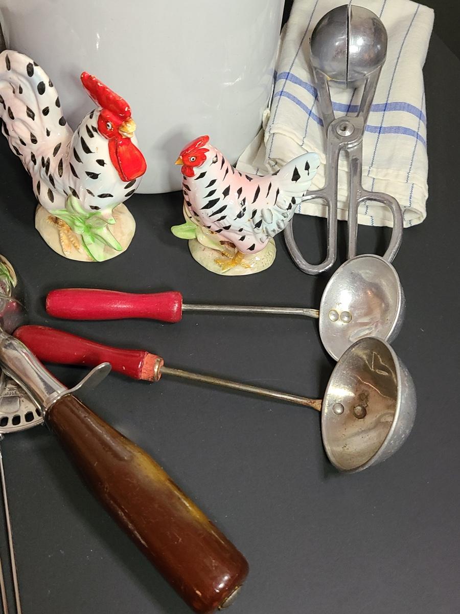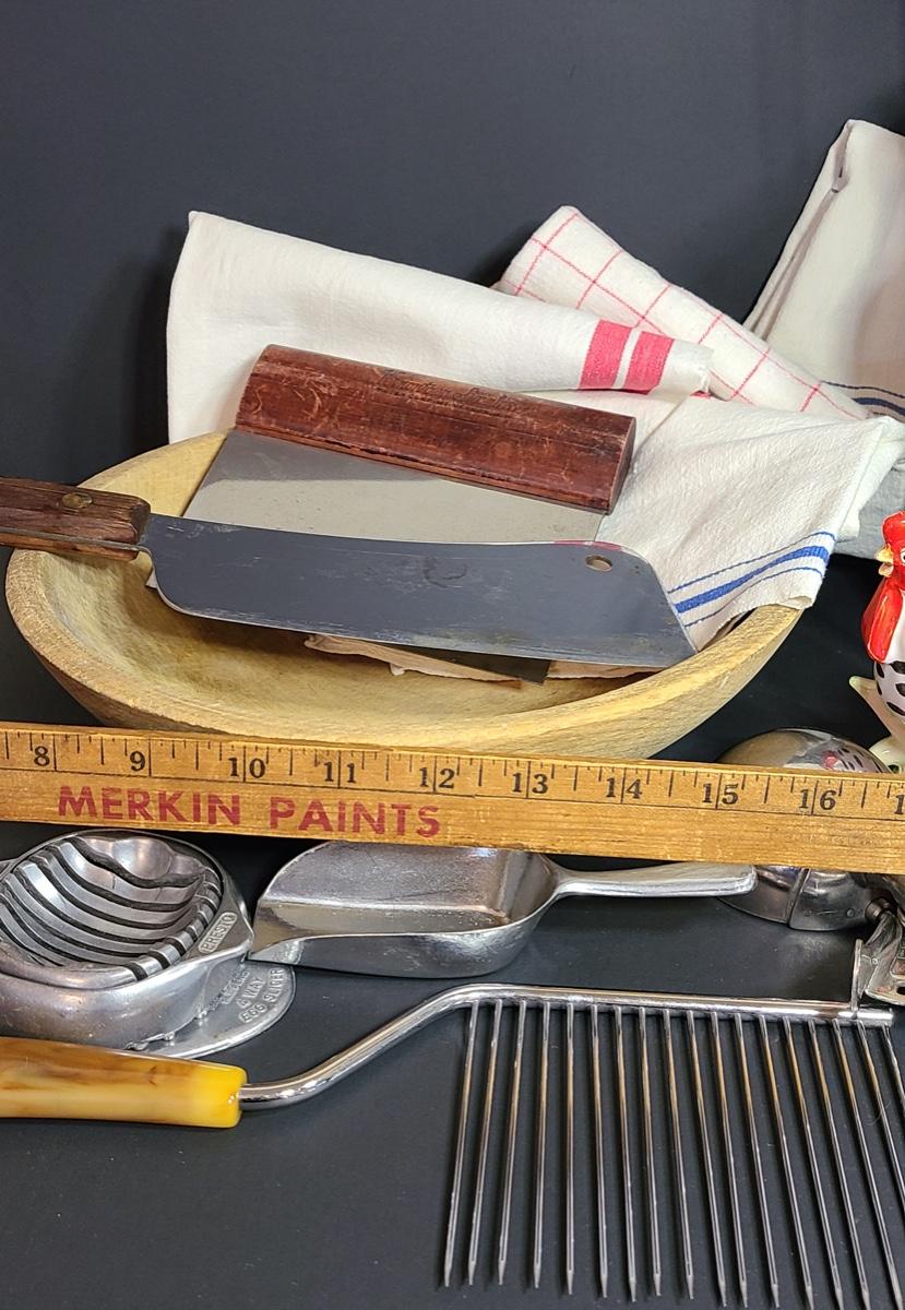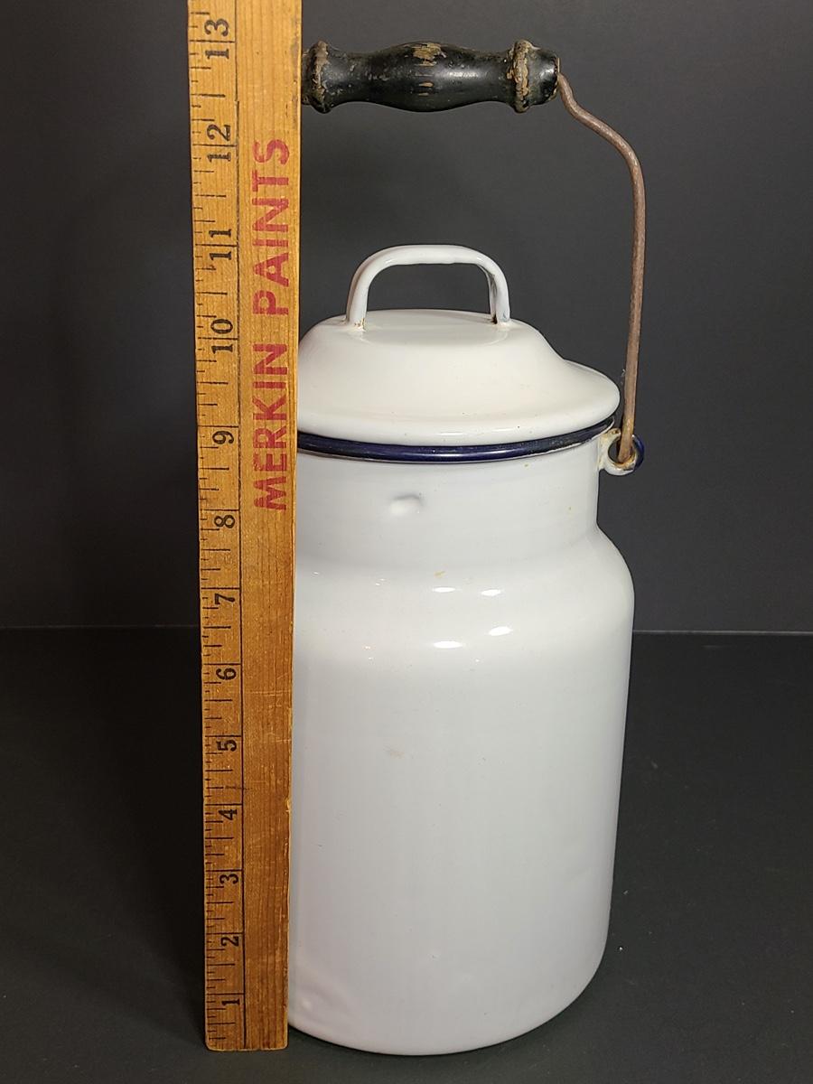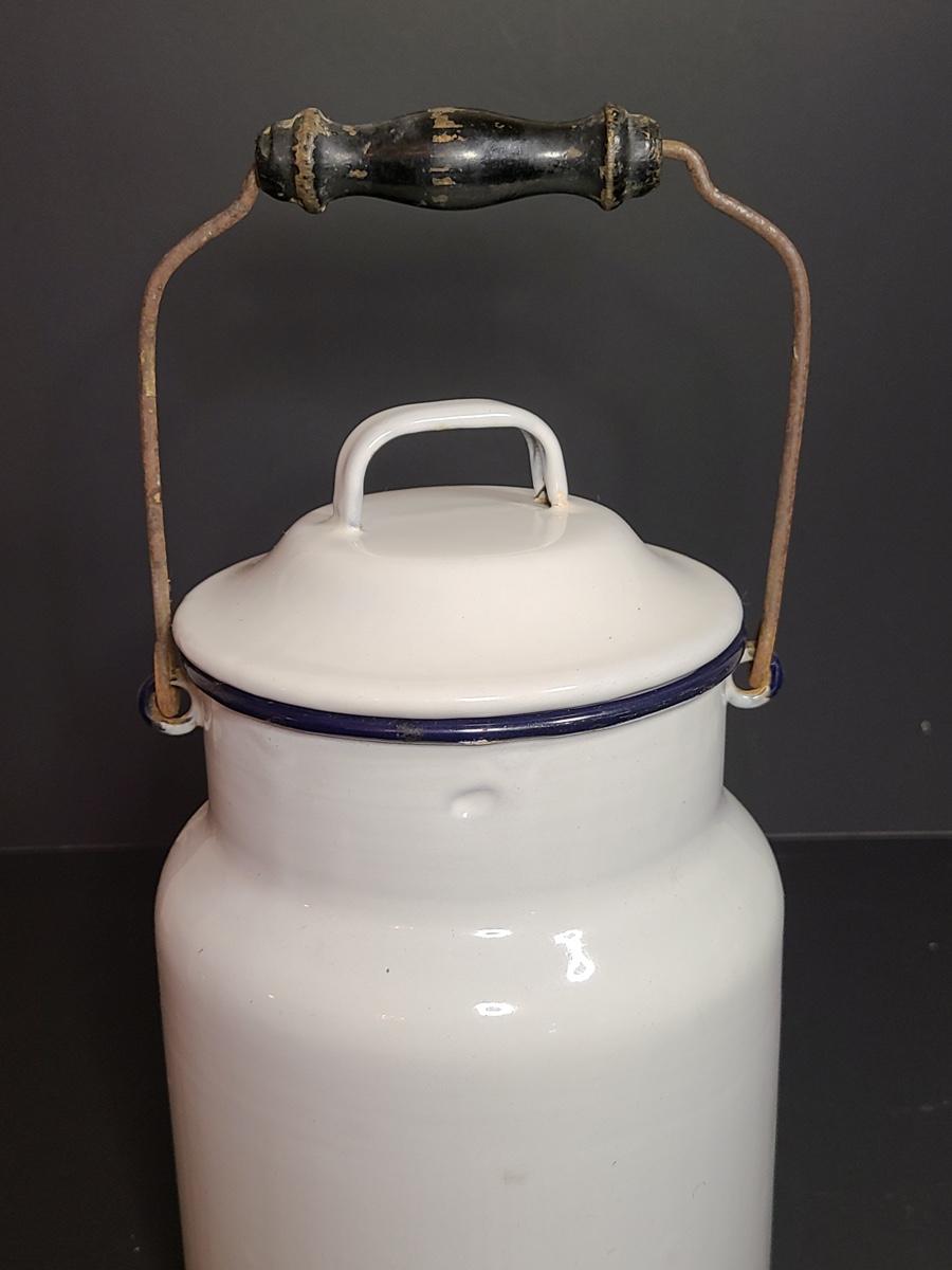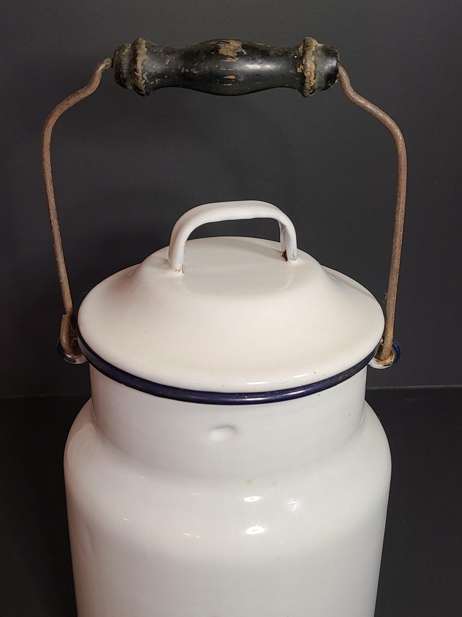 Vintage/Antique lot of kitchen items including: Enamel Metal milk can with some minor wear the the enamel at the base, wood primitive dough bowl, rooster salt and pepper set, linen vintage kitchen tools and more. All of these items are pre-owned and may show minor wear. Please see all pictures as they are the best representation of the items. The pictures show condition, measurements if taken, and what is included in the lot. Due to the large amount that we photograph and the time frame, we are not always able to take measurements. All items unless noted, are pre-owned and have been used. If you purchased furniture, you must bring help. We do not allow one person to carry large furniture out on their own. Bring help, tools and a truck for the safety of our client’s homes, and your personal safety. Company policy. Thank you.
