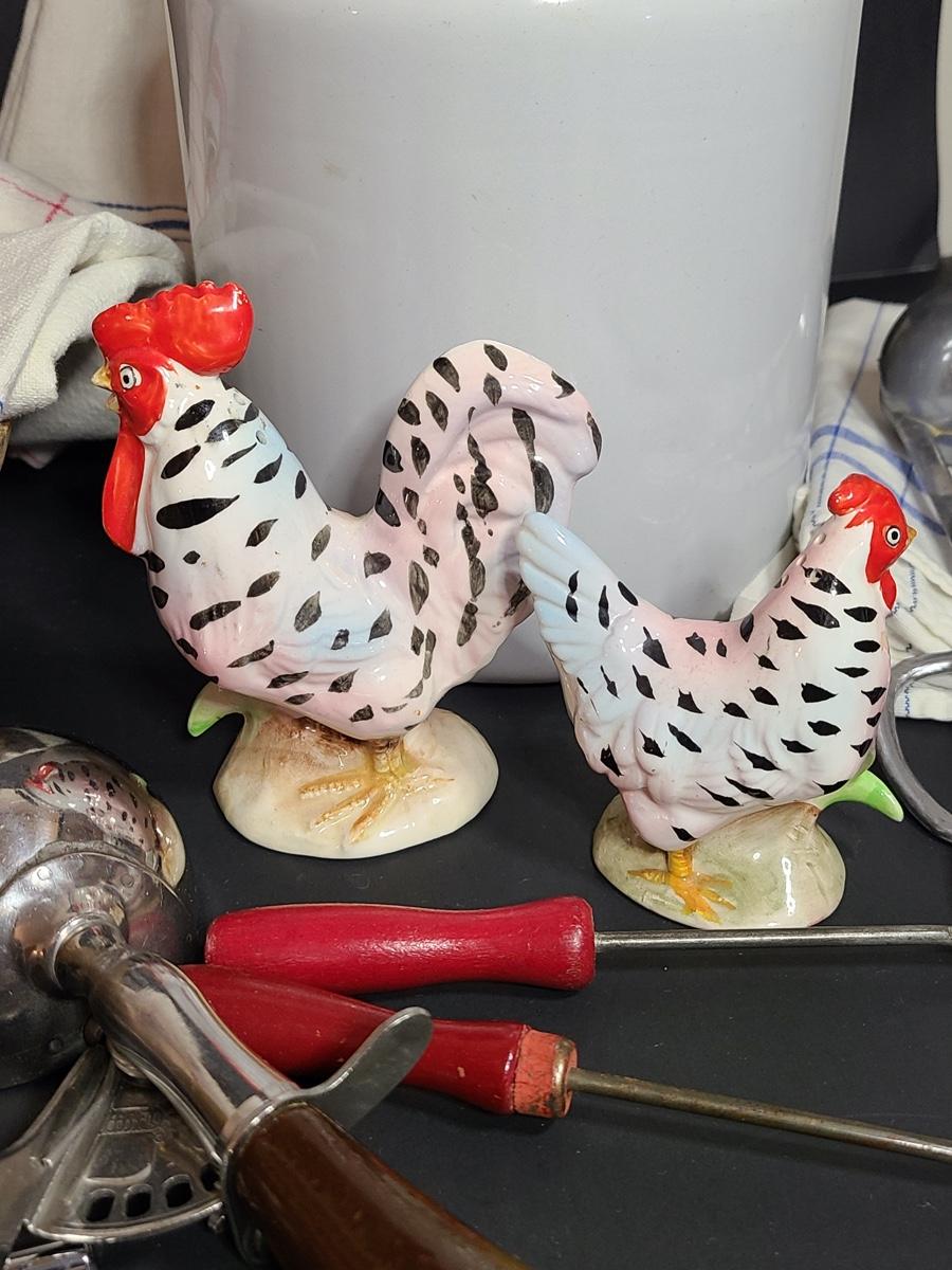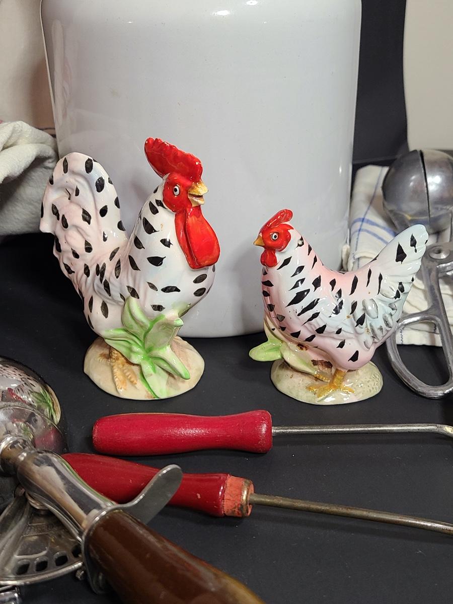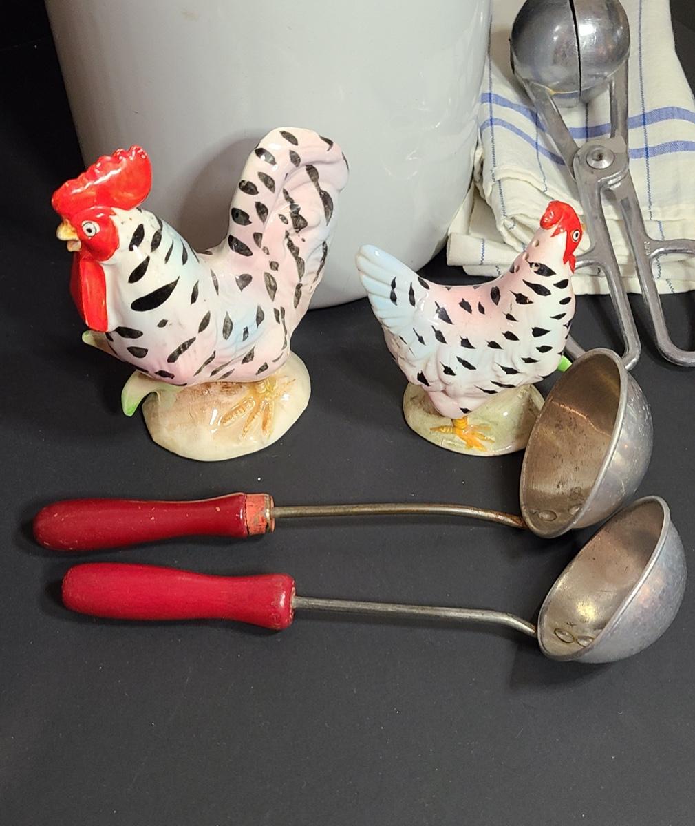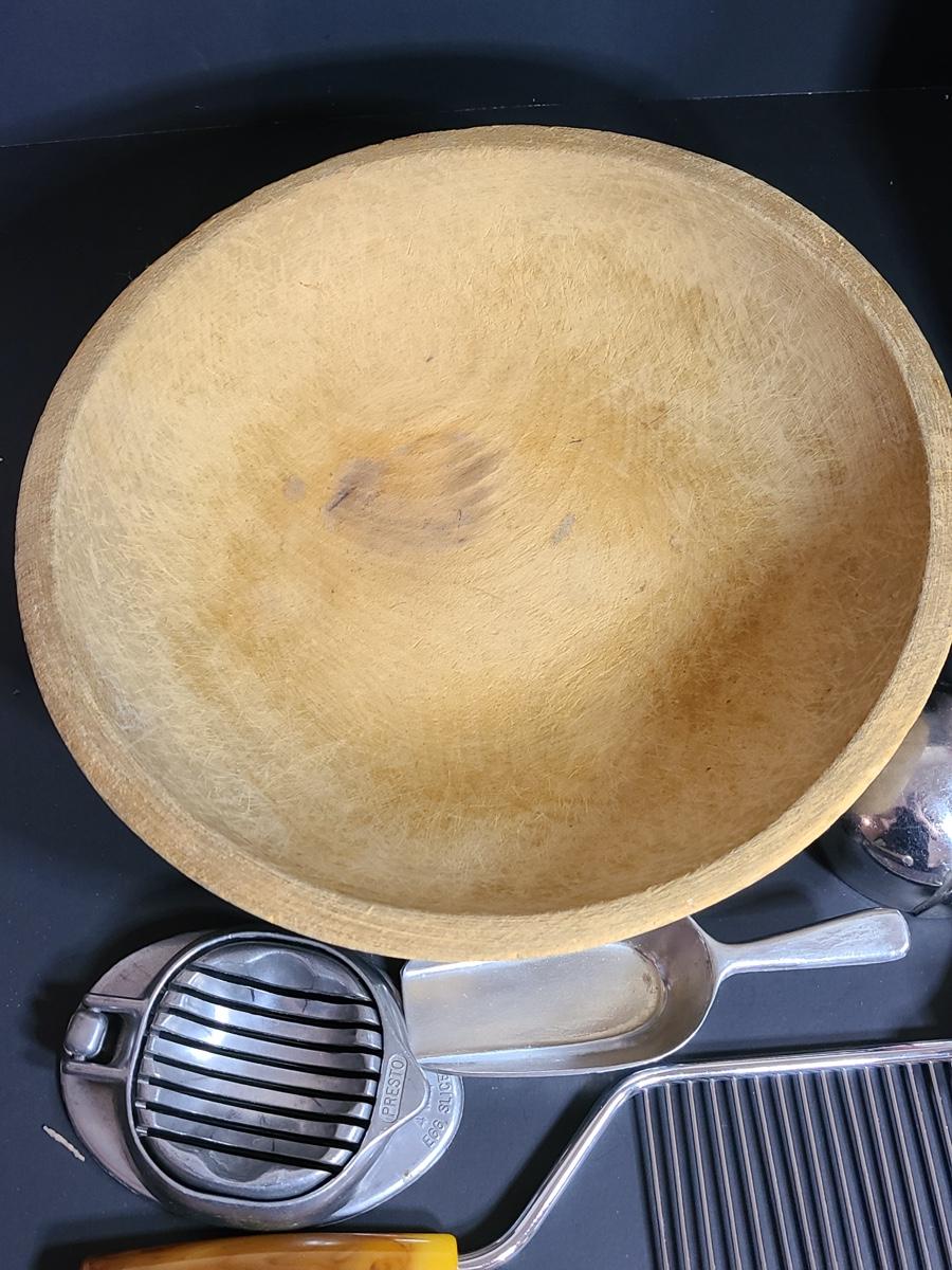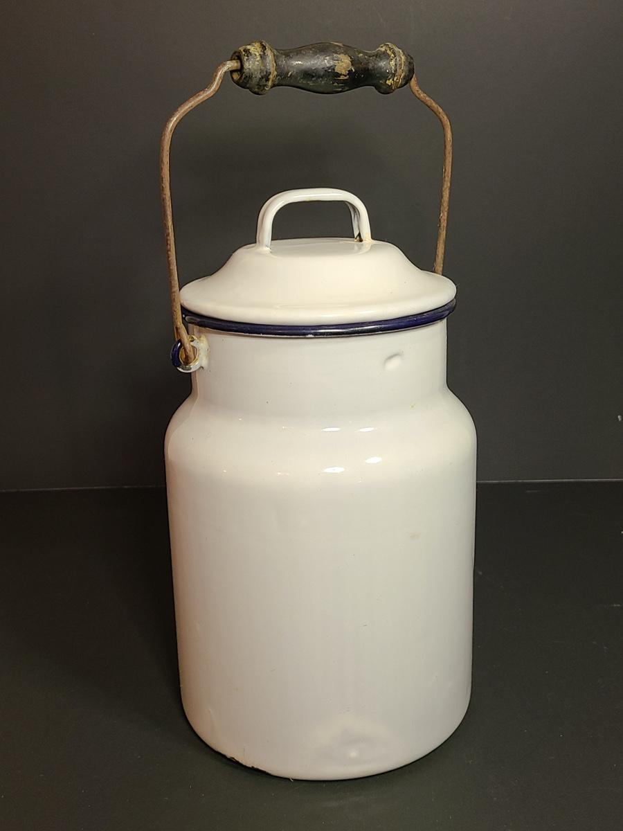 Vintage/Antique lot of kitchen items including: Enamel Metal milk can with some minor wear the the enamel at the base, wood primitive dough bowl, rooster salt and pepper set, linen vintage kitchen tools and more. All of these items are pre-owned and may show minor wear. Please see all pictures as they are the best representation of the items. The pictures show condition, measurements if taken, and what is included in the lot. Due to the large amount that we photograph and the time frame, we are not always able to take measurements. All items unless noted, are pre-owned and have been used. If you purchased furniture, you must bring help. We do not allow one person to carry large furniture out on their own. Bring help, tools and a truck for the safety of our client’s homes, and your personal safety. Company policy. Thank you.