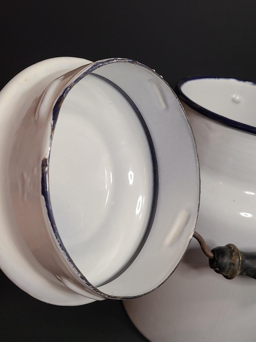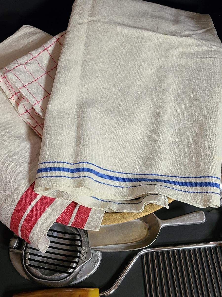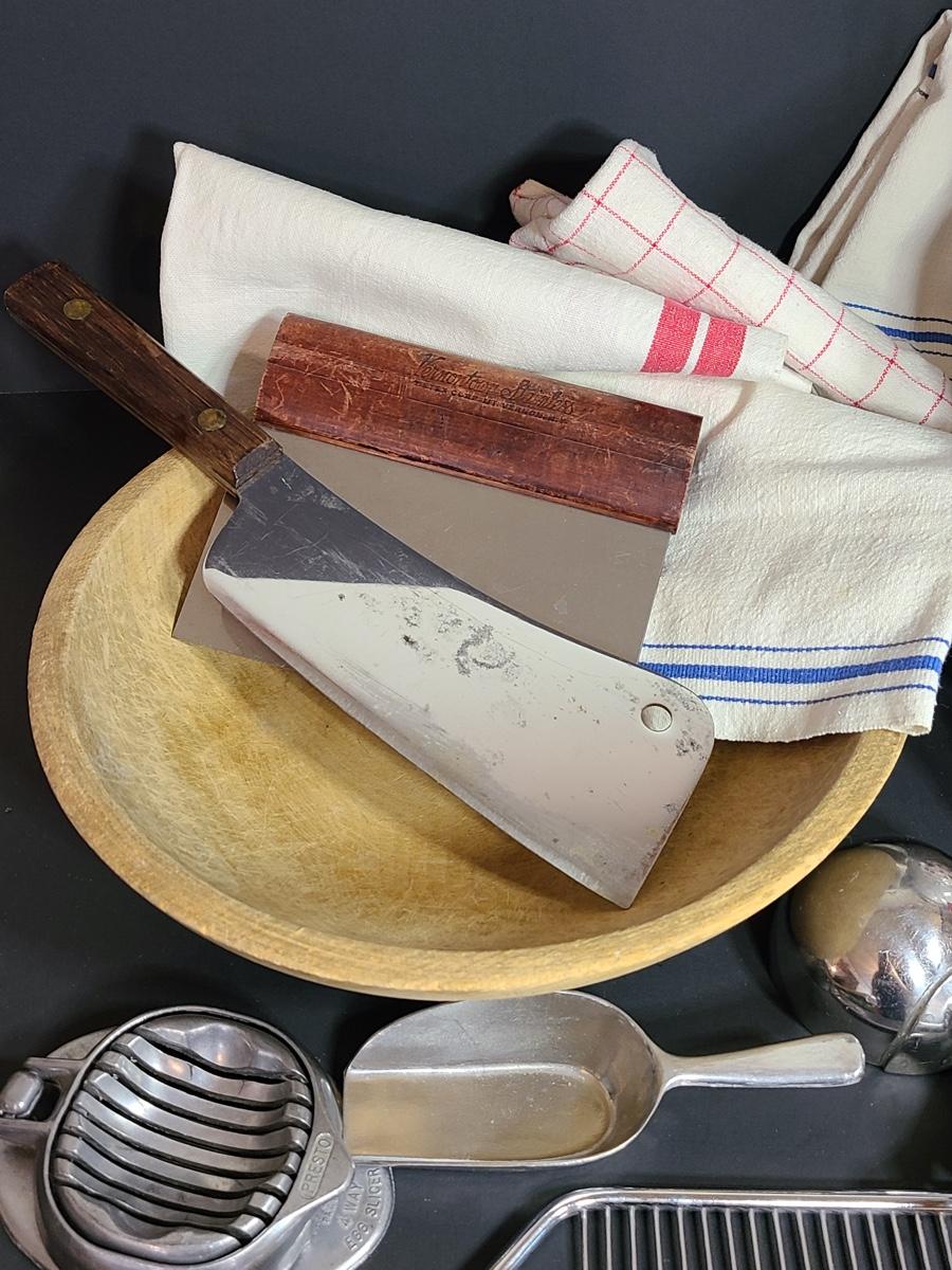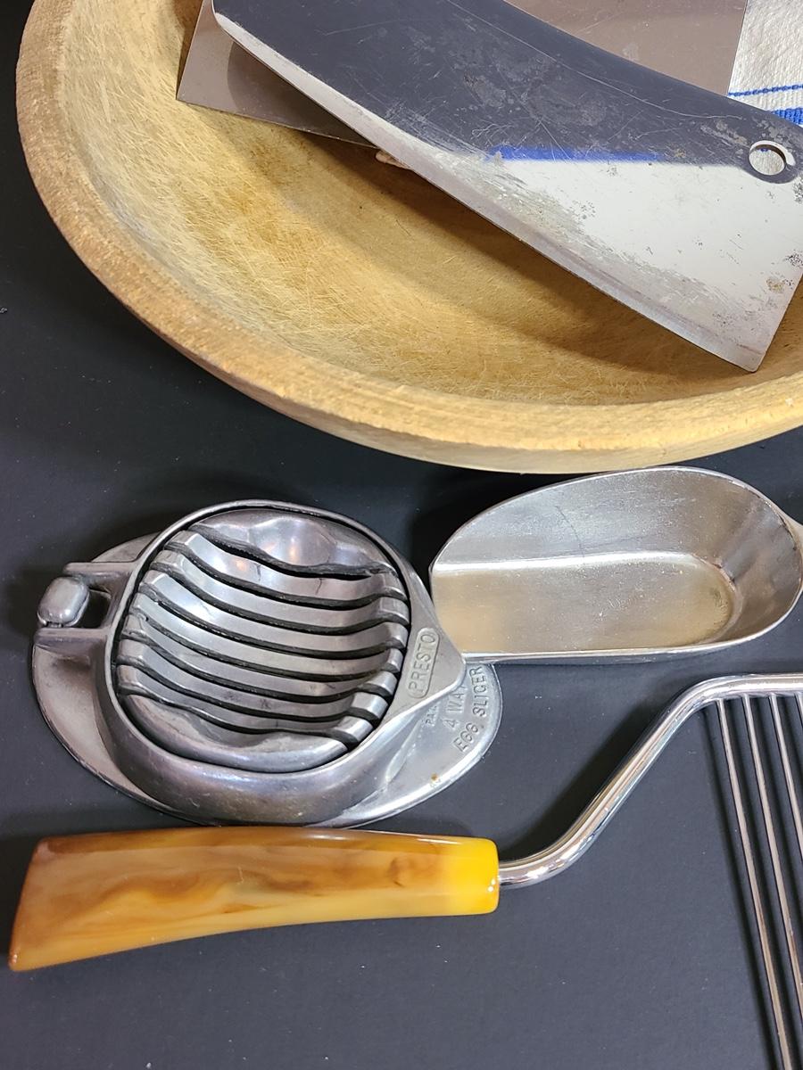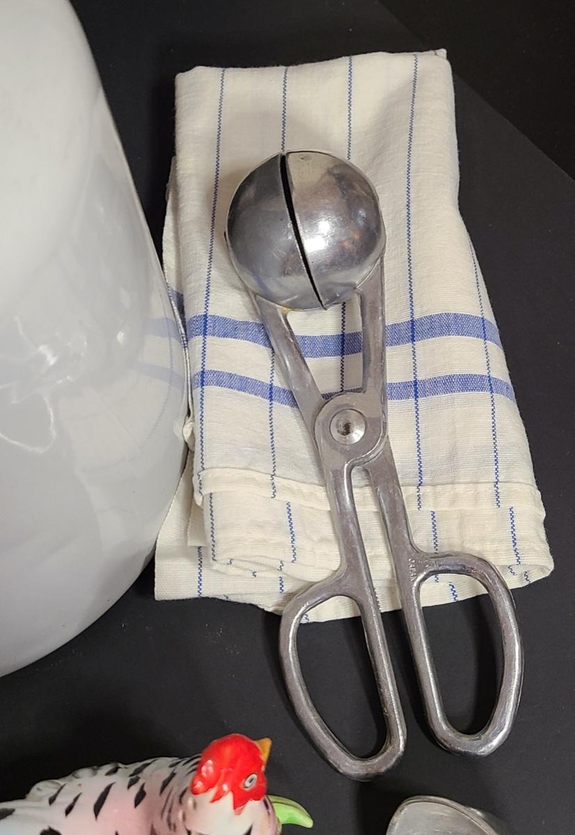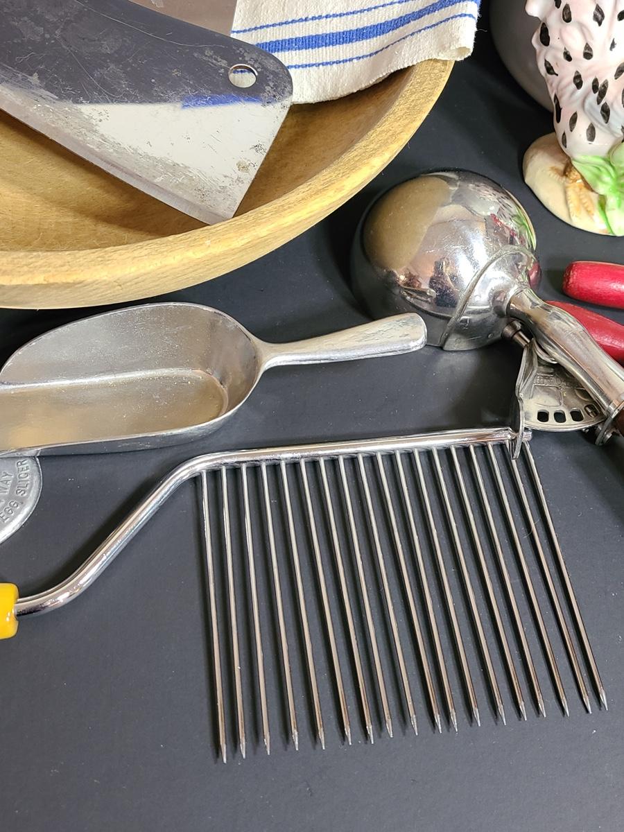 Vintage/Antique lot of kitchen items including: Enamel Metal milk can with some minor wear the the enamel at the base, wood primitive dough bowl, rooster salt and pepper set, linen vintage kitchen tools and more. All of these items are pre-owned and may show minor wear. Please see all pictures as they are the best representation of the items. The pictures show condition, measurements if taken, and what is included in the lot. Due to the large amount that we photograph and the time frame, we are not always able to take measurements. All items unless noted, are pre-owned and have been used. If you purchased furniture, you must bring help. We do not allow one person to carry large furniture out on their own. Bring help, tools and a truck for the safety of our client’s homes, and your personal safety. Company policy. Thank you.