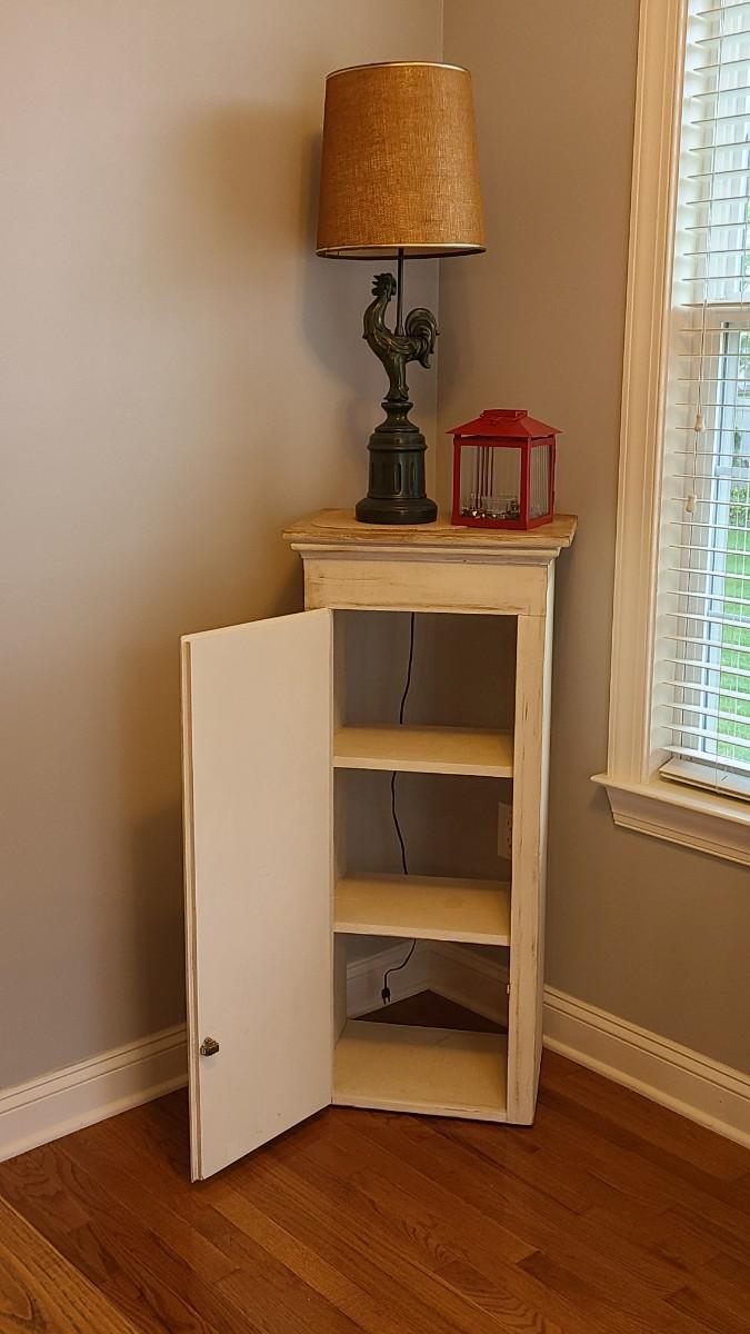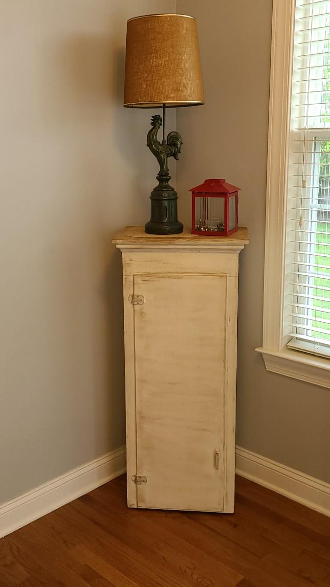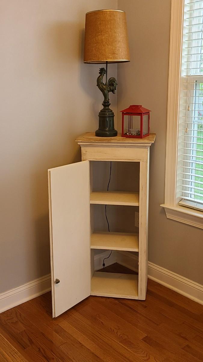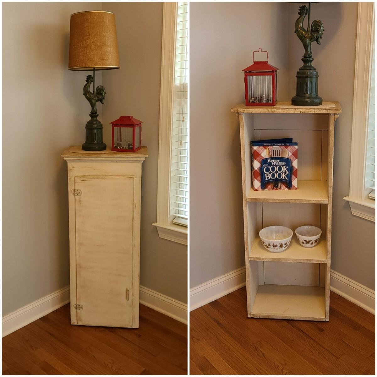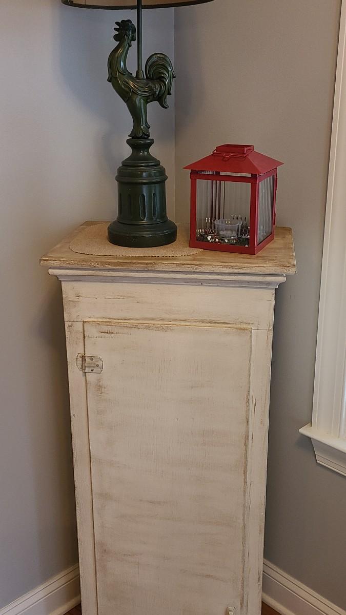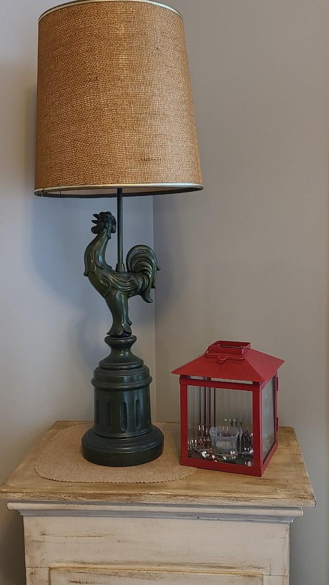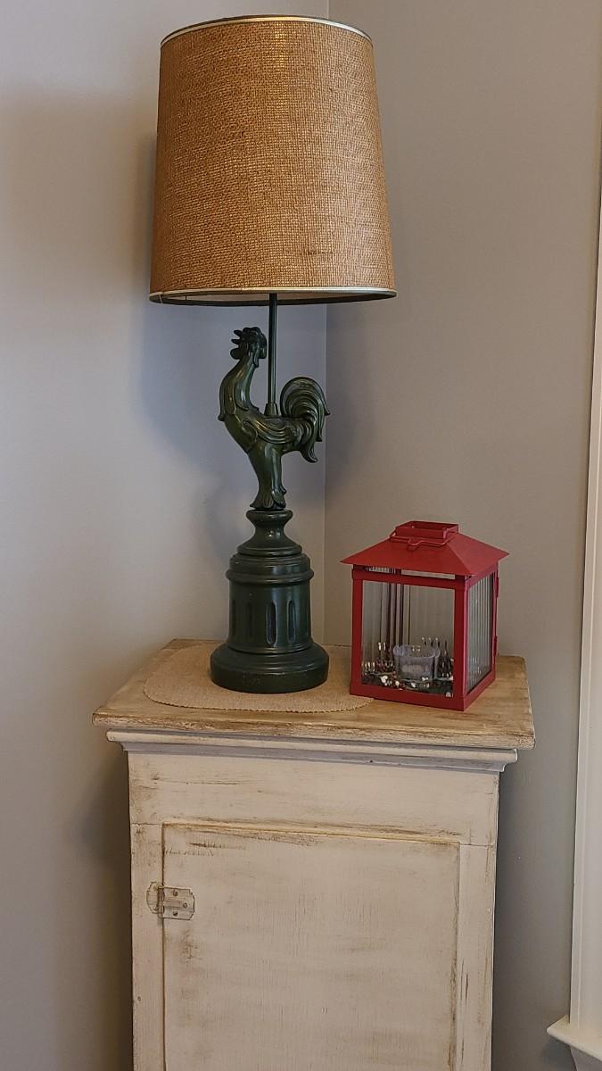 Vintage Metal rooster lamp, upcycled vintage cabinet that is reversible. You can use as a closed cabinet or reverse for bookshelf. Great in an room. 21x 14x 44 inches tall. Primitive, Farmhouse, Shabby Chic look... PLACEMAT,BOWLS & COOKBOOK NOT INCLUDED. Shelf, lamp, and lantern are included. Please see all pictures for content of the lot, condition of the lot, and measurements if taken. Pictures are the best representation of the items listed and items are untested unless indicated in description. Thank you for looking and have fun bidding!