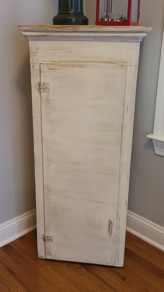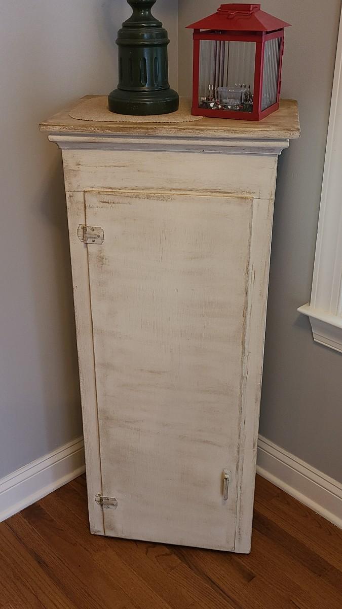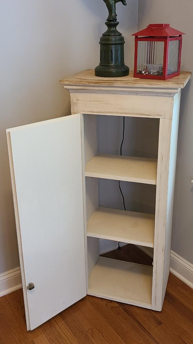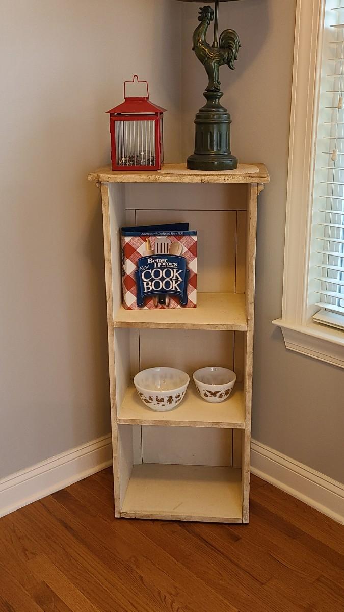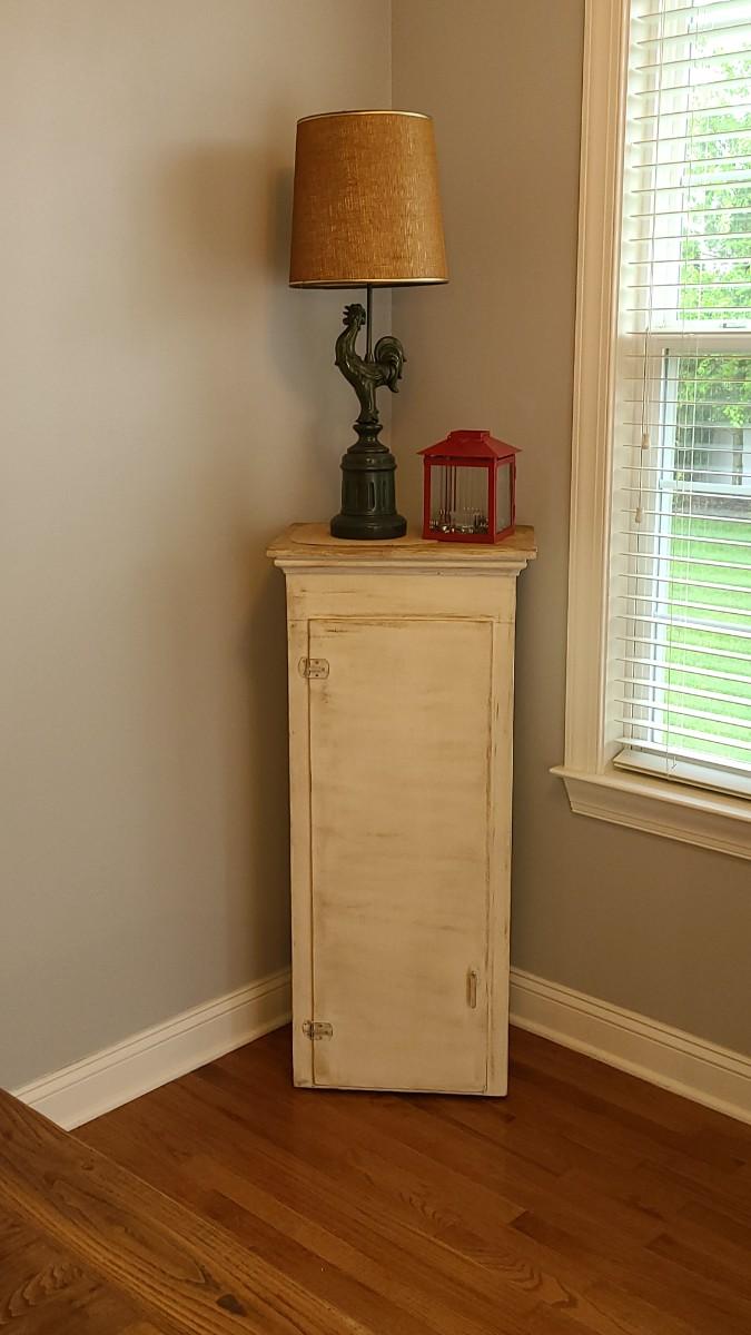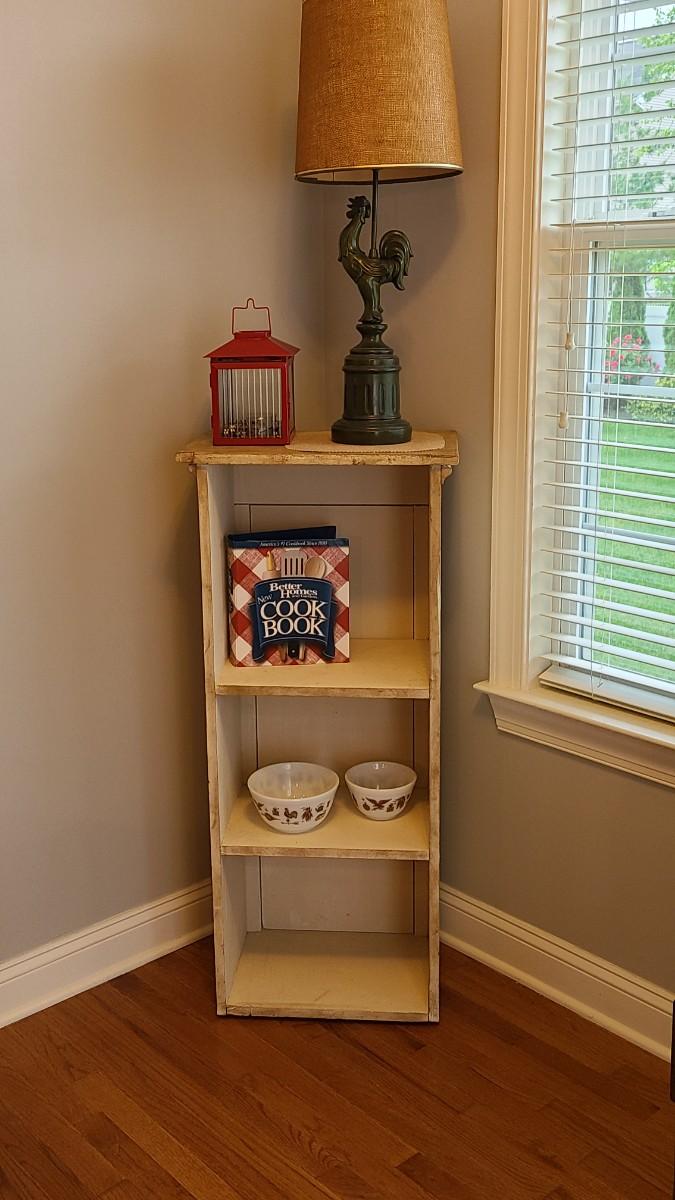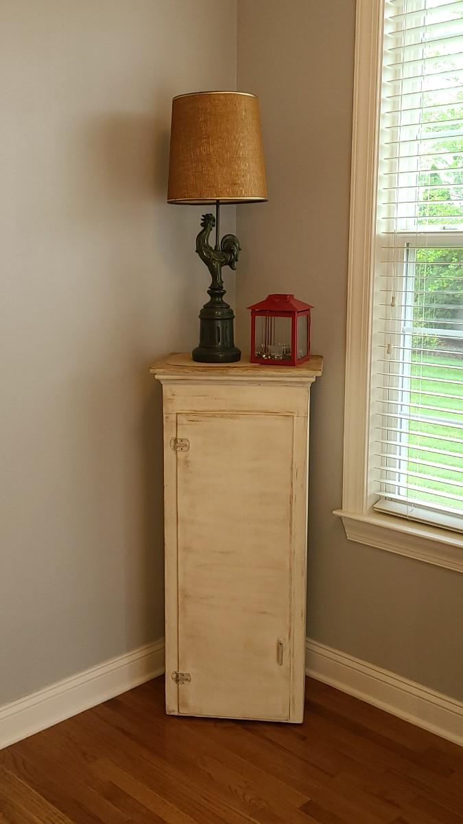 Vintage Metal rooster lamp, upcycled vintage cabinet that is reversible. You can use as a closed cabinet or reverse for bookshelf. Great in an room. 21x 14x 44 inches tall. Primitive, Farmhouse, Shabby Chic look... PLACEMAT,BOWLS & COOKBOOK NOT INCLUDED. Shelf, lamp, and lantern are included. Please see all pictures for content of the lot, condition of the lot, and measurements if taken. Pictures are the best representation of the items listed and items are untested unless indicated in description. Thank you for looking and have fun bidding!