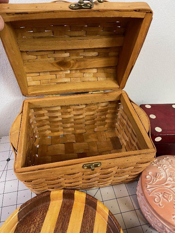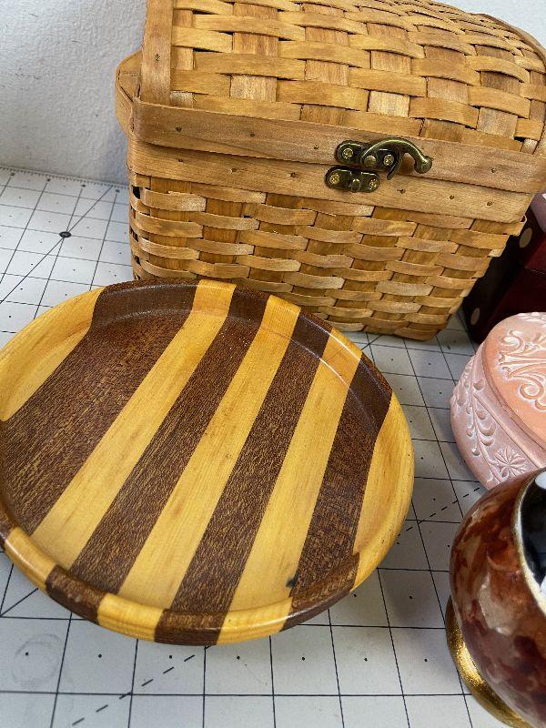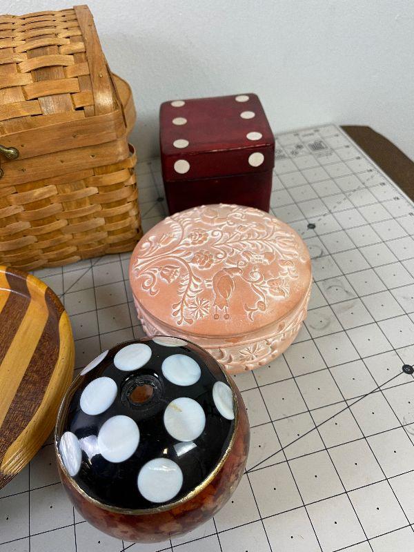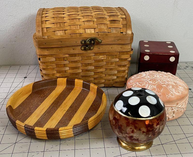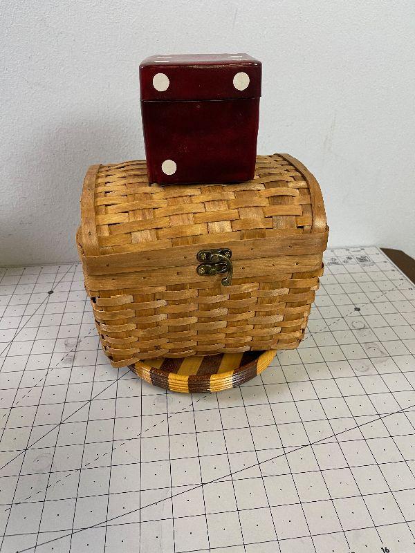 Lot #120 Wicker Basket, bowl, Dice and boxes