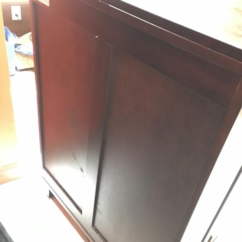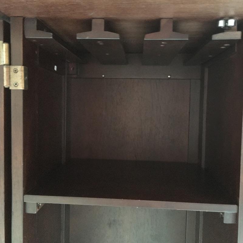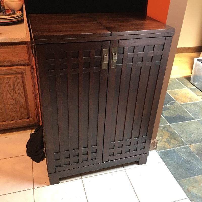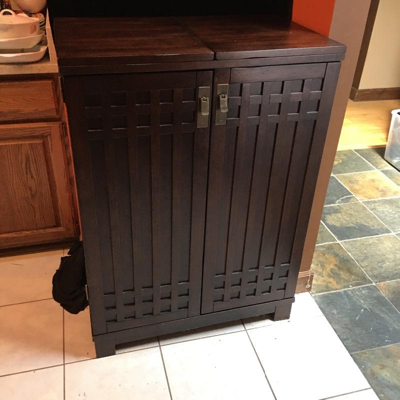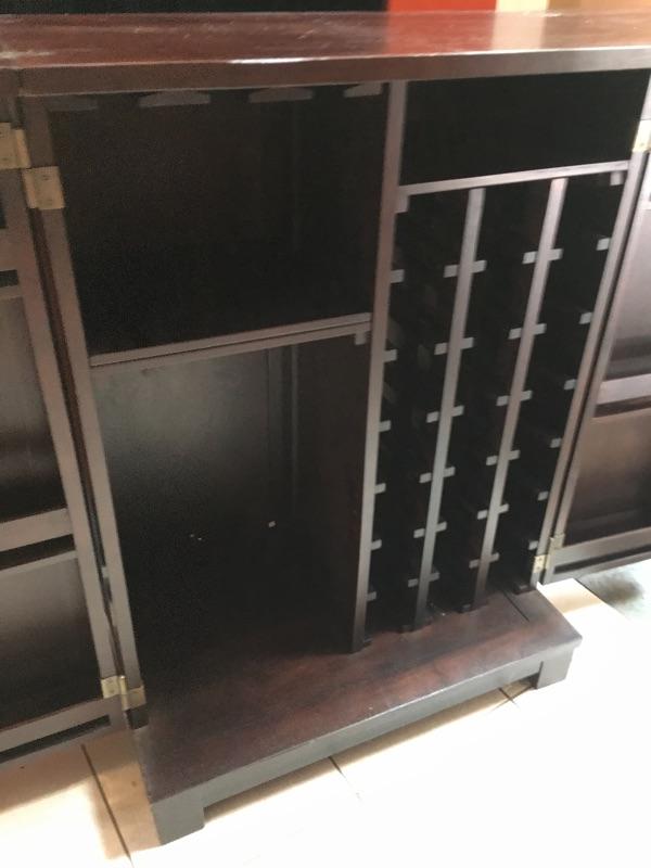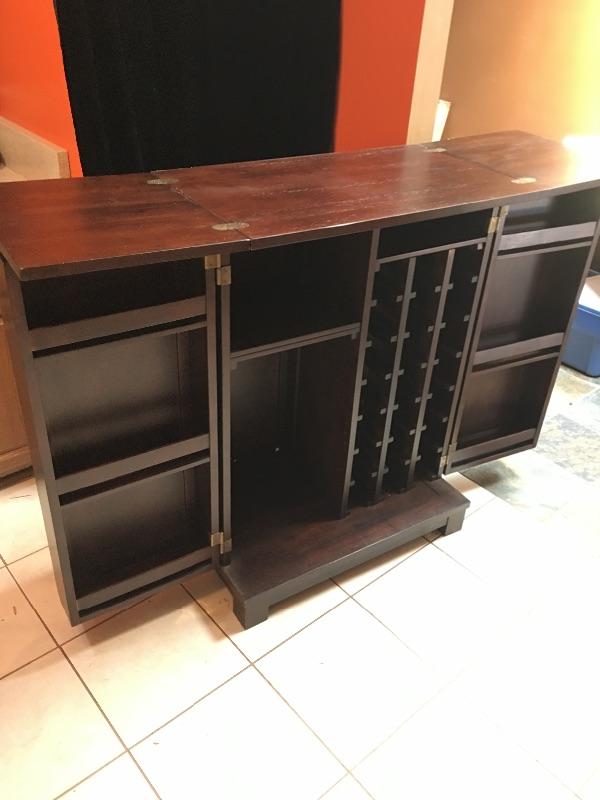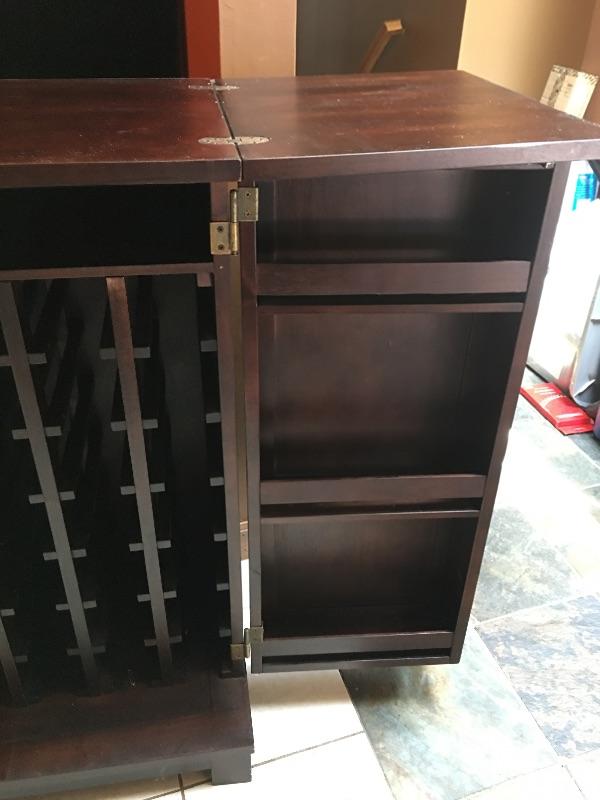 A cool cabinet that keeps all your wine, spirits, glasses and more in one convenient place. Cabinet has two doors that open to reveal shelves, wine racks, glass storage and top unfolds to give you more bar area. Cabinet measures 18” x 30.5” x 42” when closed and 18” x 60.5” x 41.75”.