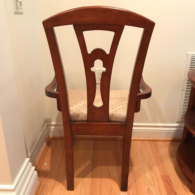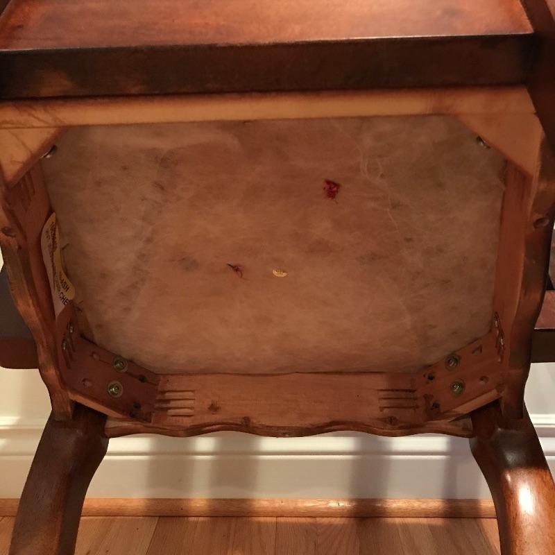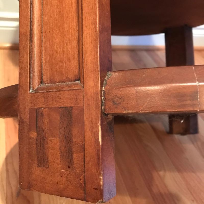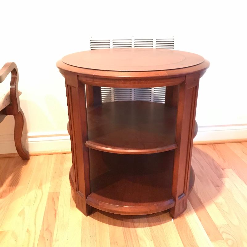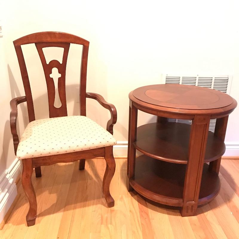 Gorgeous and sturdy round three tiered side table with wood chair. Chair has simple yet stunning designs and minimal wear. Table is of substantial weight and measures 26”d x 27”. Matched up with the table is a comfortable wood chair. Chair also appears high quality with nice upholstery on the cushion seat. Chair measures 23” x 20” x 41”. See photos. No shipping.