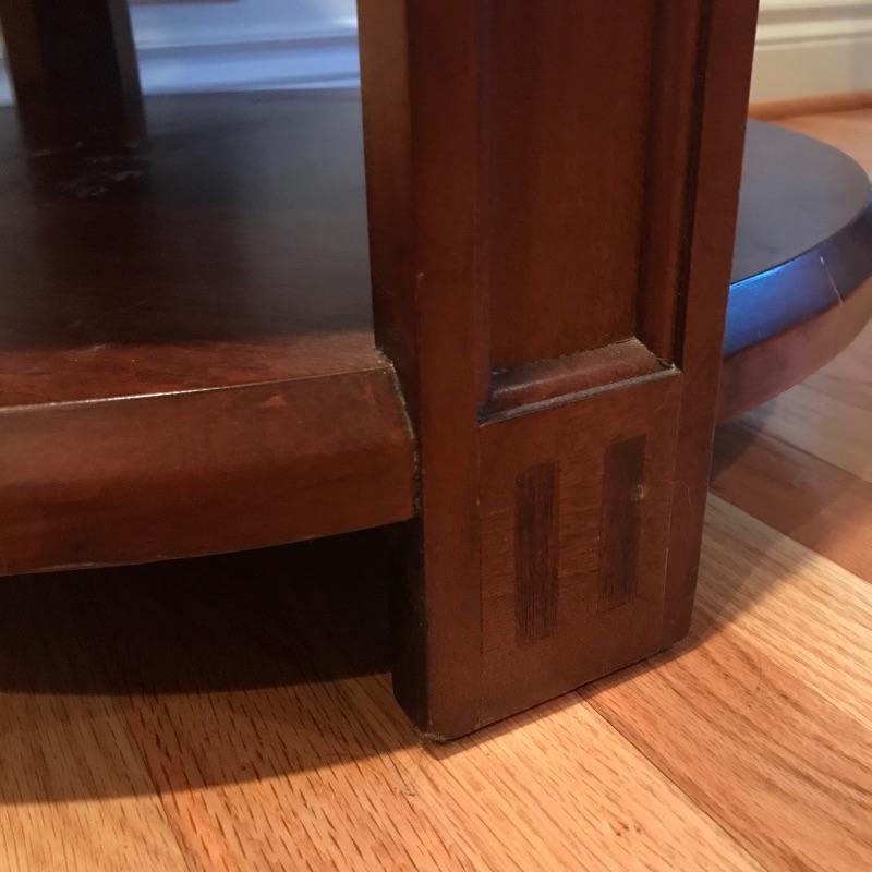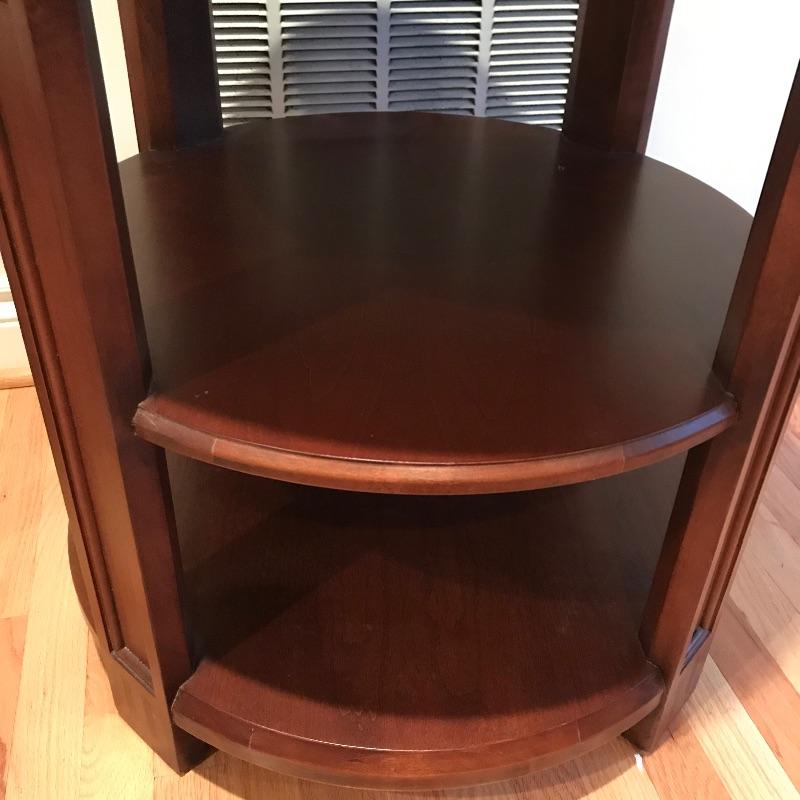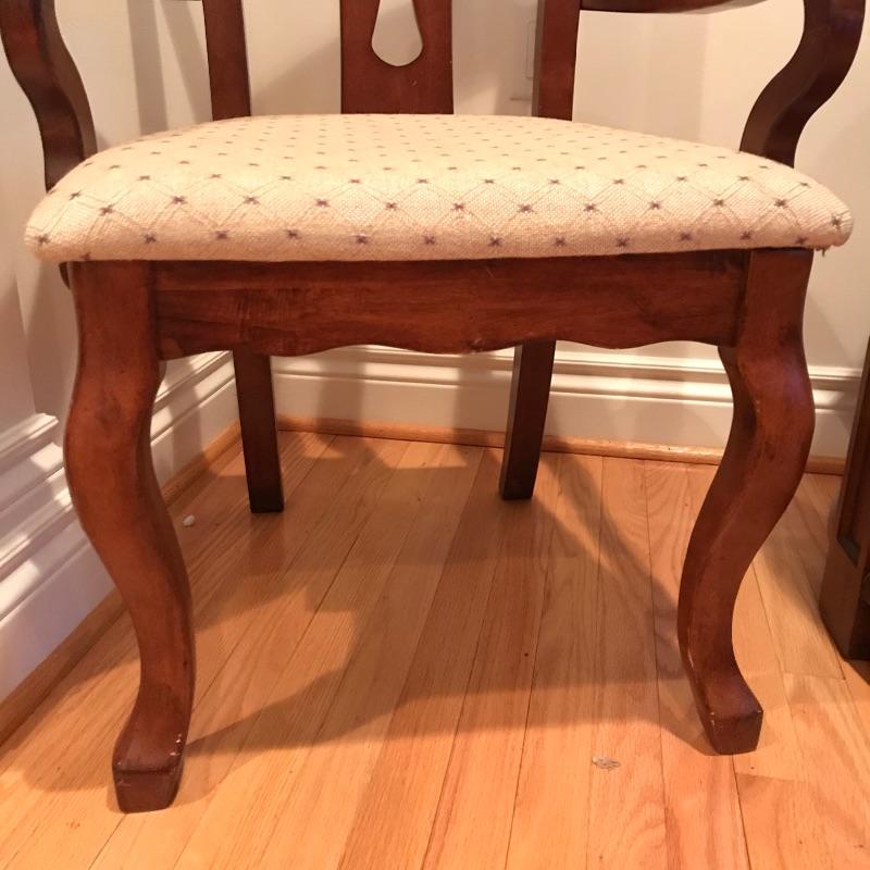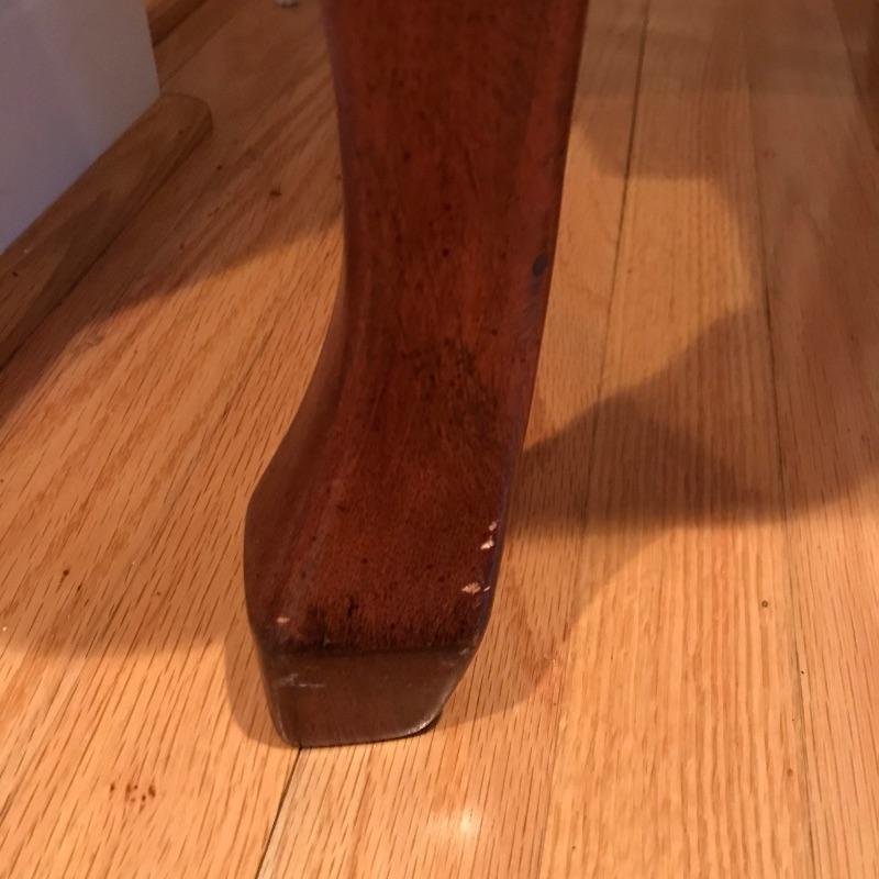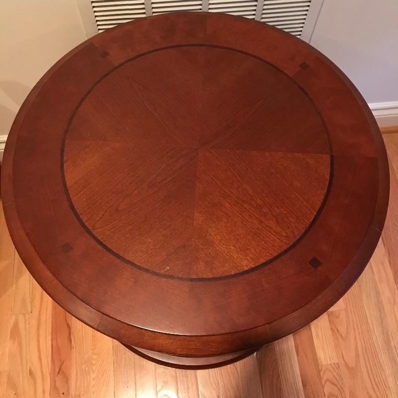 Gorgeous and sturdy round three tiered side table with wood chair. Chair has simple yet stunning designs and minimal wear. Table is of substantial weight and measures 26”d x 27”. Matched up with the table is a comfortable wood chair. Chair also appears high quality with nice upholstery on the cushion seat. Chair measures 23” x 20” x 41”. See photos. No shipping.