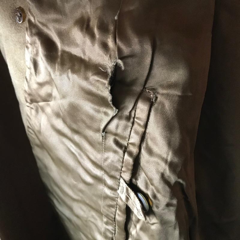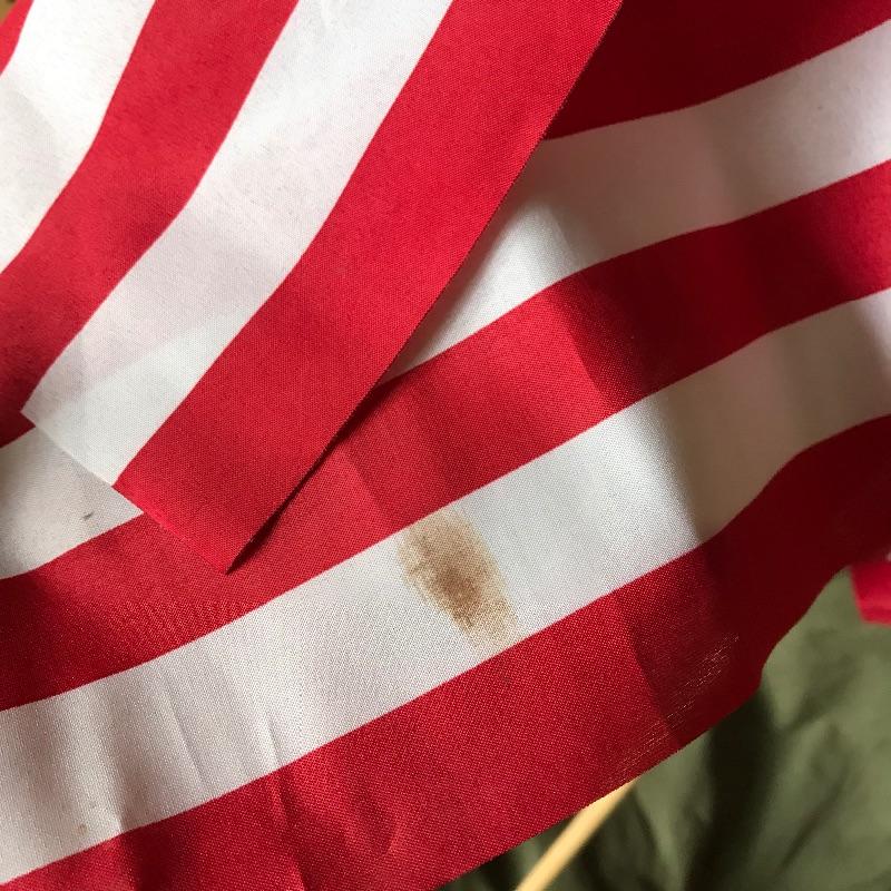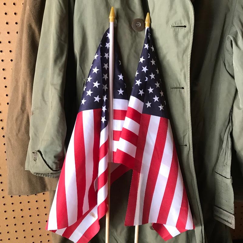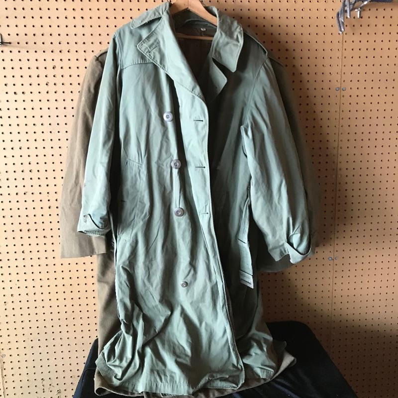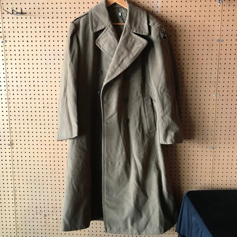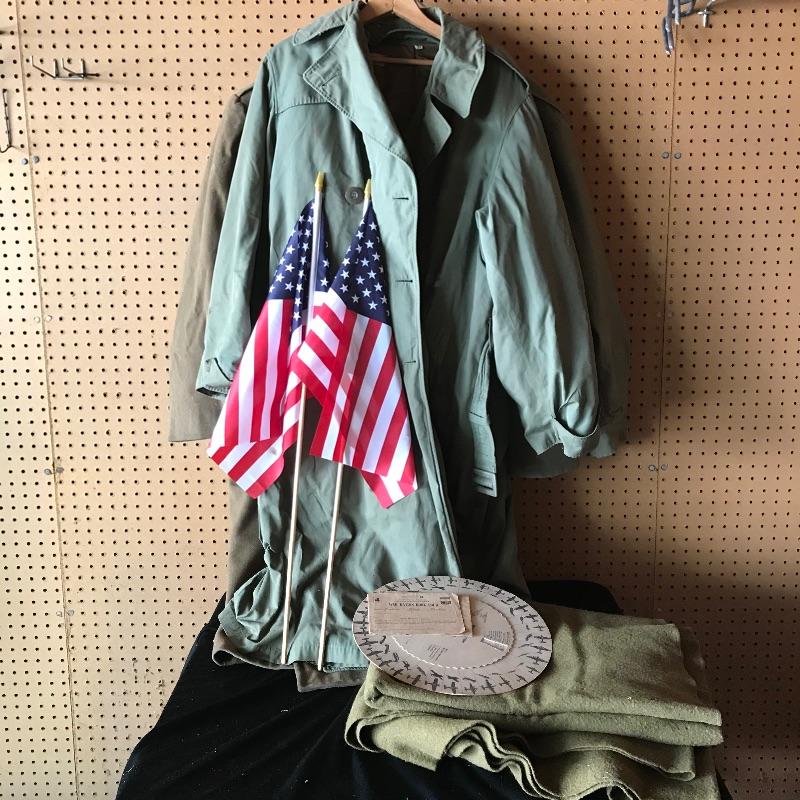 Wow. A double breasted Army Officer’s regulation Overcoat with a 94th Infantry patch. This coat is in amazing condition, it needs a good cleaning and a small hole in the lining stitched. Two other army coats, one size 42L, included in lot along with a green US wool like blanket. The two longer coats have removable lining and the shorter coat has its lining sewn in. Lot also features a rations book from WWII and more. See photos. Box shown in photos doesn’t quite fit the length of the flags and measures approximately 26.5” x 18.5” x 12.5” for reference. Shipping available, but please note lot may be costly due to size and weight. Please call UPS at 828-252-6930 for a quote prior to bidding.