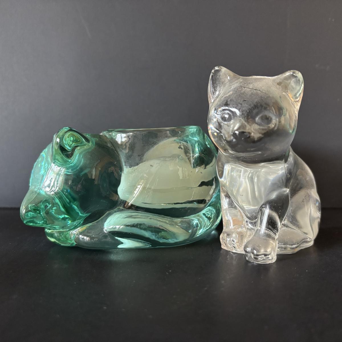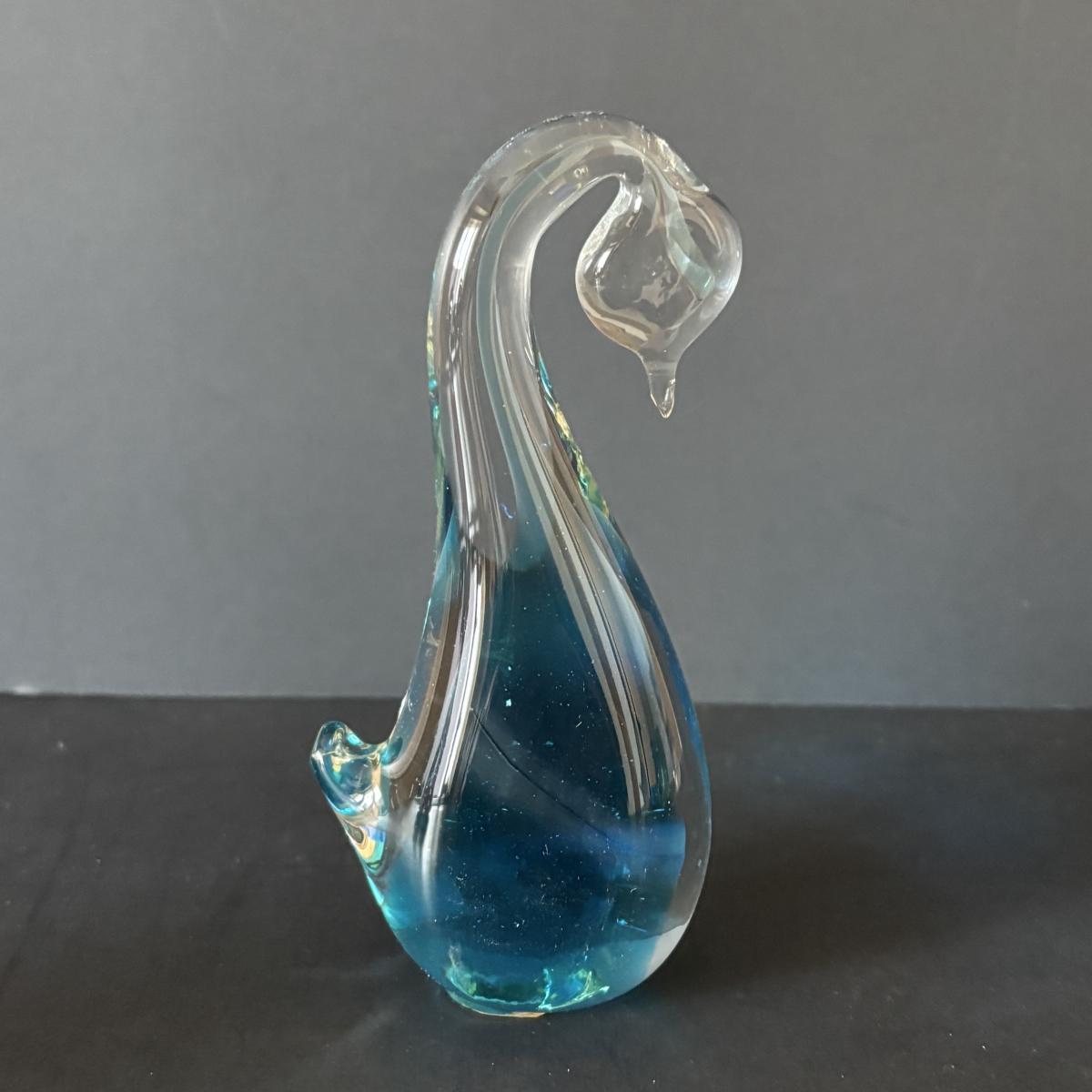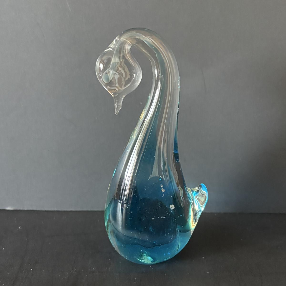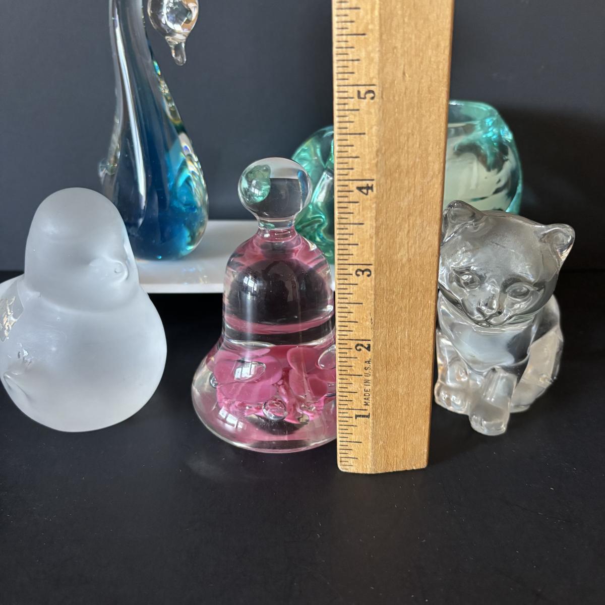 LOT 40: Art Glass Collection: Frosted Viking Glass Bird, Joe St. Claire Bell Shaped Paper Weight, Cat and Swan