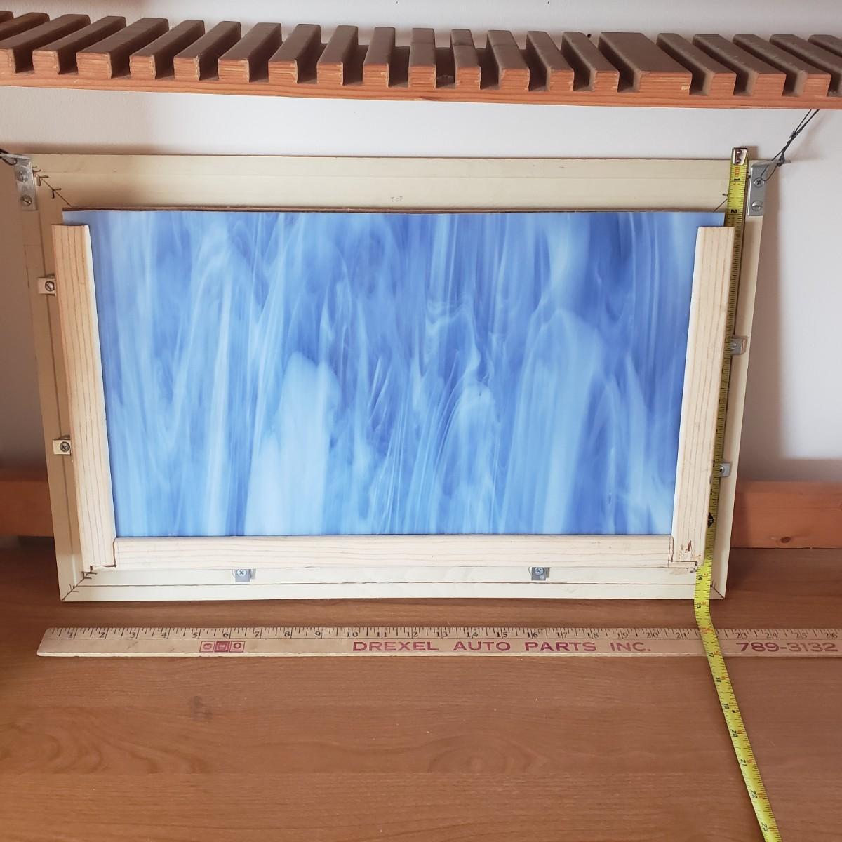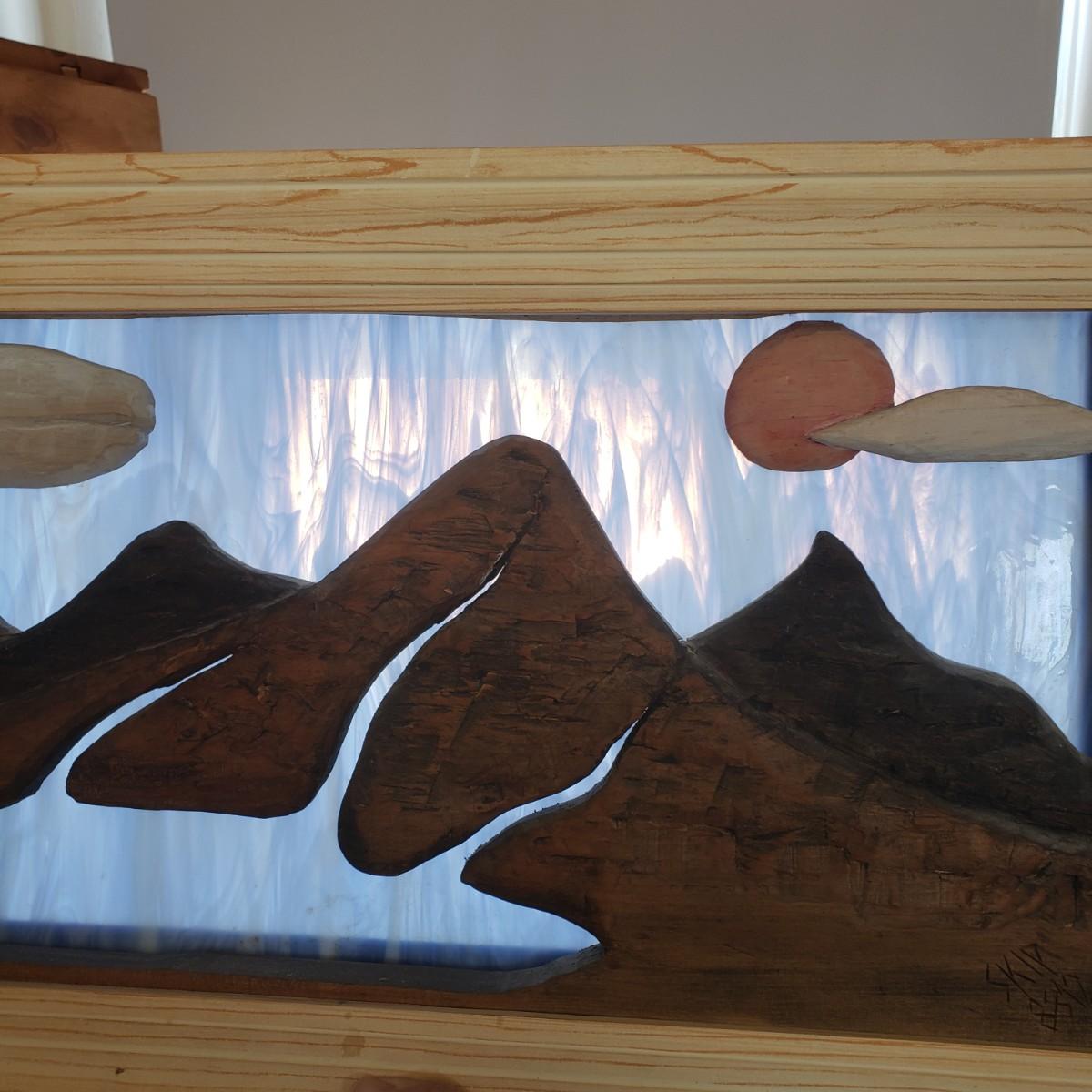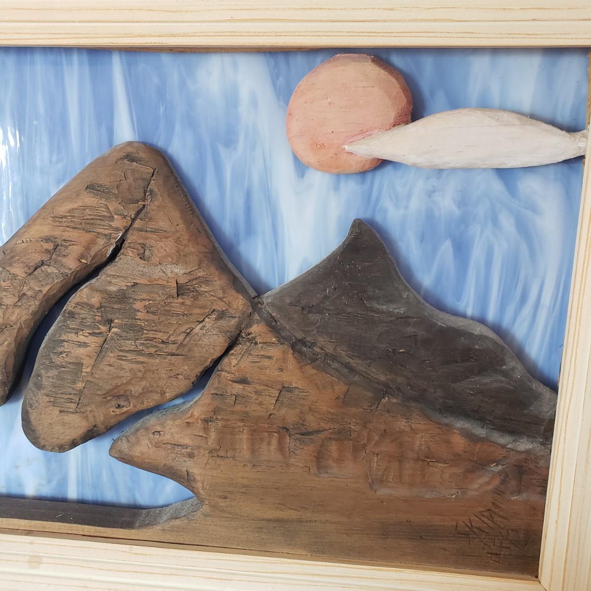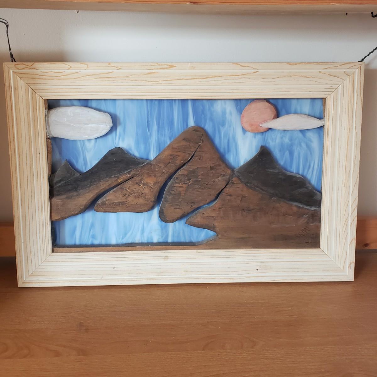 LOT 150: Slag Glass & Wood Mountain Scene Hanging Art
