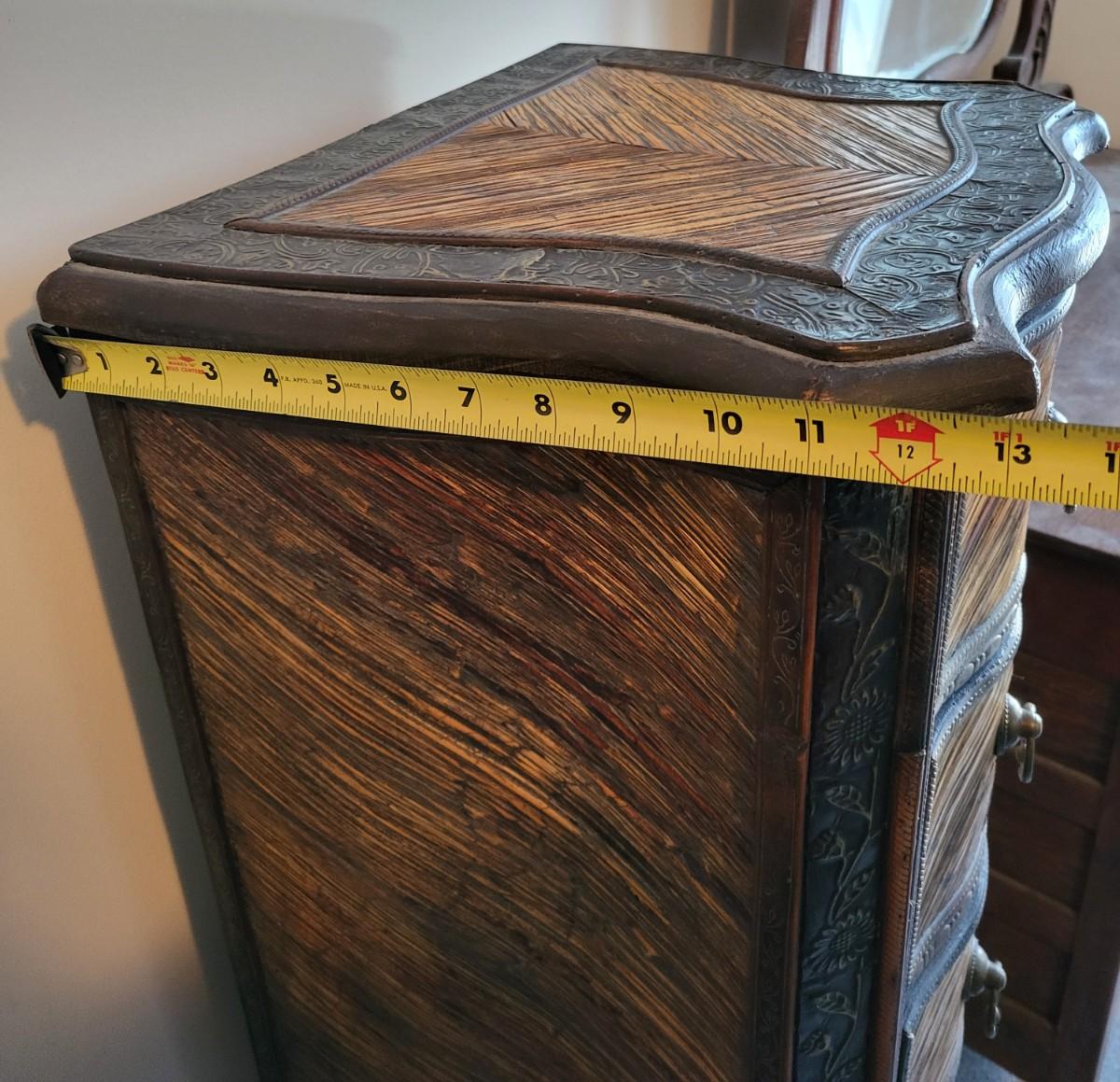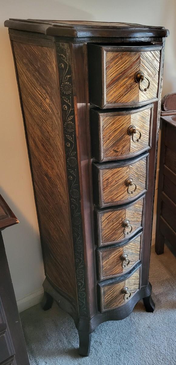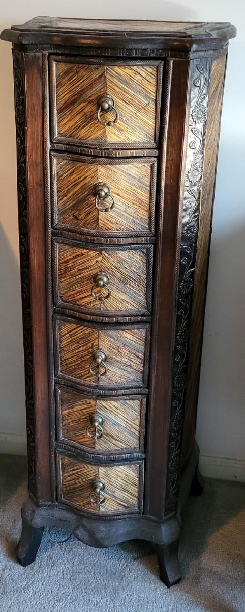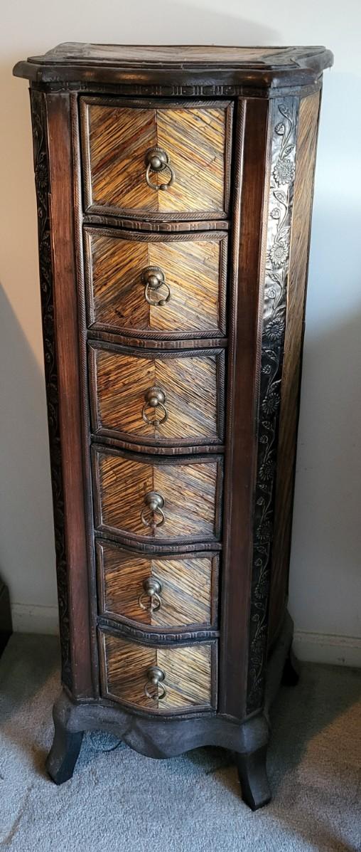 LOT 24M: Tall Slender Dark Wood Cabinet w/ 6 Rattan Drawers