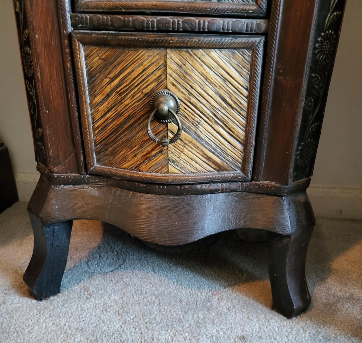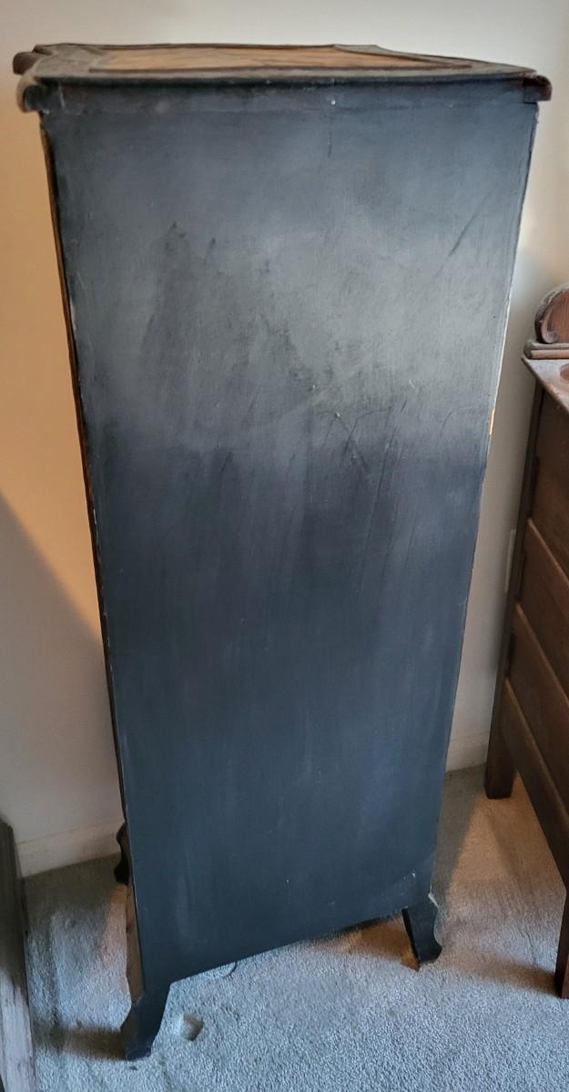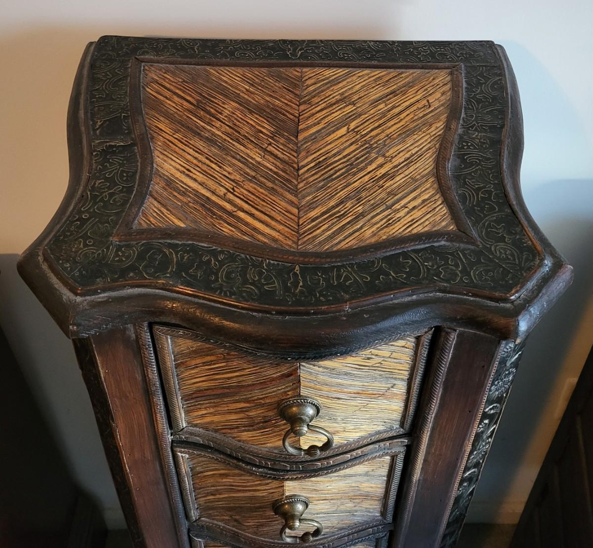 LOT 24M: Tall Slender Dark Wood Cabinet w/ 6 Rattan Drawers