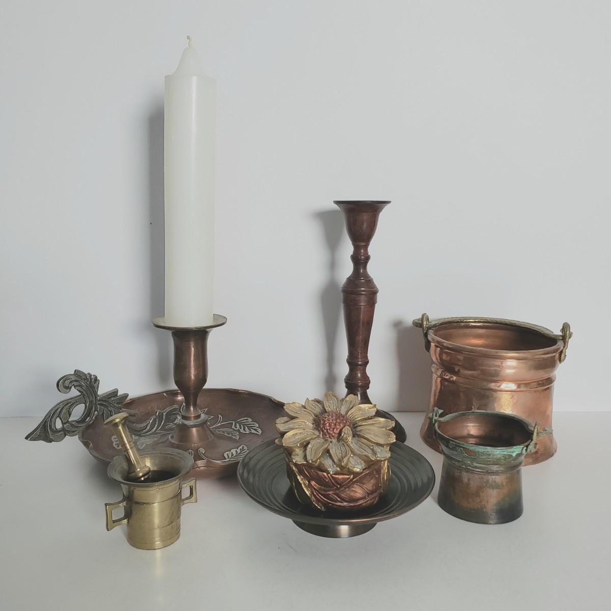 LOT 48F: Collection of Brass & Copper-Mortar & Pestle, Trinket Dishes, Candlesticks & More