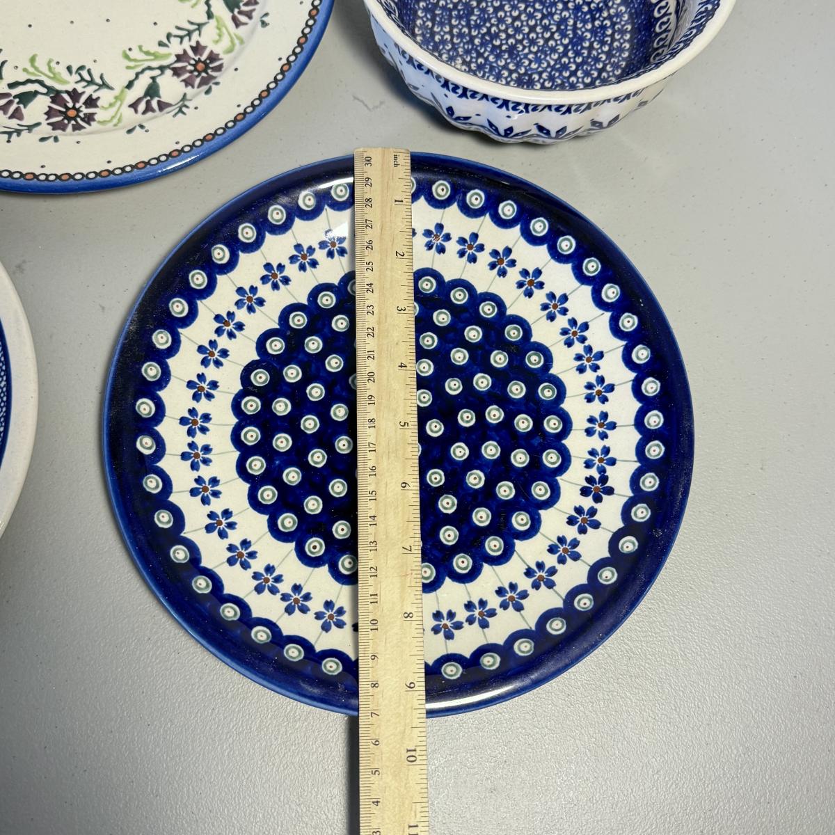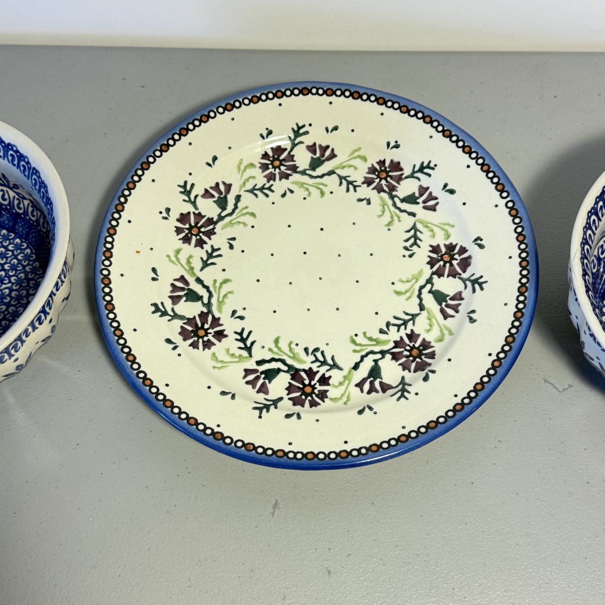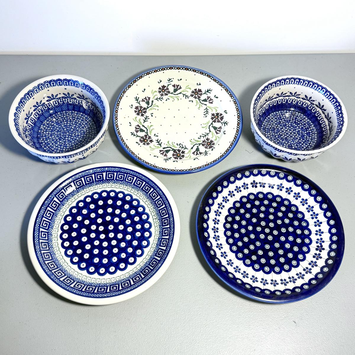 LOT 62K: Boleslawiec Handmade Polish Pottery: Two Blue Lace Bowls & Grecian Peacock, Flowering Peacock & Traditional Floral Design Plates
