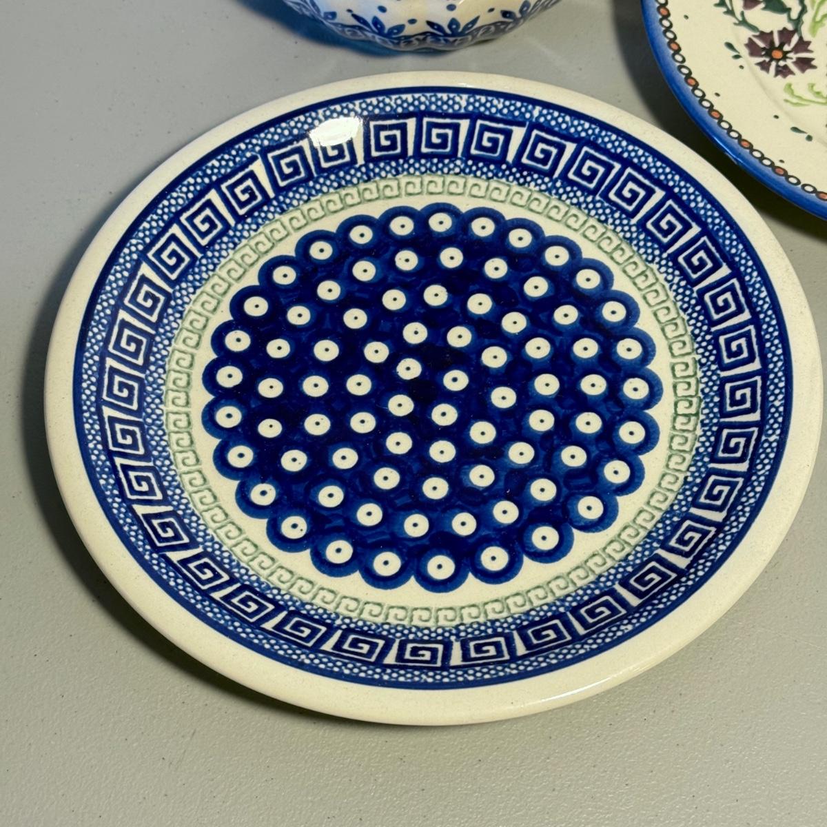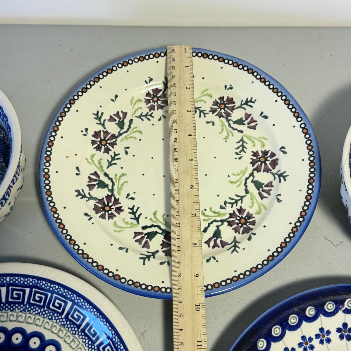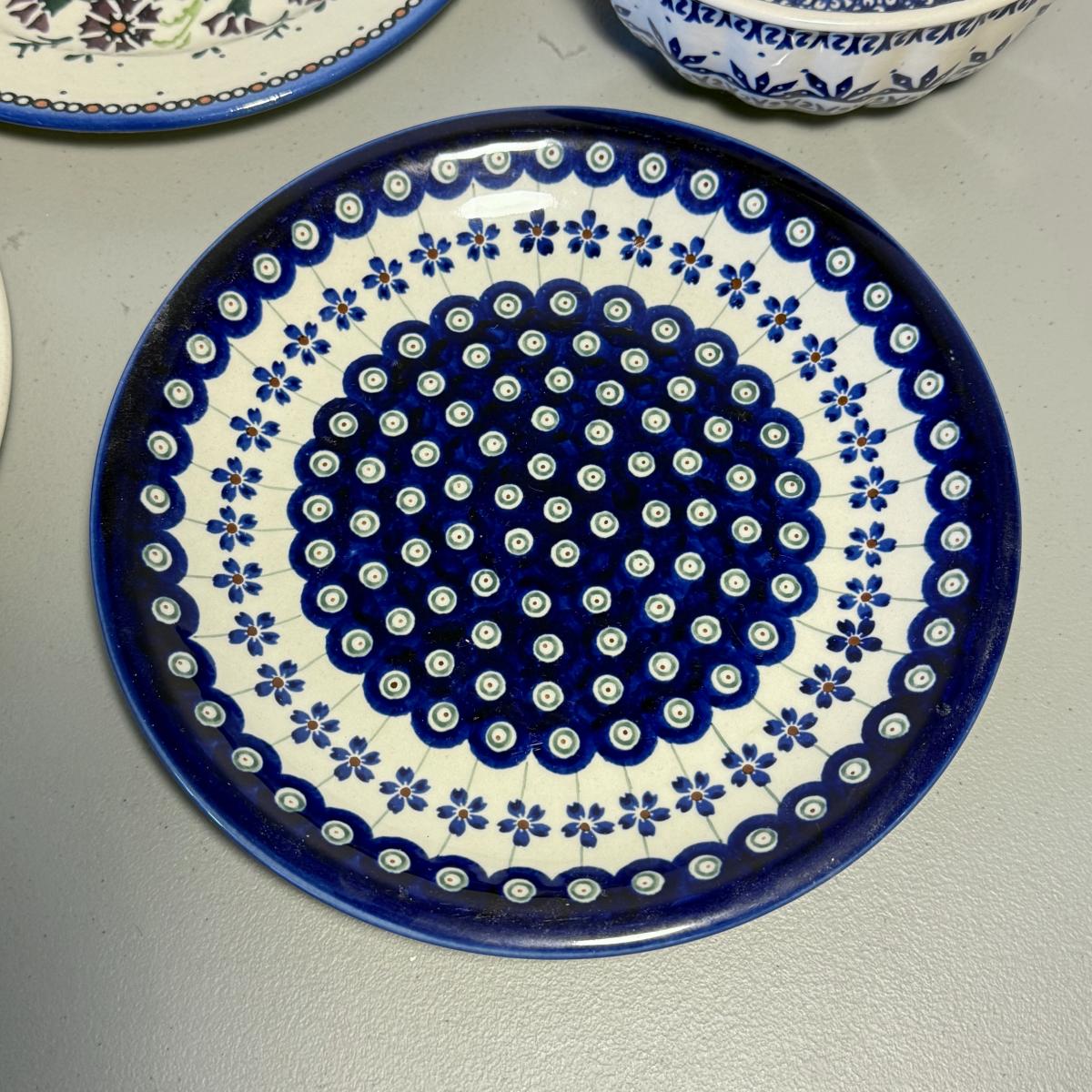 LOT 62K: Boleslawiec Handmade Polish Pottery: Two Blue Lace Bowls & Grecian Peacock, Flowering Peacock & Traditional Floral Design Plates