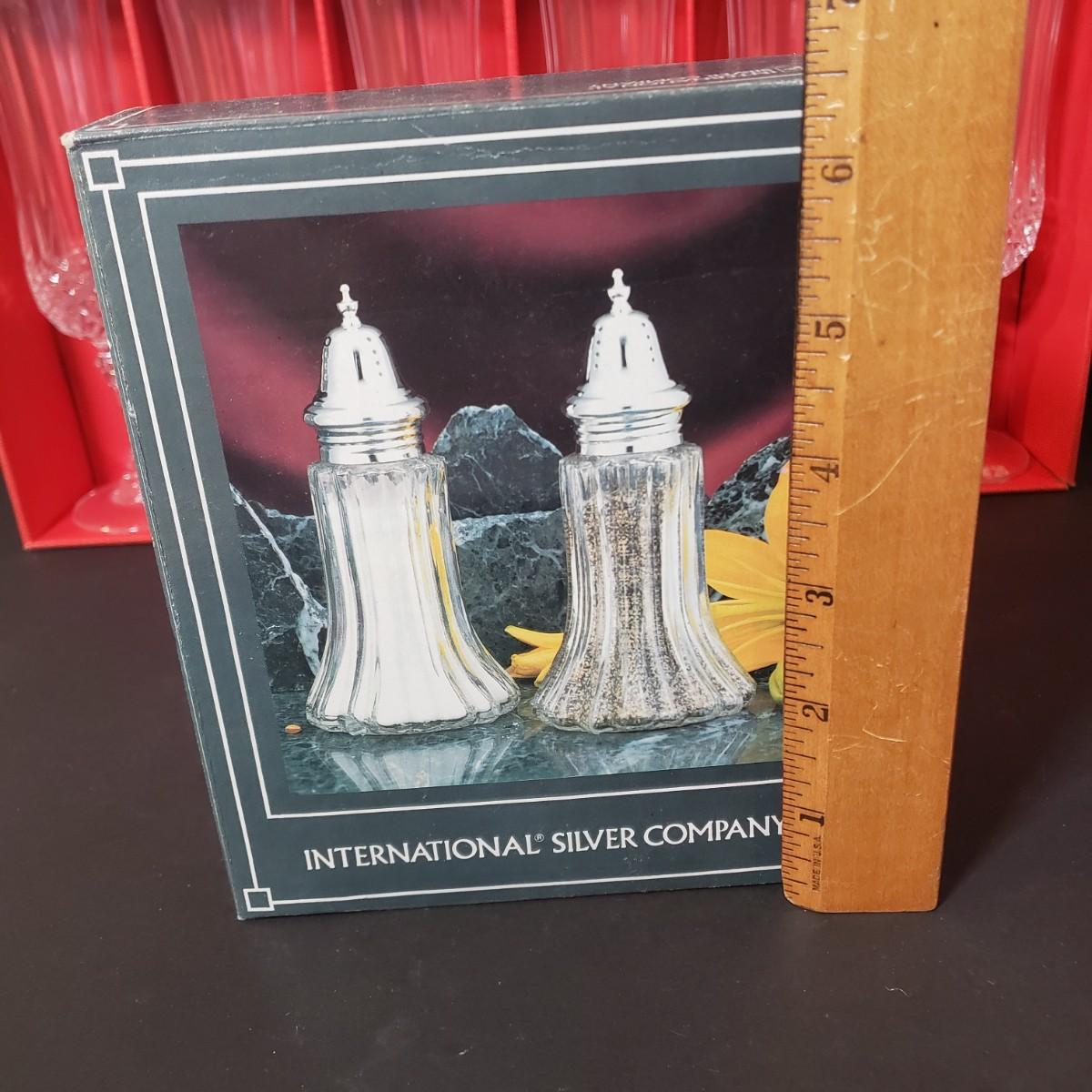 LOT 151L: Crystal Knife & Cake Server, Stemware Set in Box & Intl Silver Co Salt & Pepper Shakers