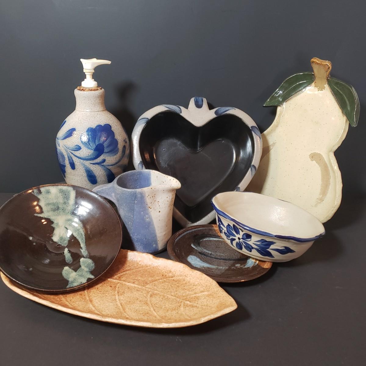LOT 156L: Rowe Pottery Heart Dish, Salmon Falls Soap Dispenser, Watson Pottery Pear Dish & More