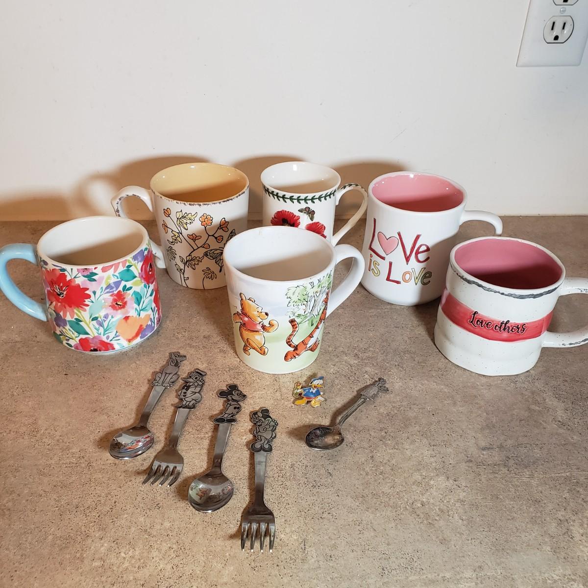 LOT 200K: Walter Baker & Co Hot Cocoa Spoon, Disney Spoons, Donald Duck Pin with Collection of Vibrant Mugs