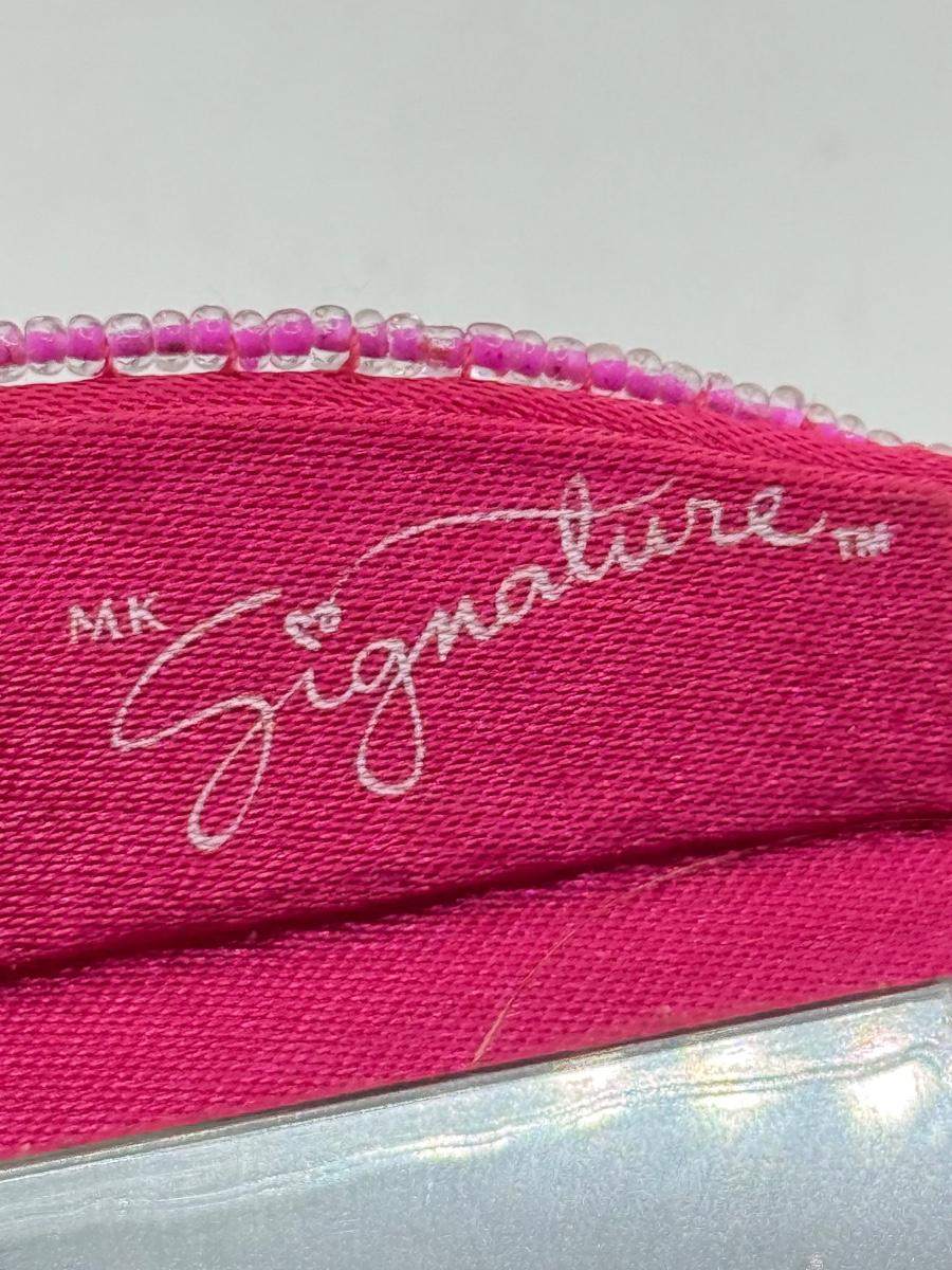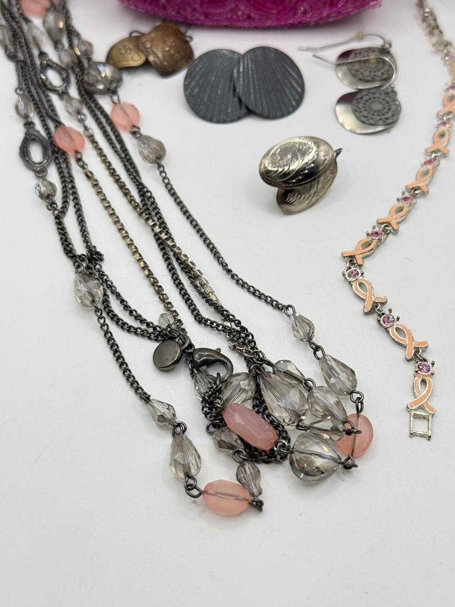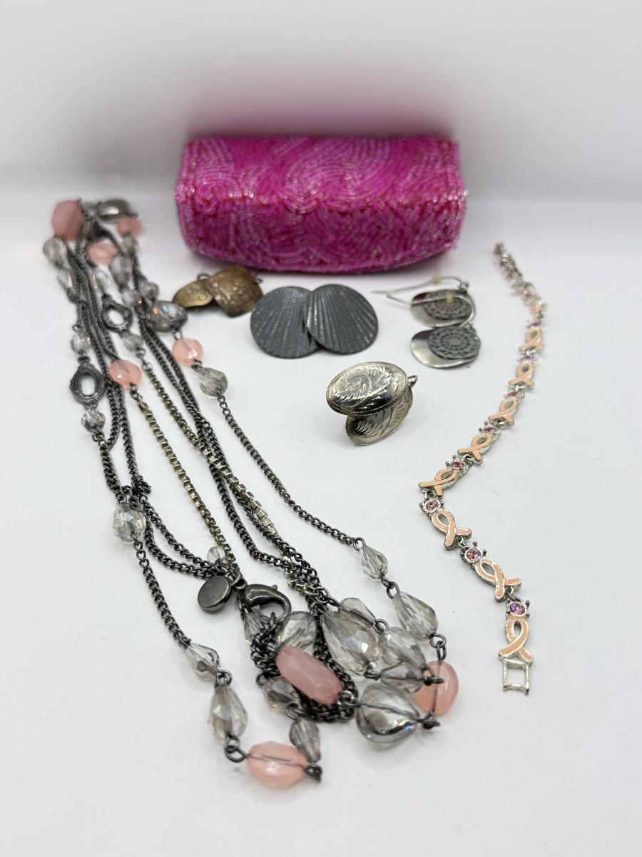 LOT 228J: Breast Cancer Awareness Pink Ribbon Tennis Bracelet, Pierced Earrings, Necklace & MK Signature Lipstick Case