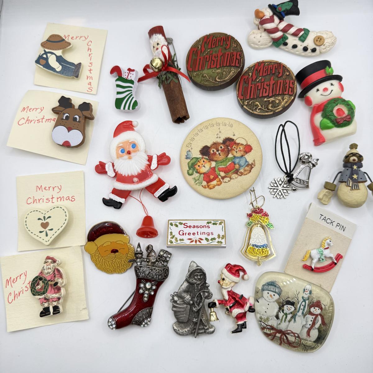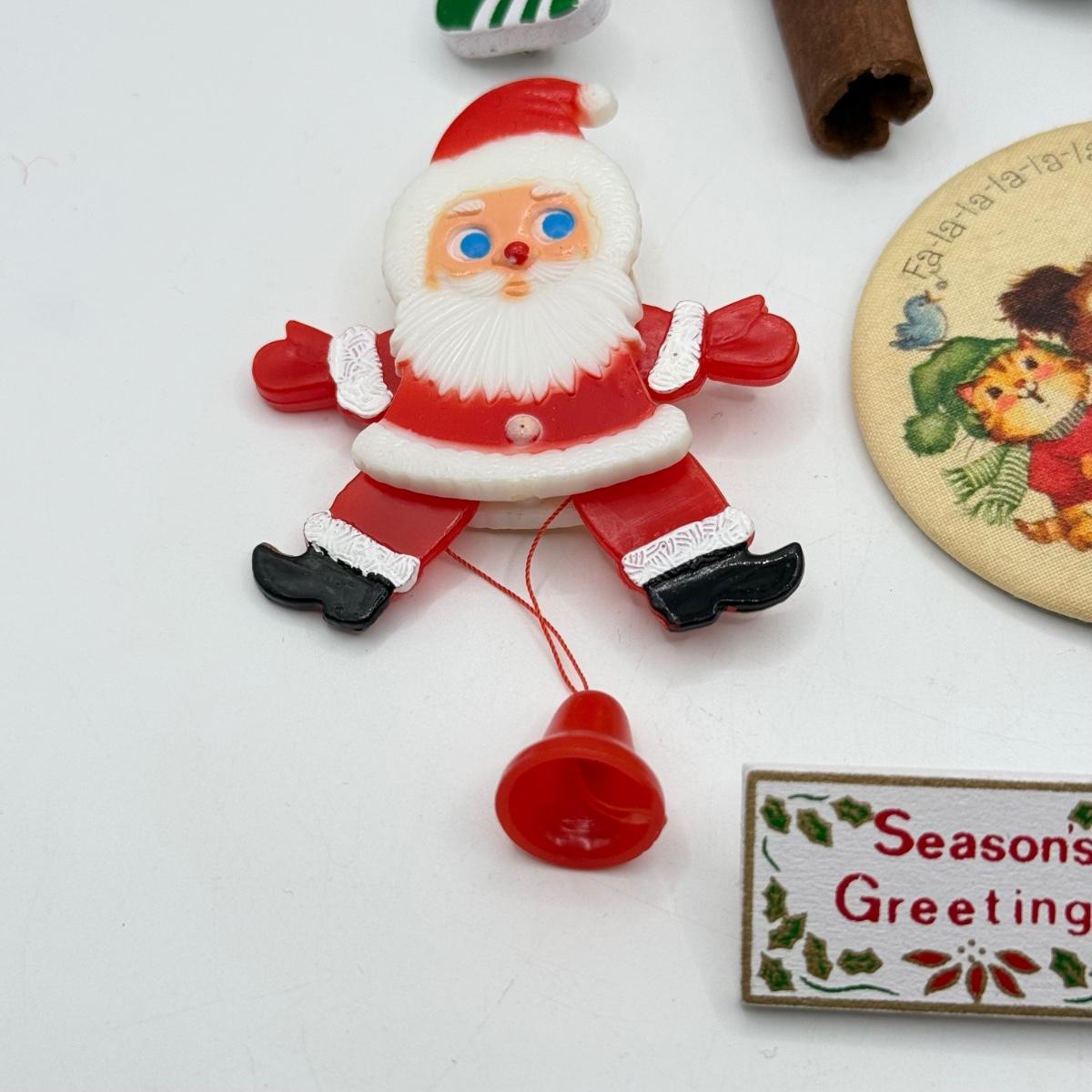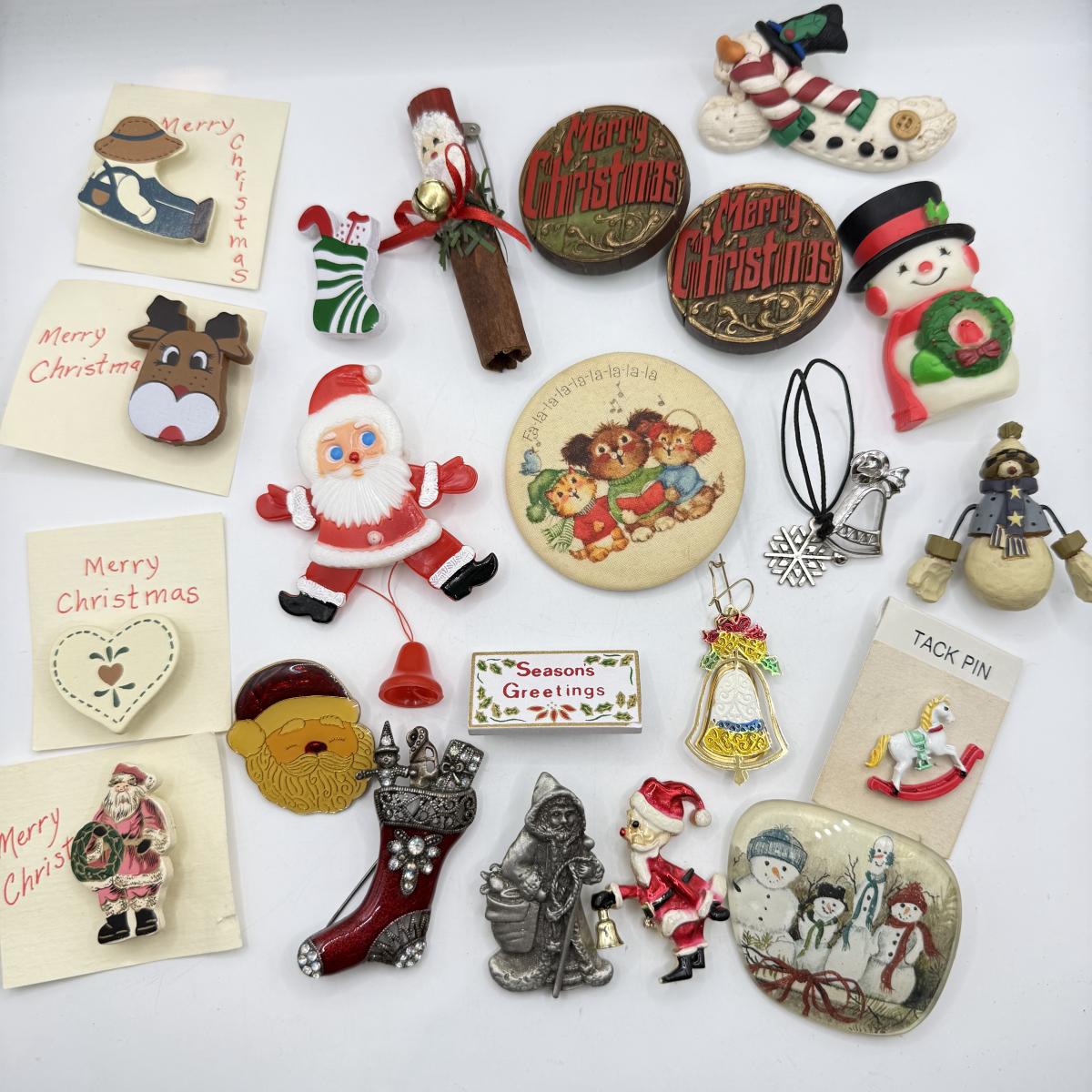 LOT 235J: Merry Christmas Pin Collection: Handmade, Hallmark, Vintage Plastic Pull String & More