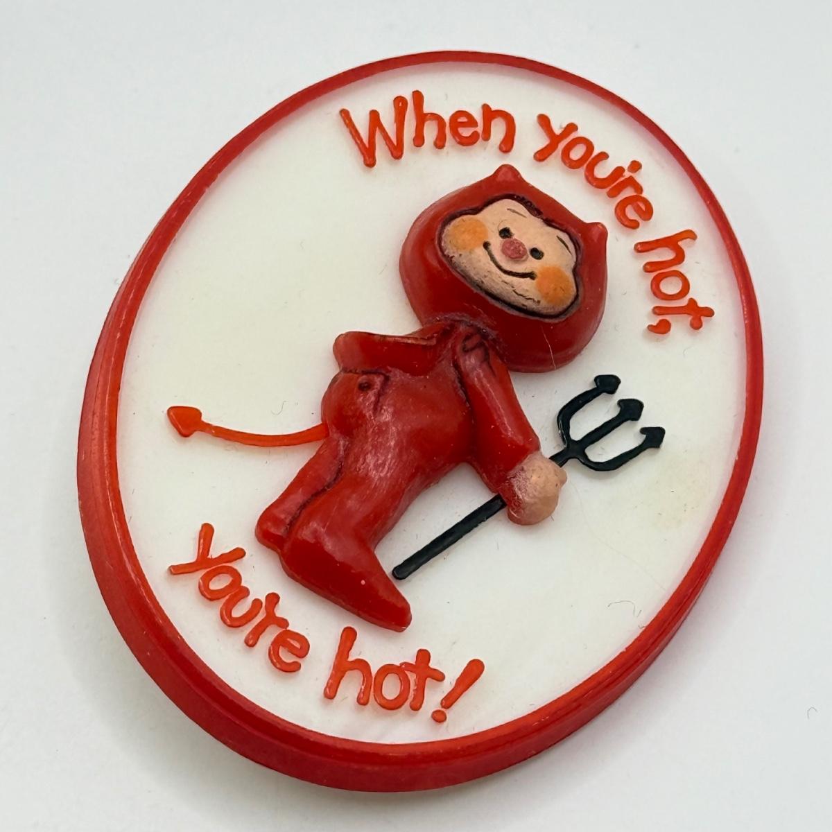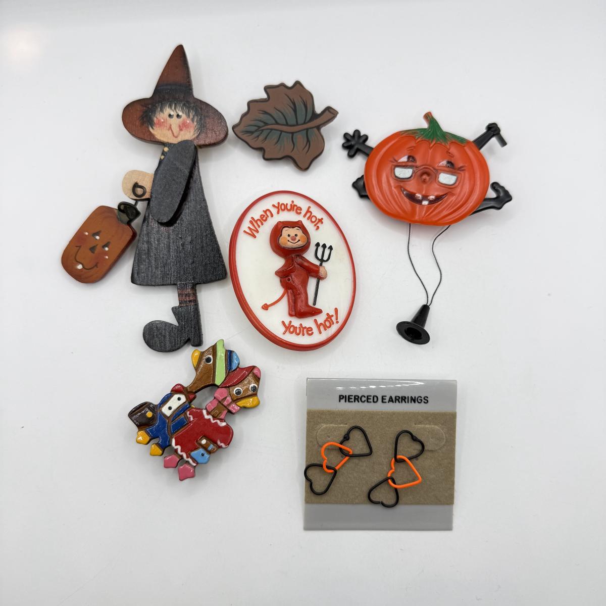 LOT 238J: 1980s Hallmark "When You're Hot, You're Hot!" Devil Pin, Pull String Plastic Pumpkin w/ Glasses & More