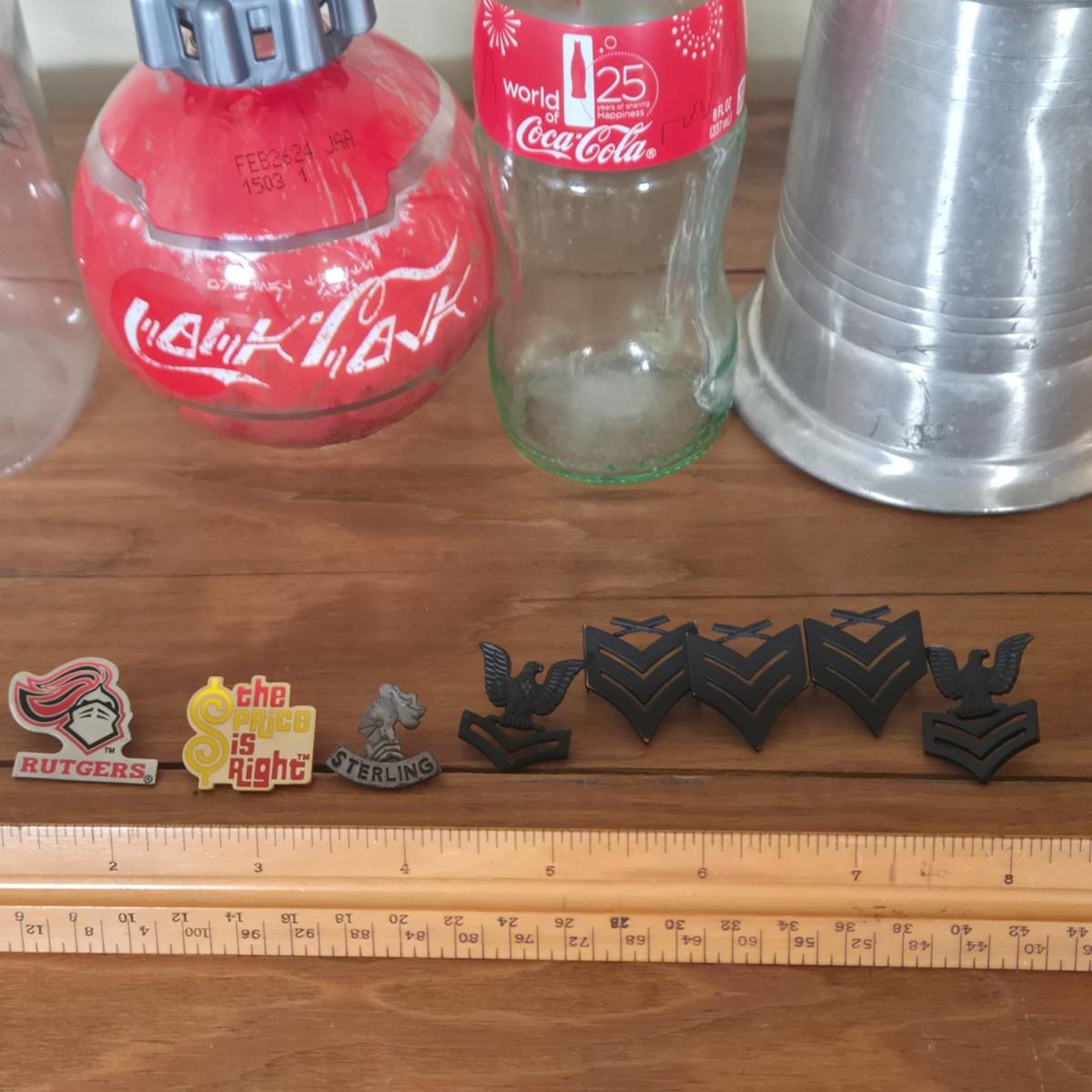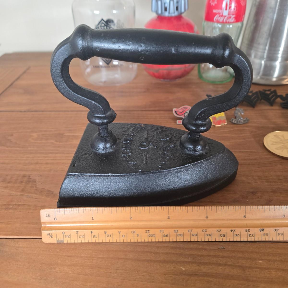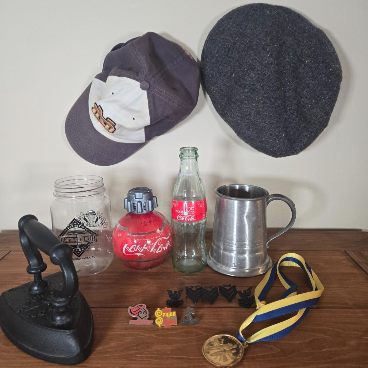 LOT 6B: Vintage Cast Iron Sad Iron, Notre Dame Baseball Cap,US Navy E-6 Petty Officer First Class Insignia, Disney Star Wars Galaxy's Edge Thermal Detonator Coca Cola Coke Bottle, and More