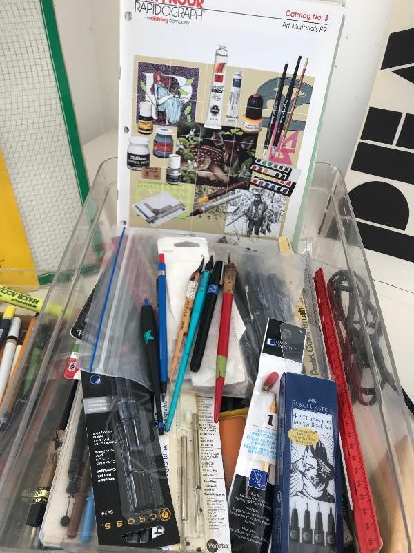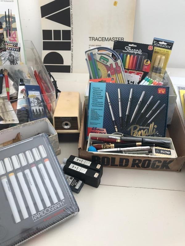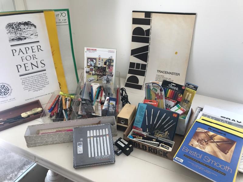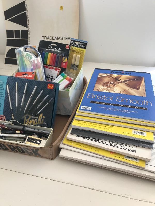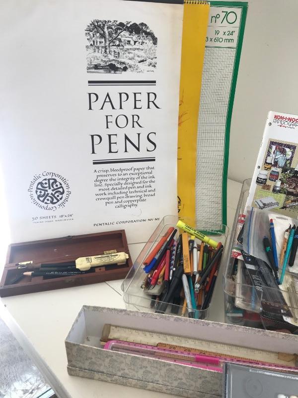 Large pads of paper for drawing and pens many different types of pens pencils measuring tools and pads of paper