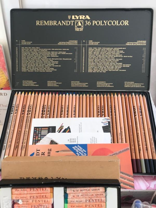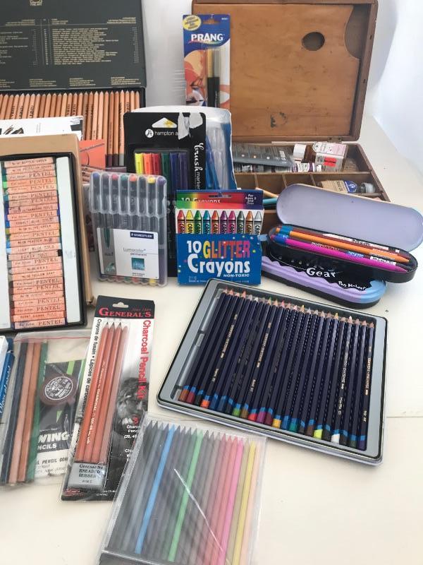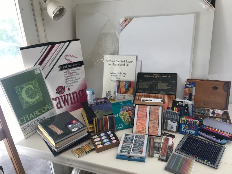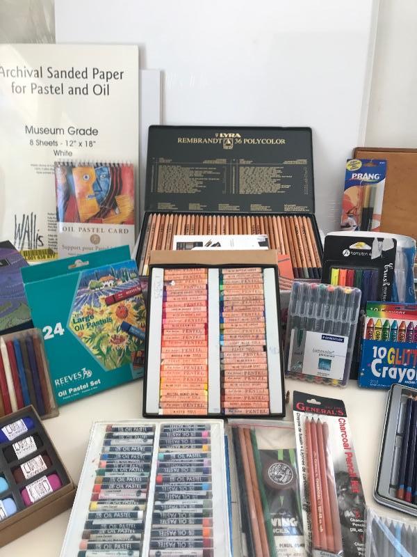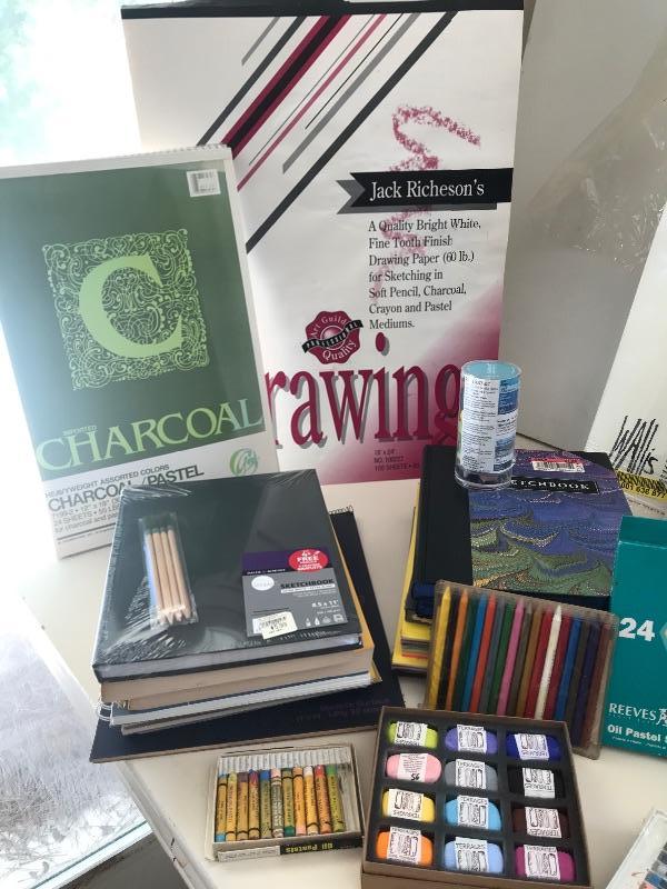 36 x 40 canvas to 24“ x 30“ cotton canvas paint boards three pastel and oil sanding paper drawing pads charcoal pastel sketchpad many different pads of different types of paper oil pastels oil pastels charcoal pencil kit Rembrandt 36 piece pencil set and more