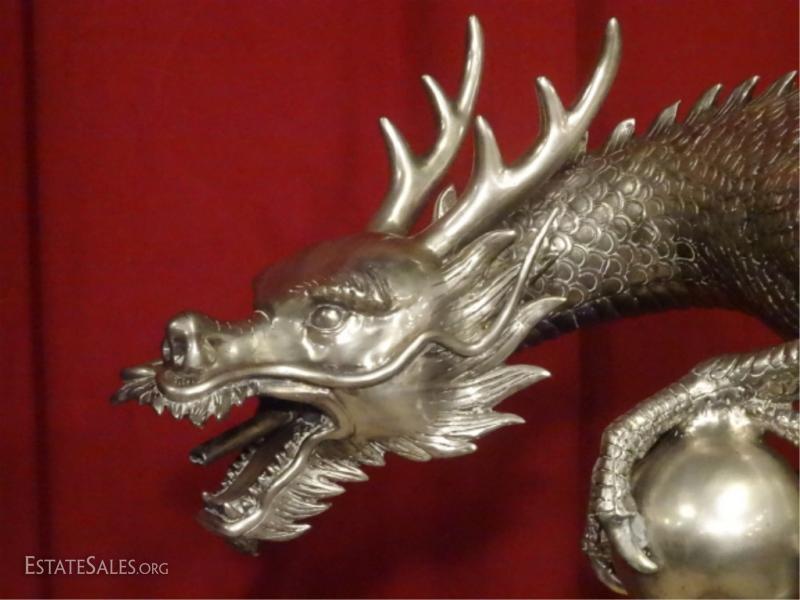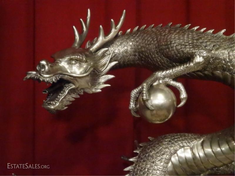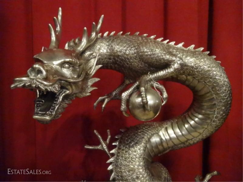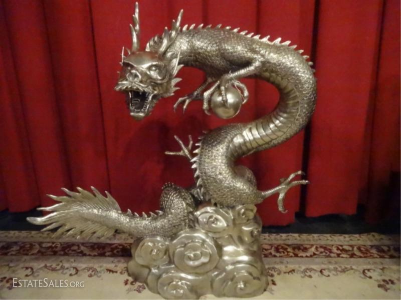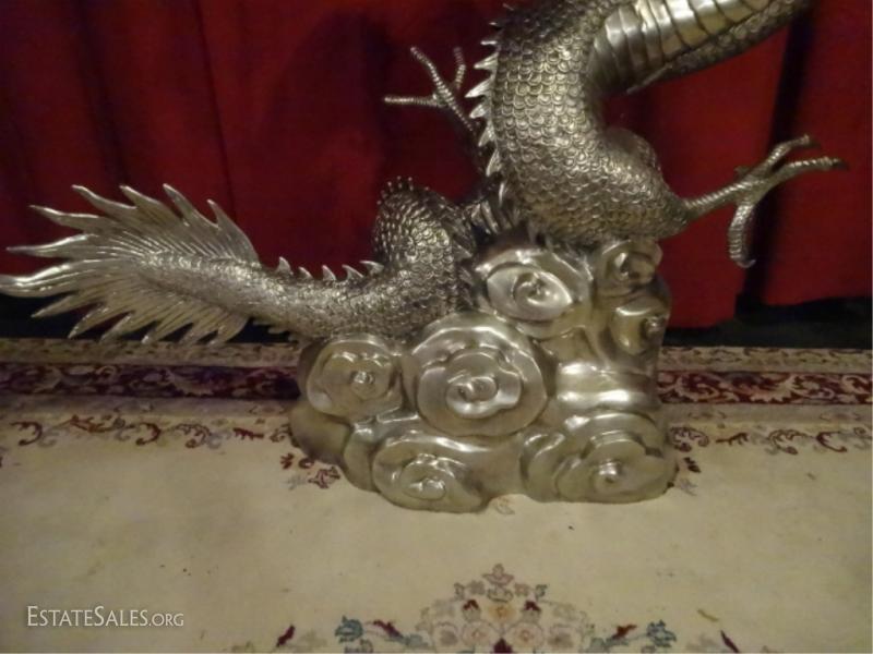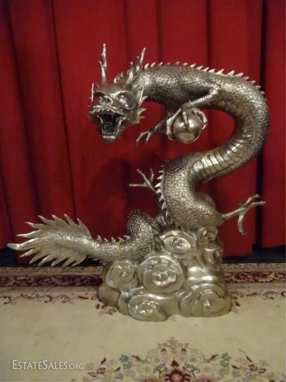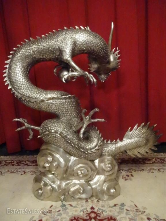 LOT 120B: HUGE SILVER PATINATED BRONZE CHINESE DRAGON SCULPTURE /FOUNTAIN