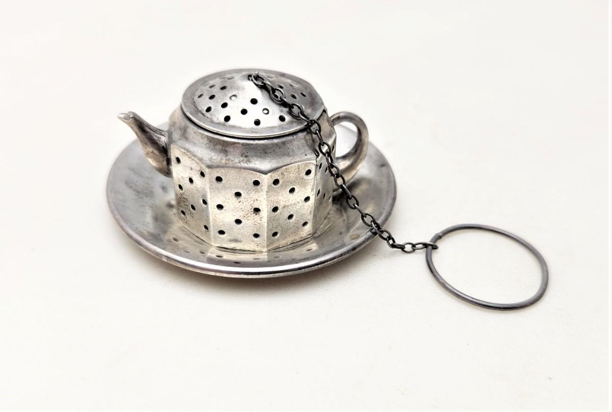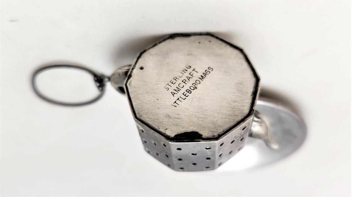 Charming little vintage sterling tea leaf strainer in the form of a teapot, with underplate. Strainer is 1/2" tall. Most of these are English, but this one was actually made by an American company.