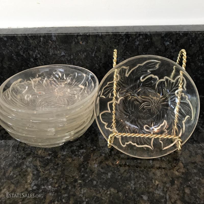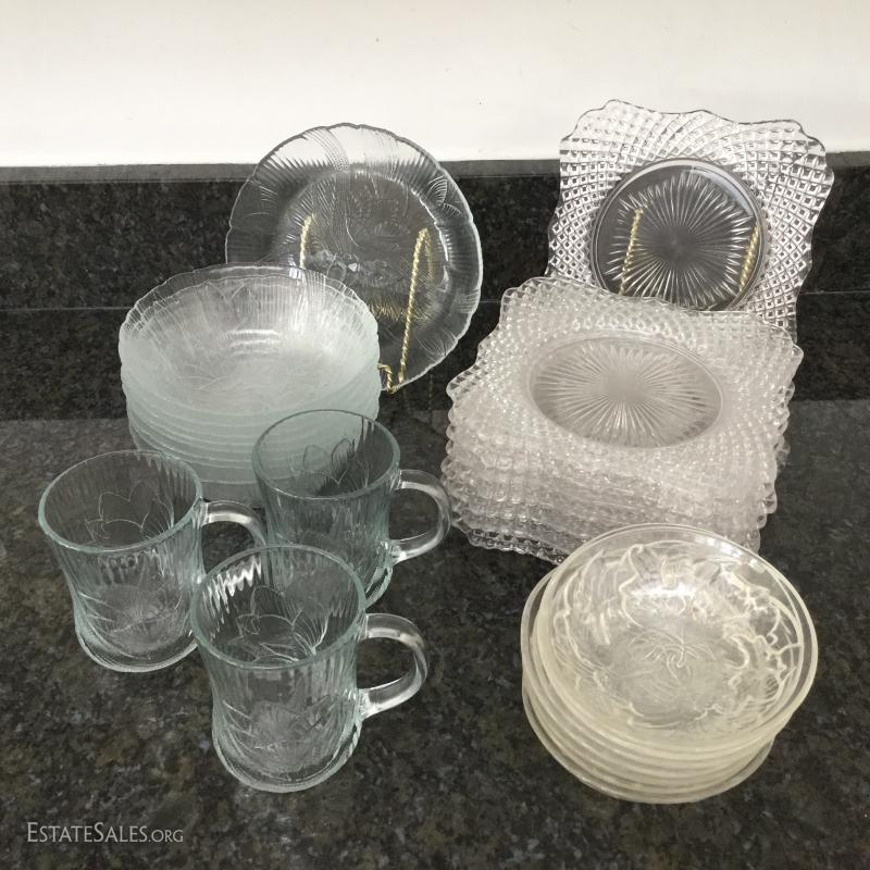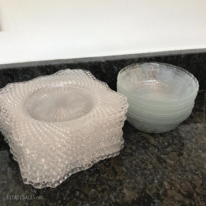Great for extra pieces in your kitchen that will match any set you have. Eight glass plates are 7.5" square. Eight bowls 6.5"d. Other misc pieces. See photos. Shipping available or local pick up in Flat Rock, NC.