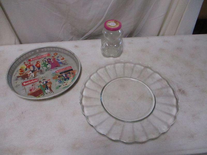 Lot 121 -  Bear Glass 32 oz Jelly Jar Kraft General Foods & Knickerbocker Beer Metal Serving Tray 12”