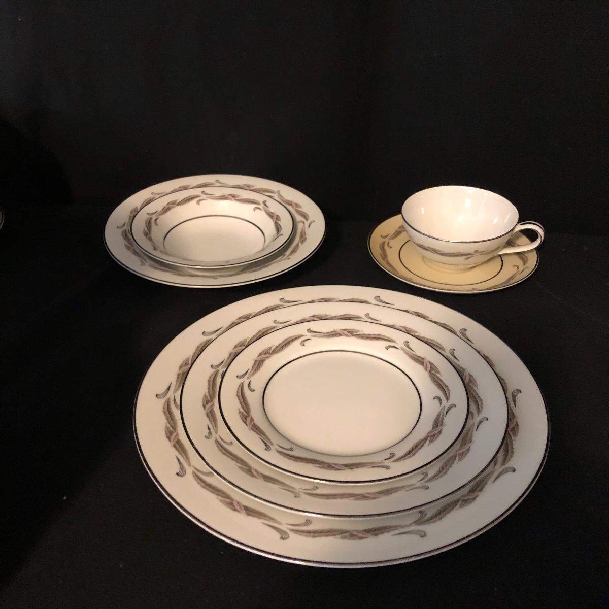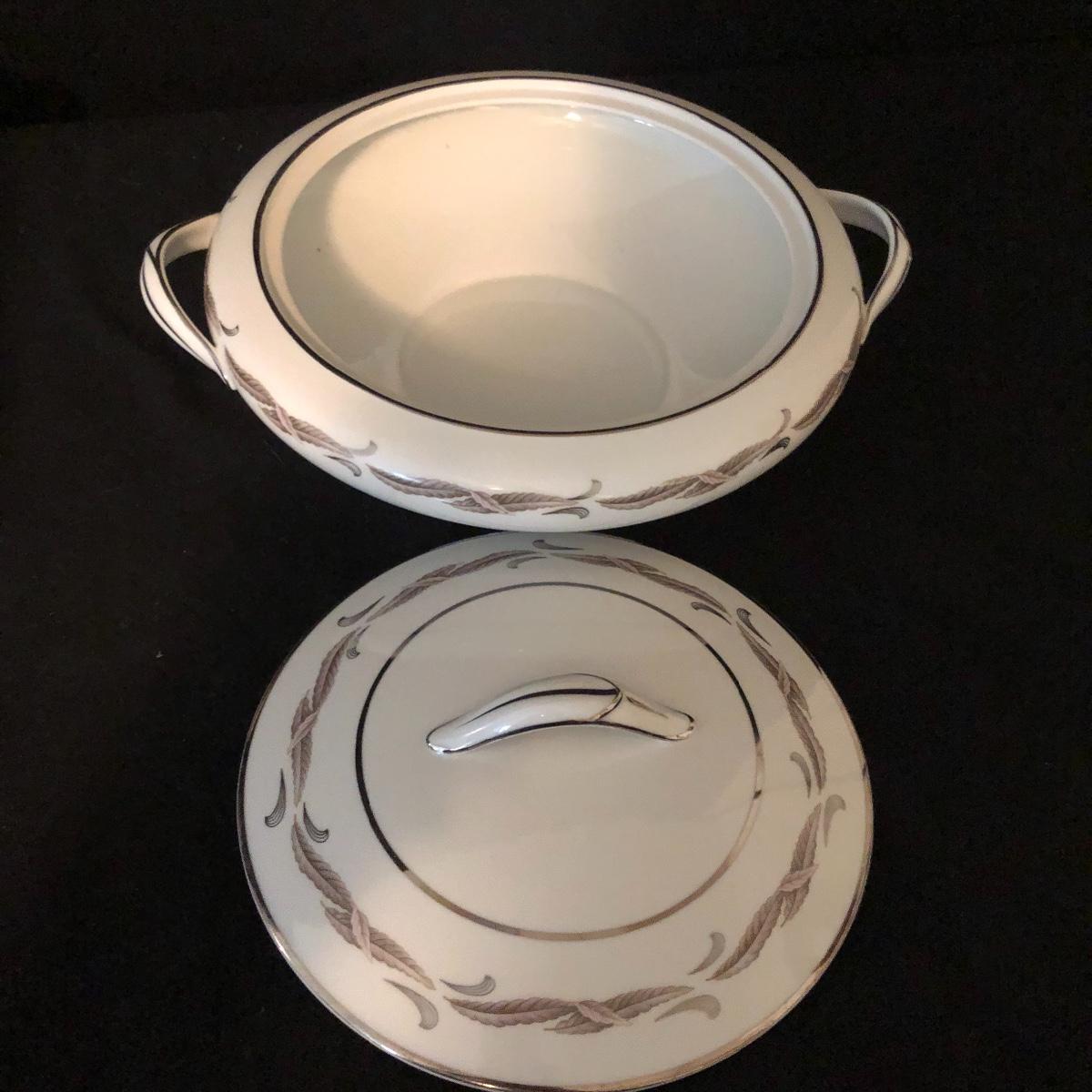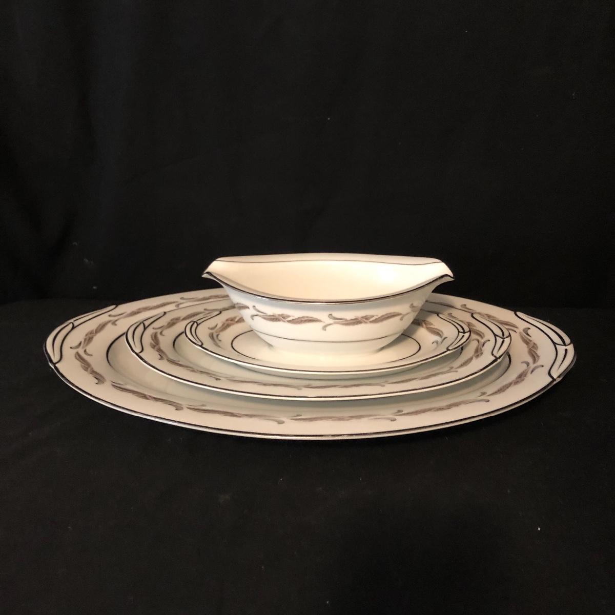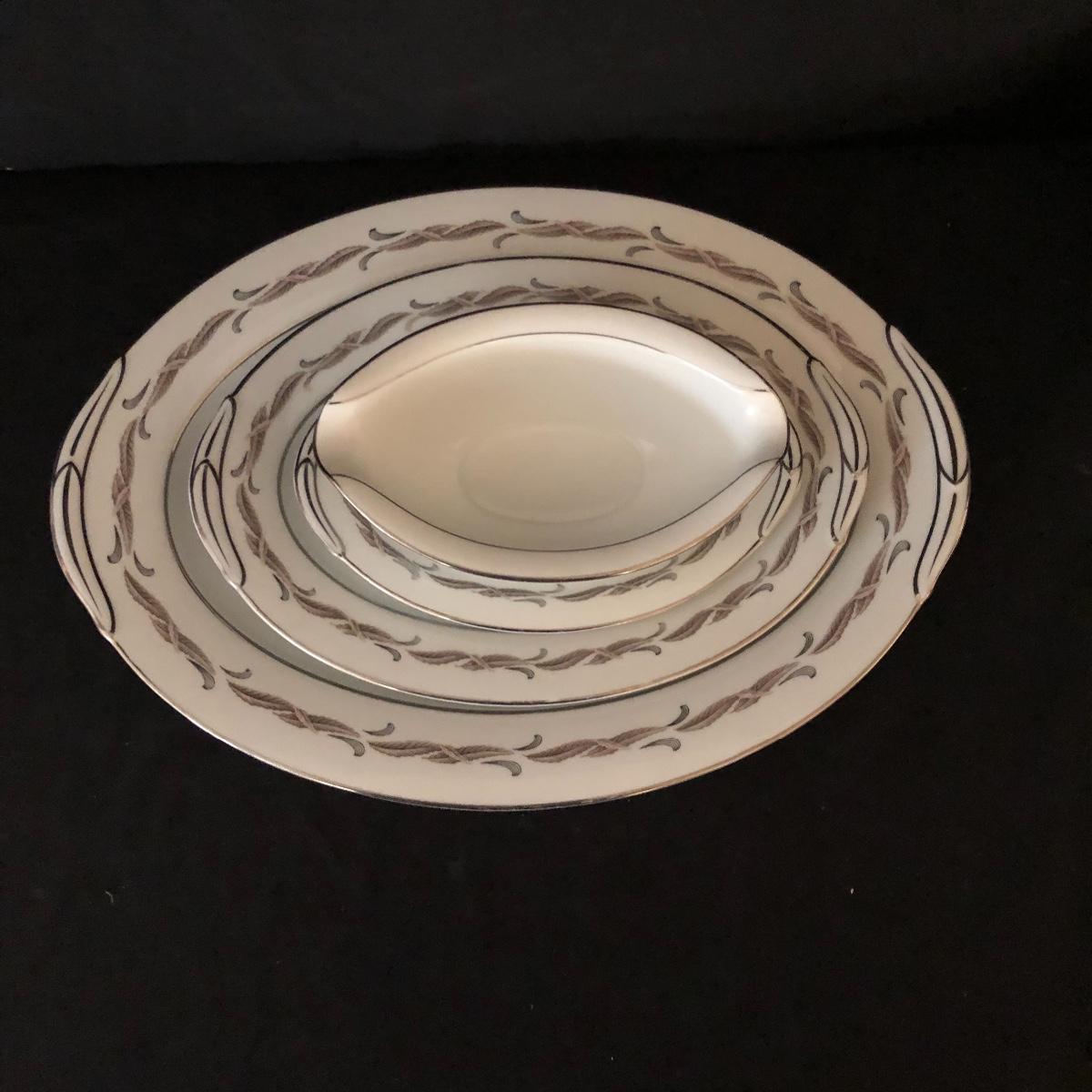 . This seven piece twelve person Noritake China set in the Gaylord pattern includes two serving platters, gravy boat, lidded dish, cream and sugar bowl. Also includes a platter and two serving bowls in the Diana pattern. Largest platter measures 11.5” x 16.5”. Local Pick Up