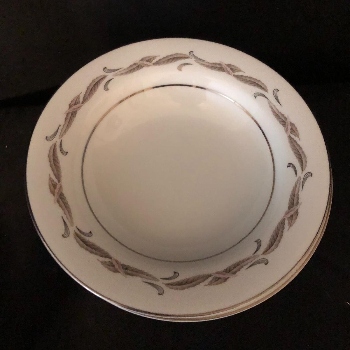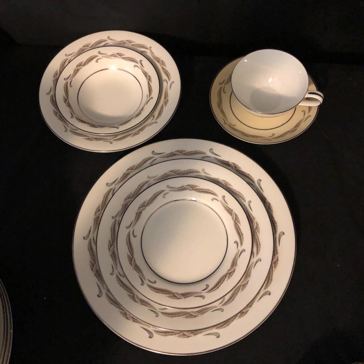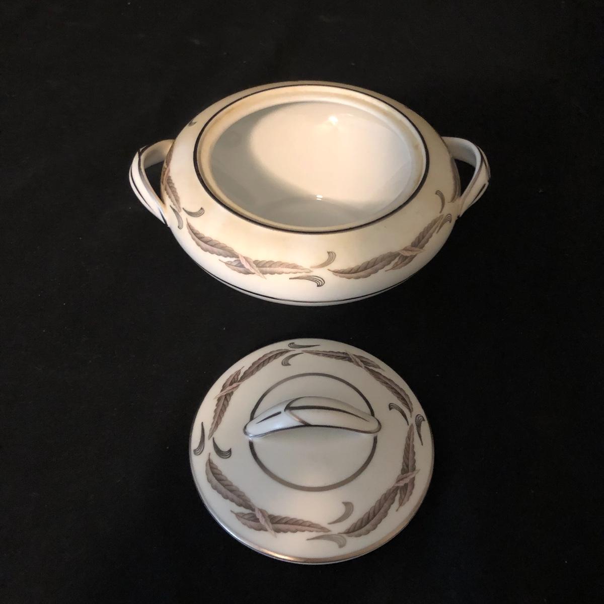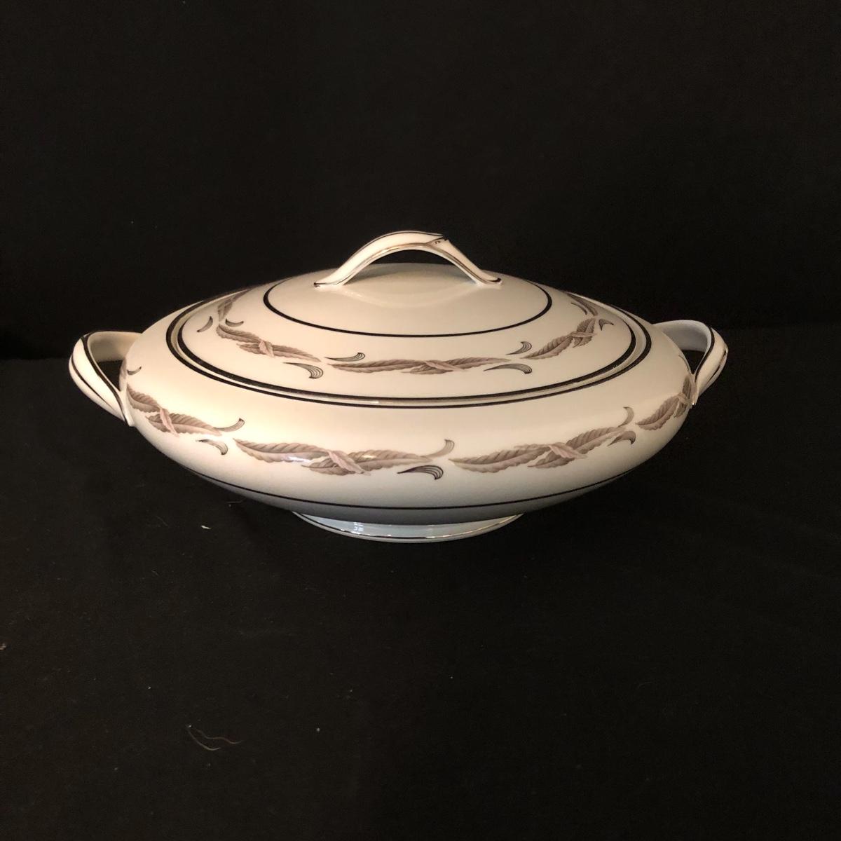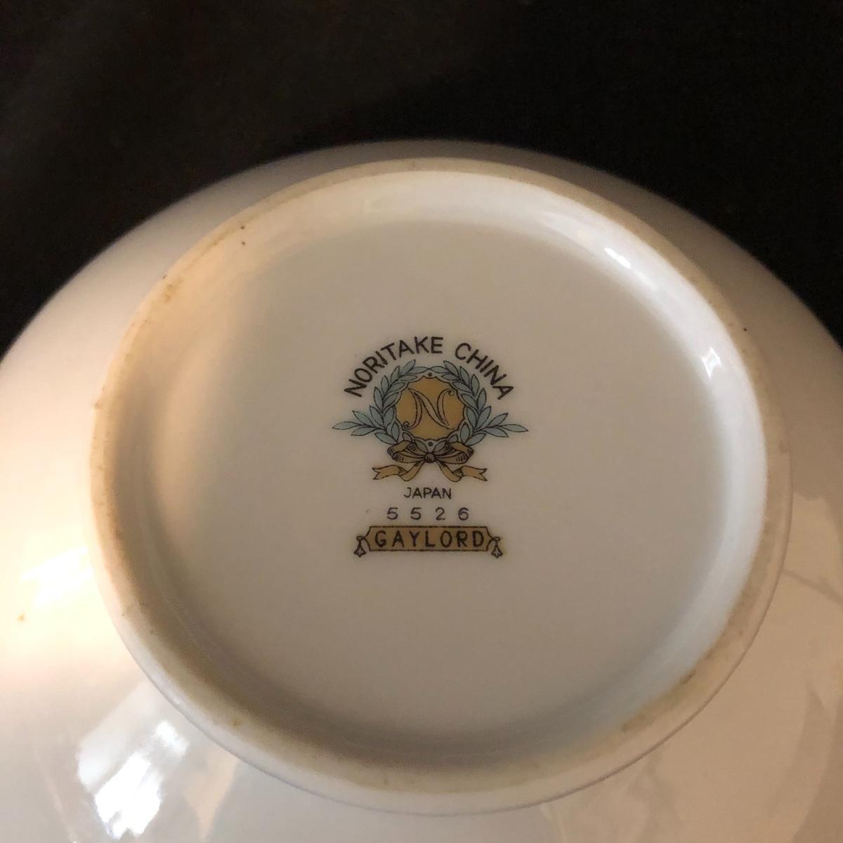 . This seven piece twelve person Noritake China set in the Gaylord pattern includes two serving platters, gravy boat, lidded dish, cream and sugar bowl. Also includes a platter and two serving bowls in the Diana pattern. Largest platter measures 11.5” x 16.5”. Local Pick Up