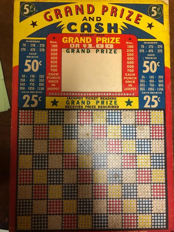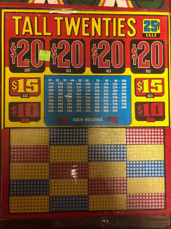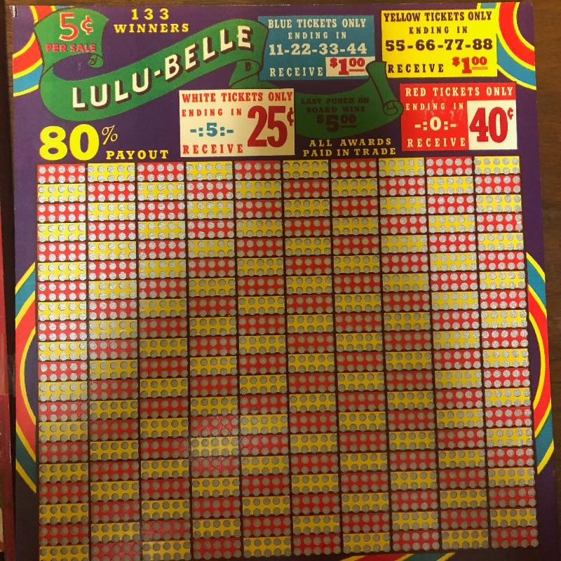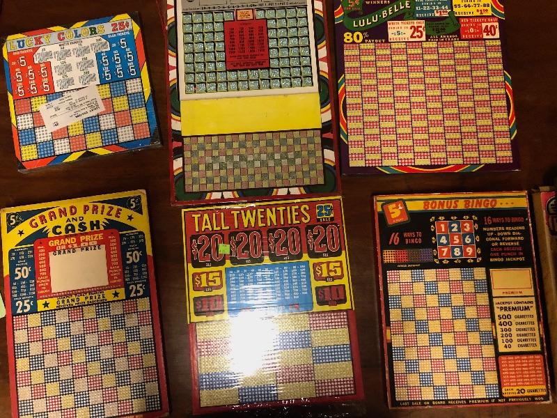 6 boards: Lucky colors (sealed), pots are plenty, Lulu Bell, bonus bingo, tall 20s (partially sealed), grand prize and cash: Vintage used condition