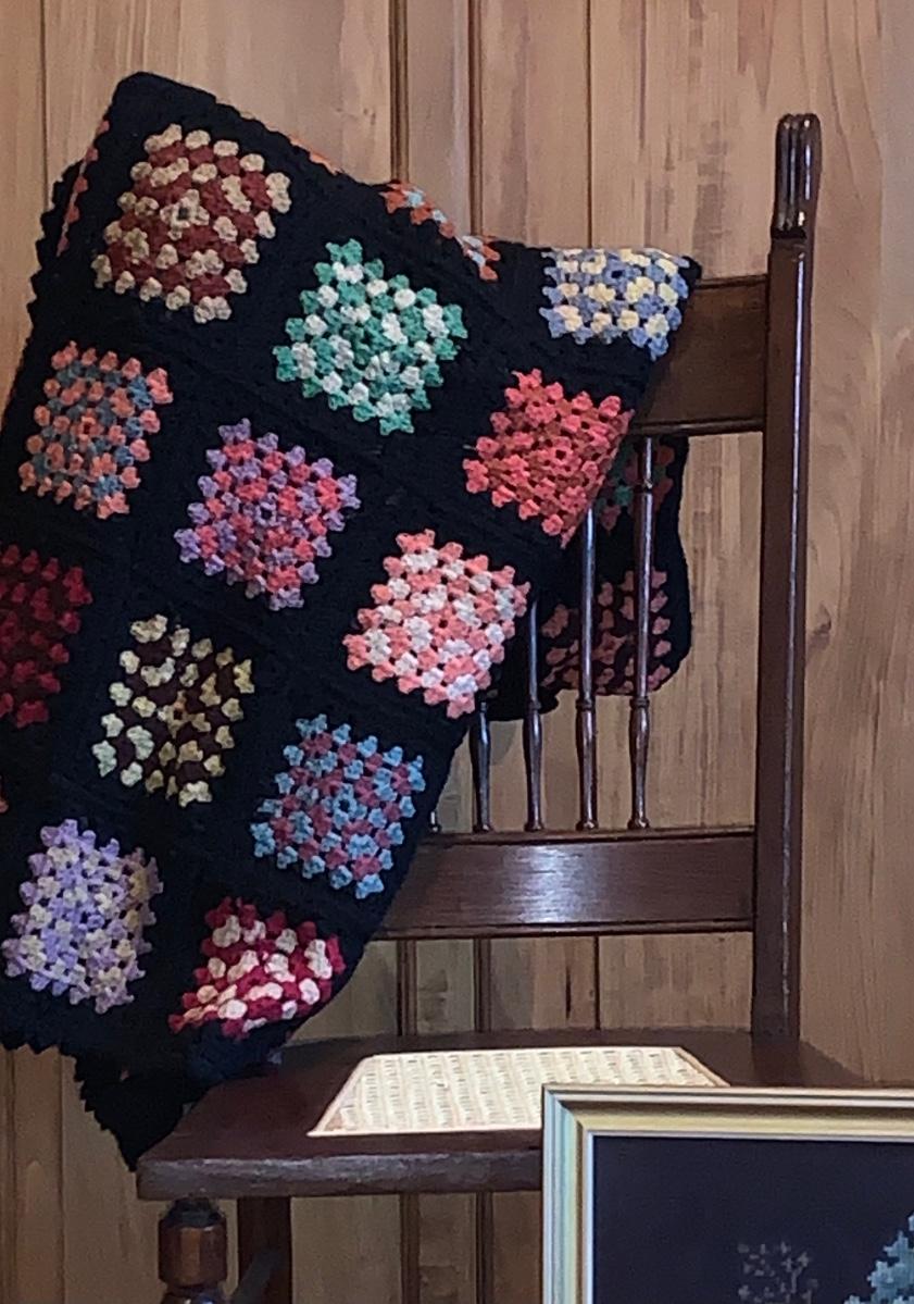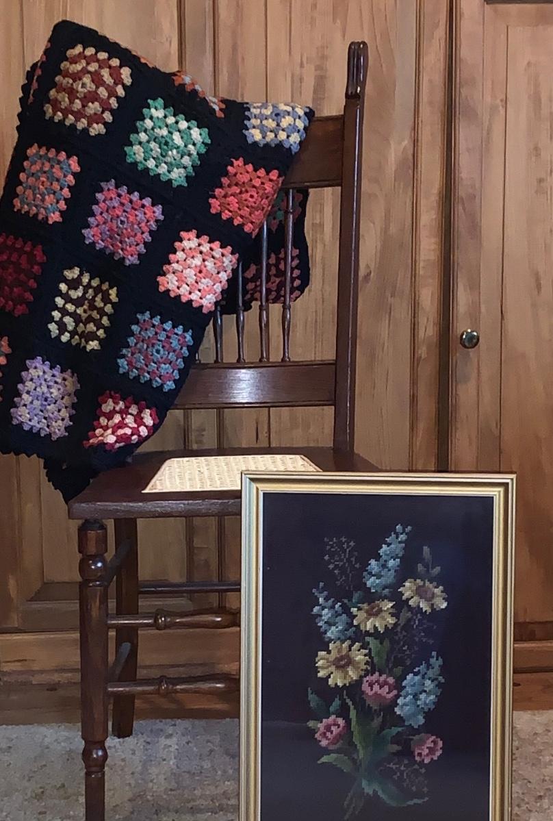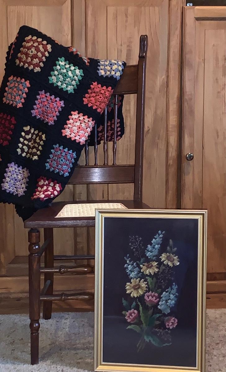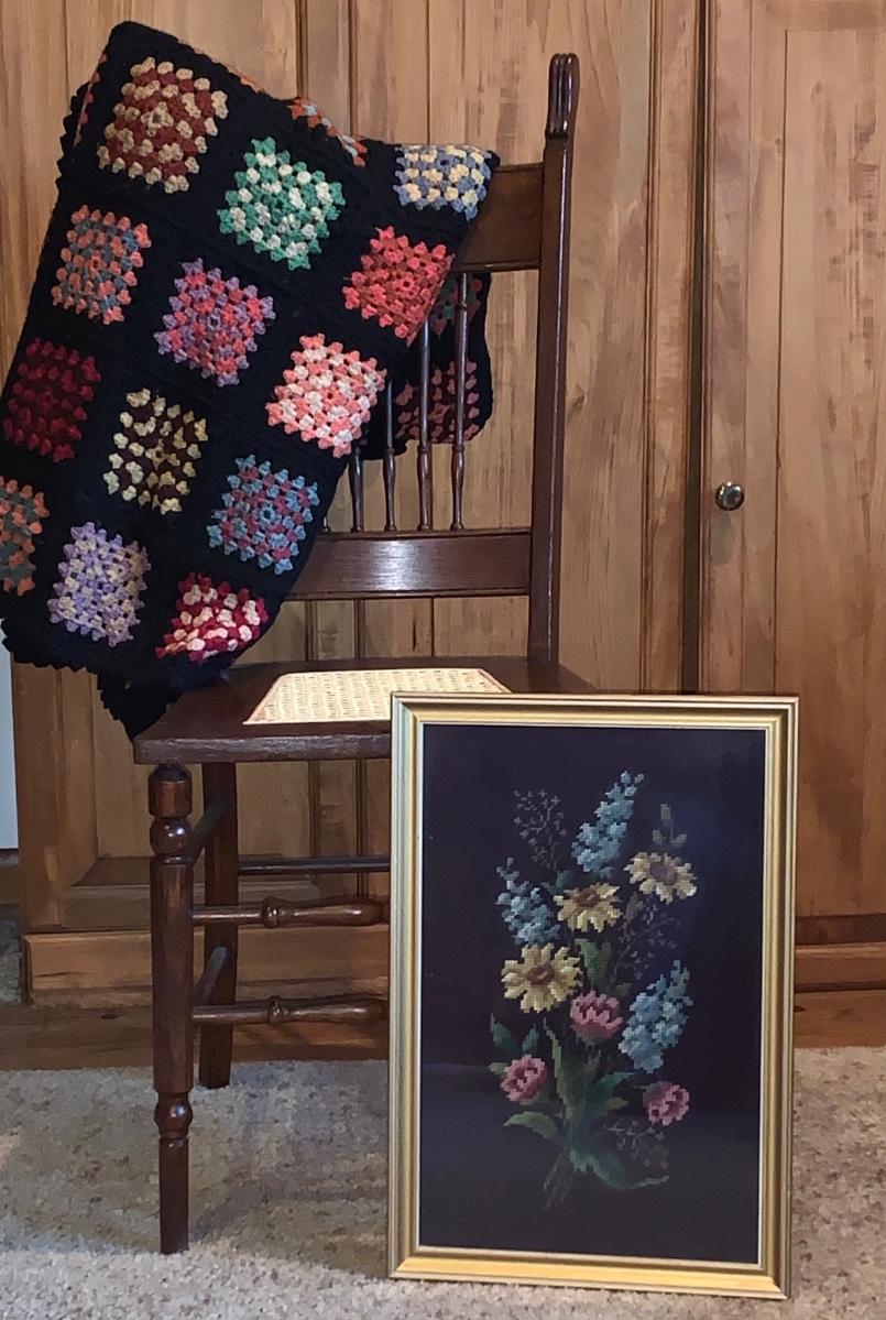 Beautiful handmade afghan along with a vintage needle point in custom framing and a chair.