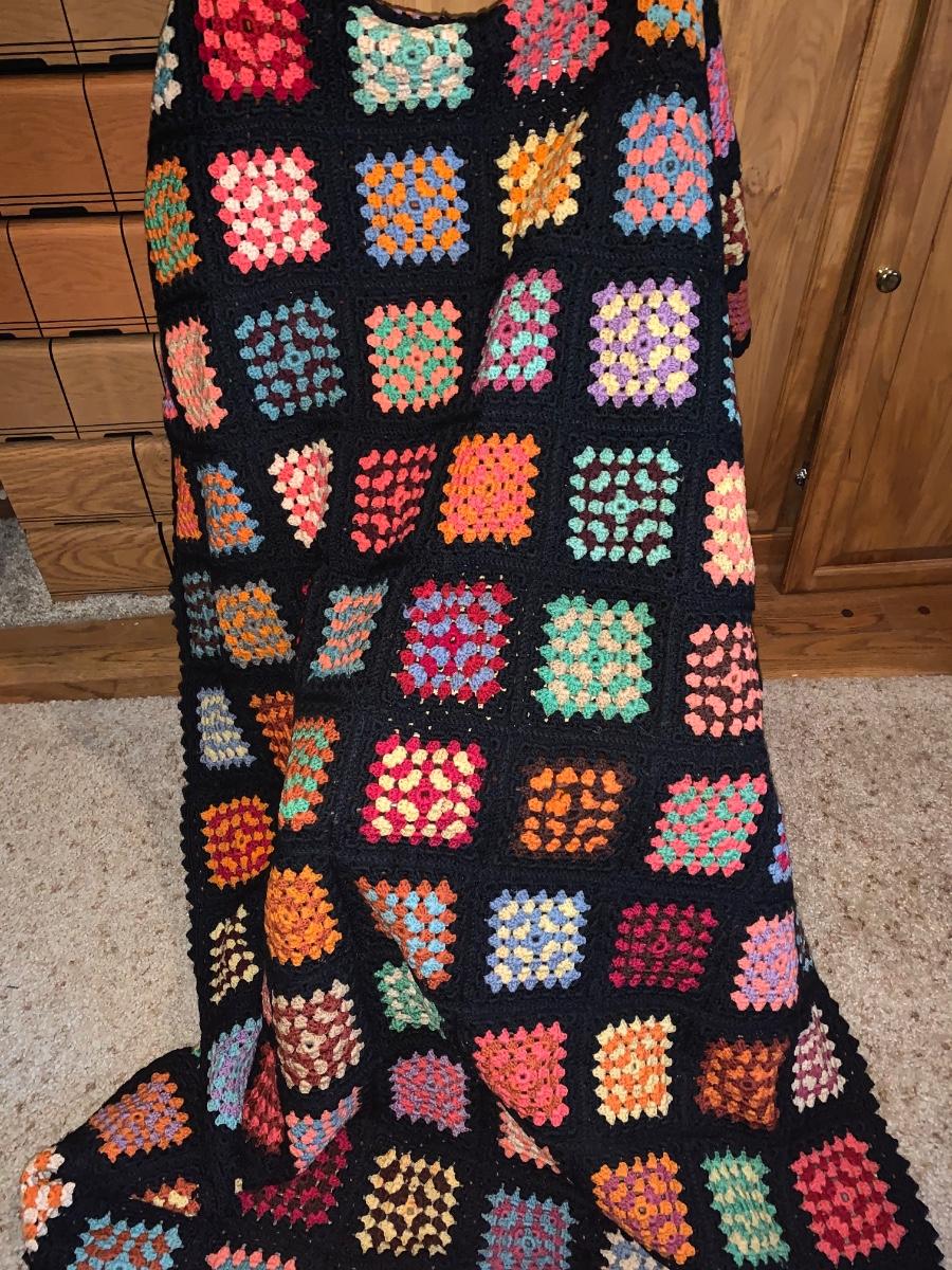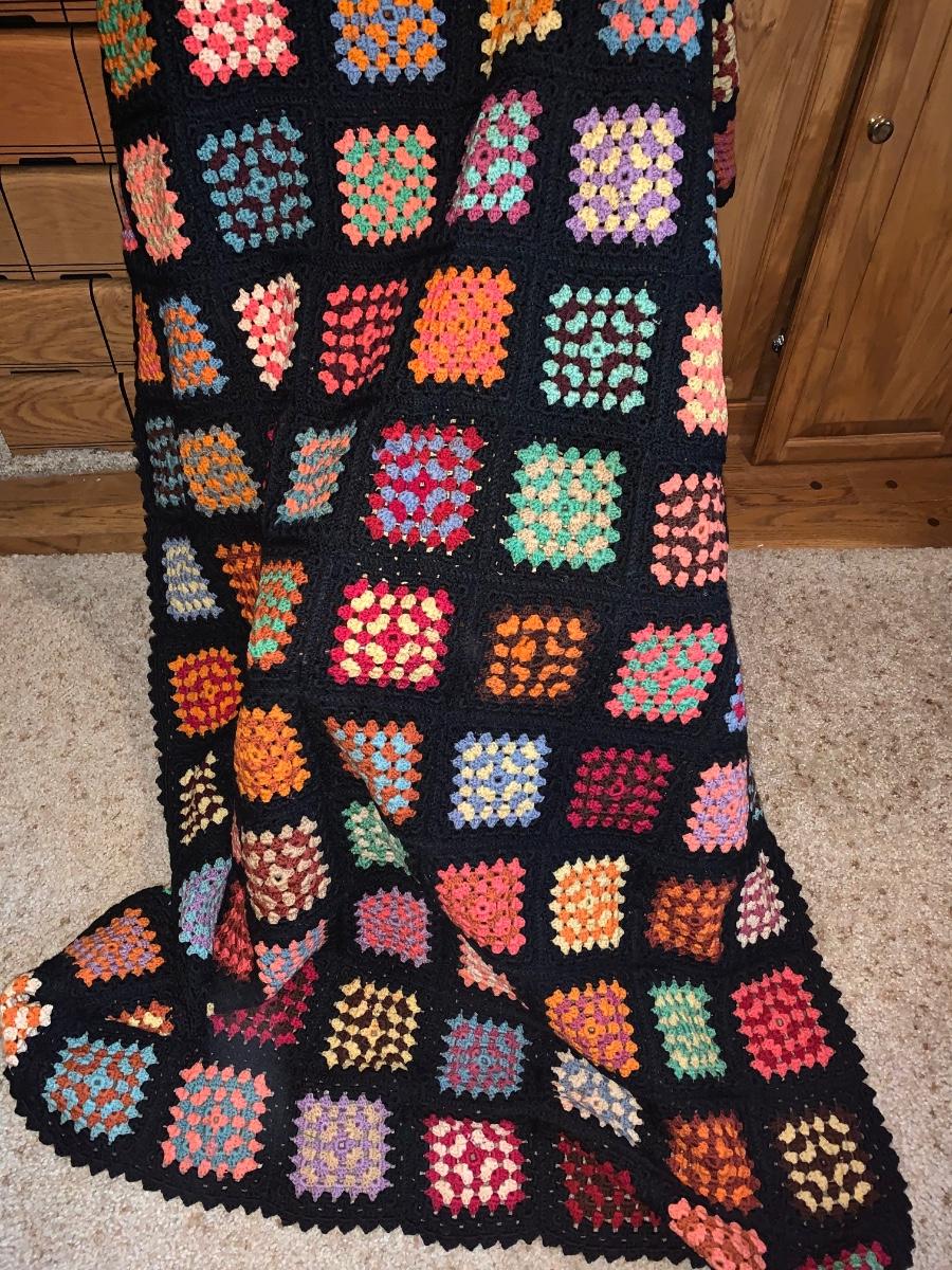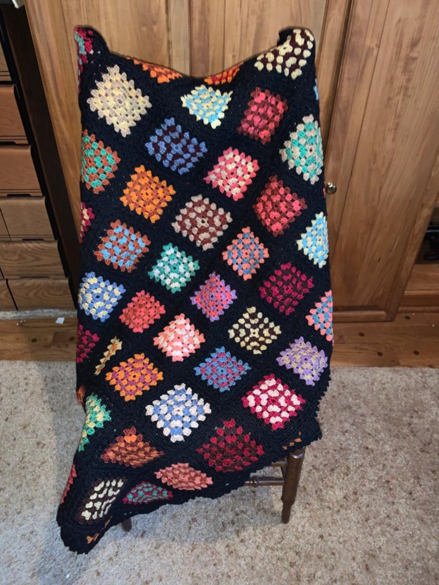 Beautiful handmade afghan along with a vintage needle point in custom framing and a chair.