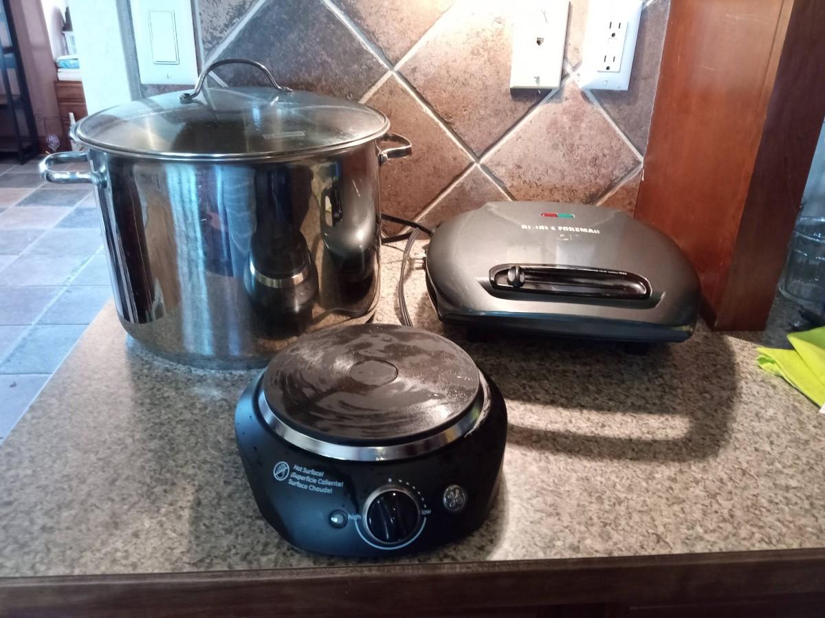 LOT 121 STOCK POT, GEORGE FOREMAN GRILL AND AN ELECTRIC HOT PLATE (HU)